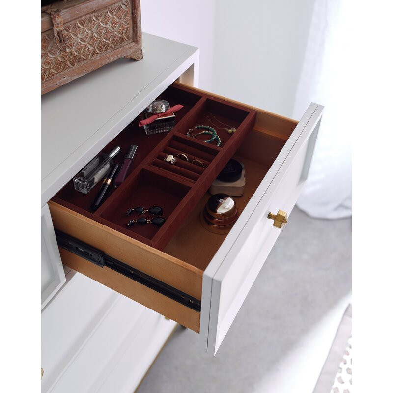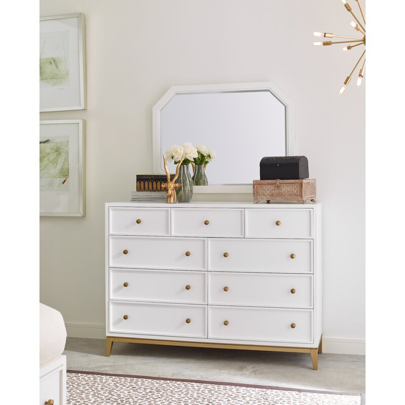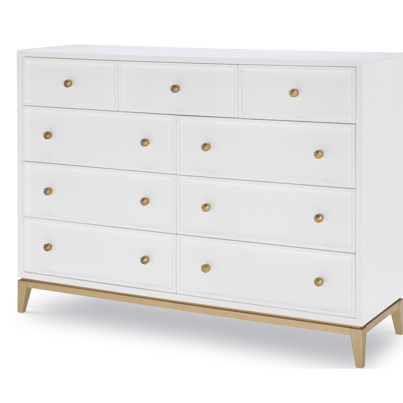 This 9-drawer double dresser features flared gold legs and clean lines for a chic look in your bedroom. The frame is made from solid and engineered wood with a crisp white finish. All 9 soft-closing dovetailed drawers roll out on metal ball-bearing glides, giving you plenty of space for storing away your wardrobe and linens. Plus, some of the drawers are felt-lined, so they're ideal for protecting delicates. Best of all, this piece arrives fully assembled, so all you have to do is put that laundry away. A wall anchor is included for added safety.Not Included:Dresser Mirror