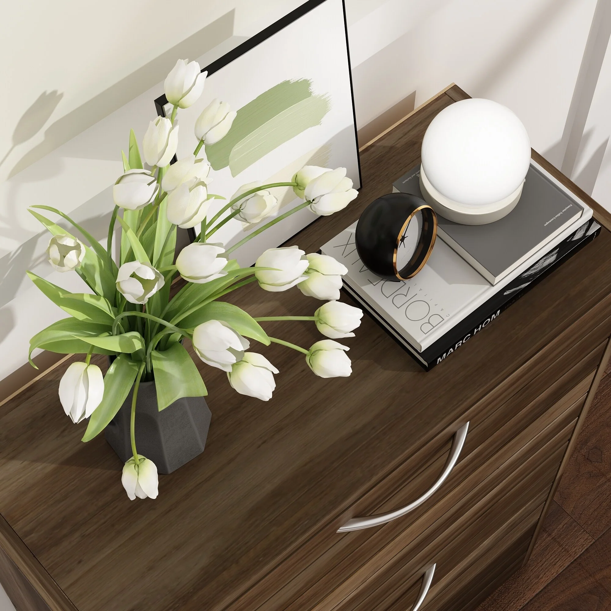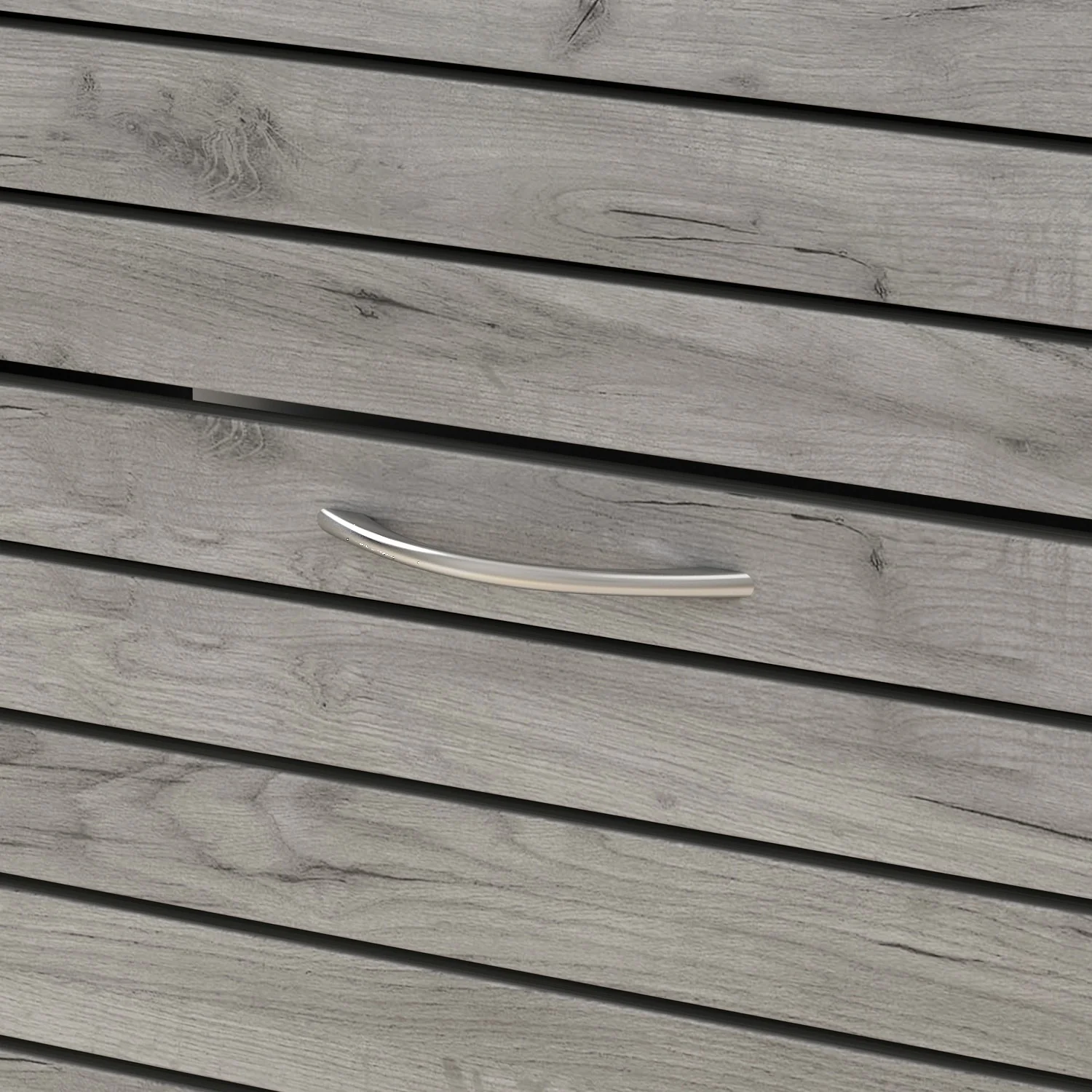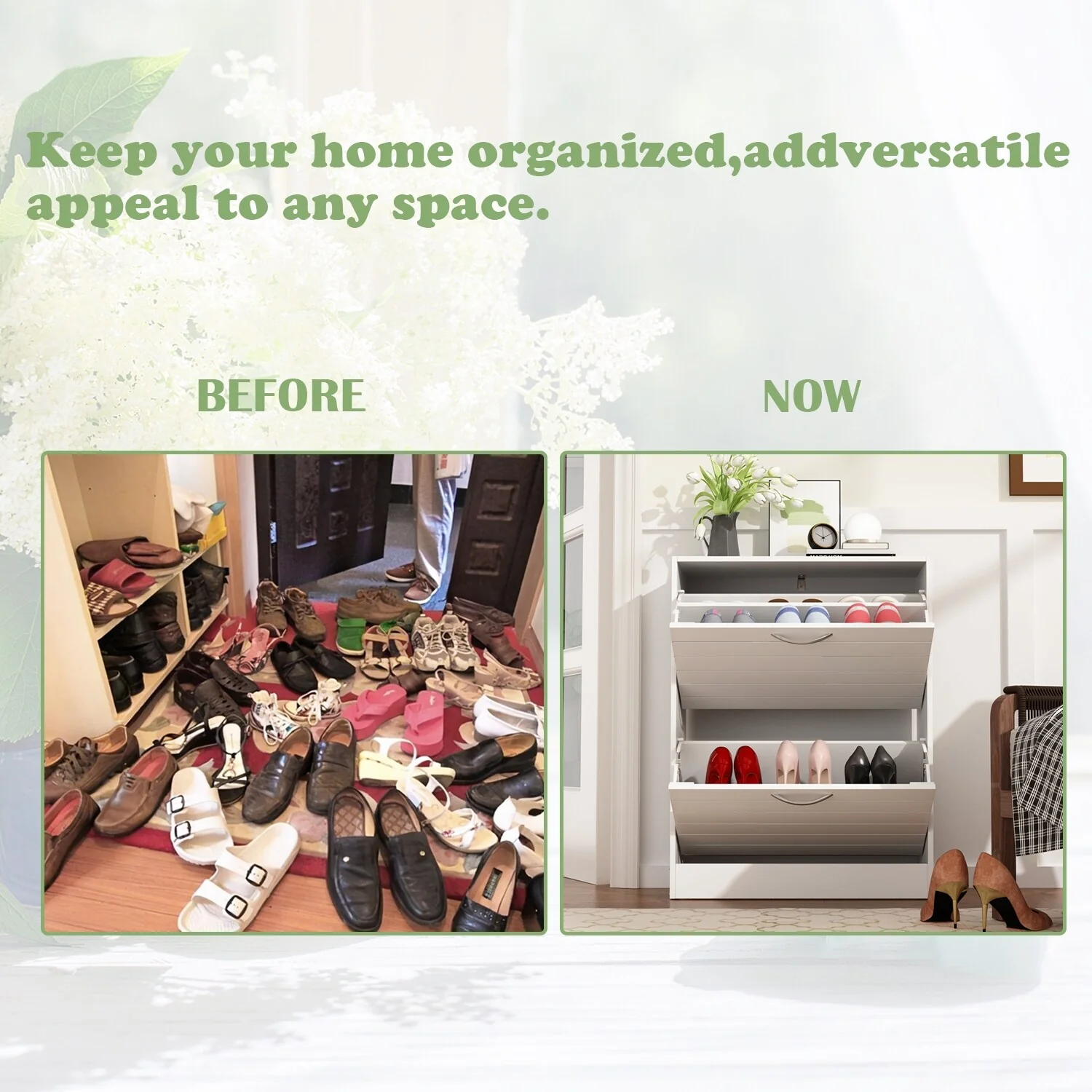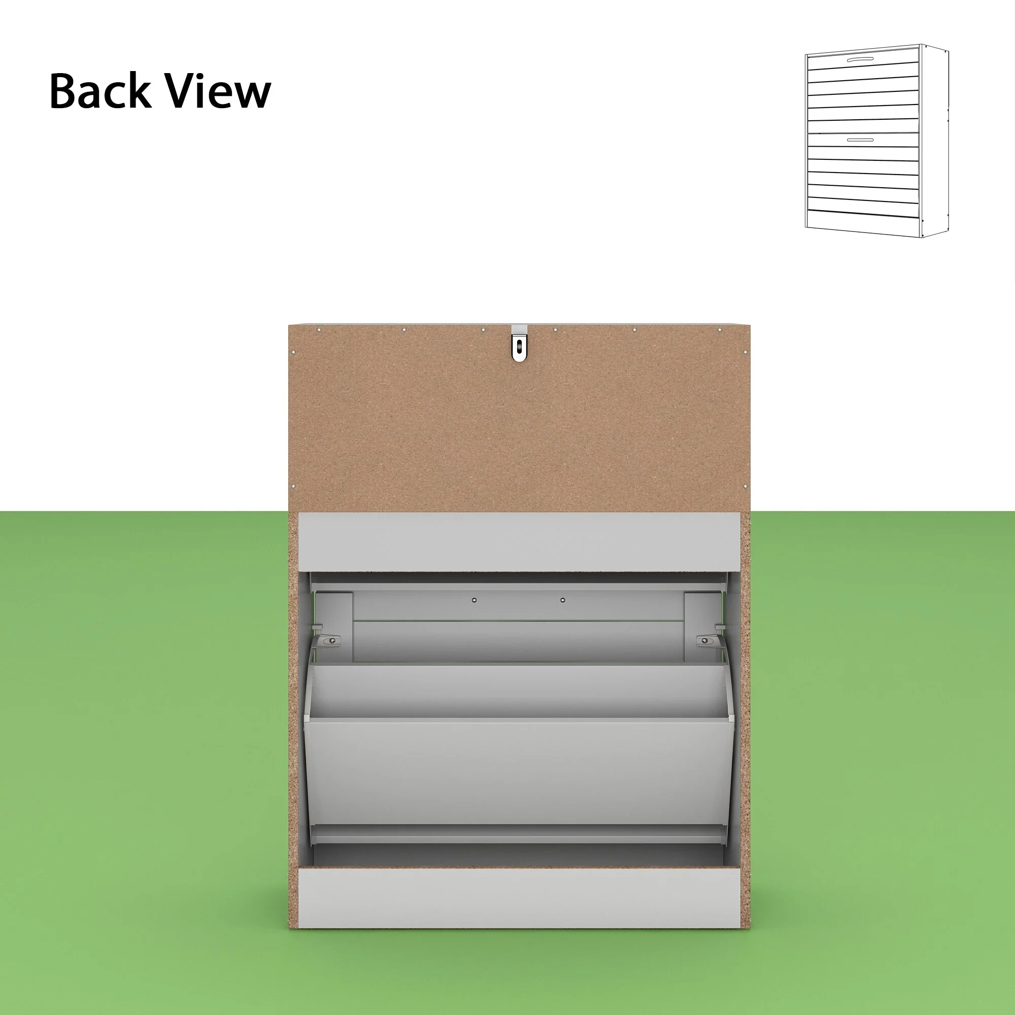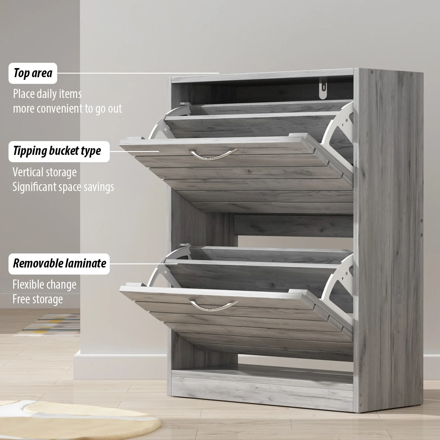 Keep your shoe collection organized and easily accessible with this modern shoe storage cabinet. Its tipping bucket design provides ample storage space with two drawers, each containing two shelves for hiding away your shoes. The metal handles are durable and easy to use, while the medium-density fiberboard construction ensures longevity. This shoe cabinet is perfect for narrow spaces in the bedroom, hallway, or corridor and can even be used to store small objects on its spacious platform.