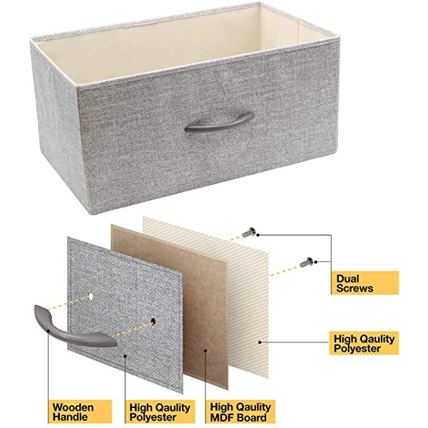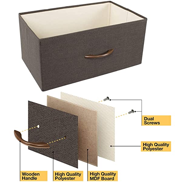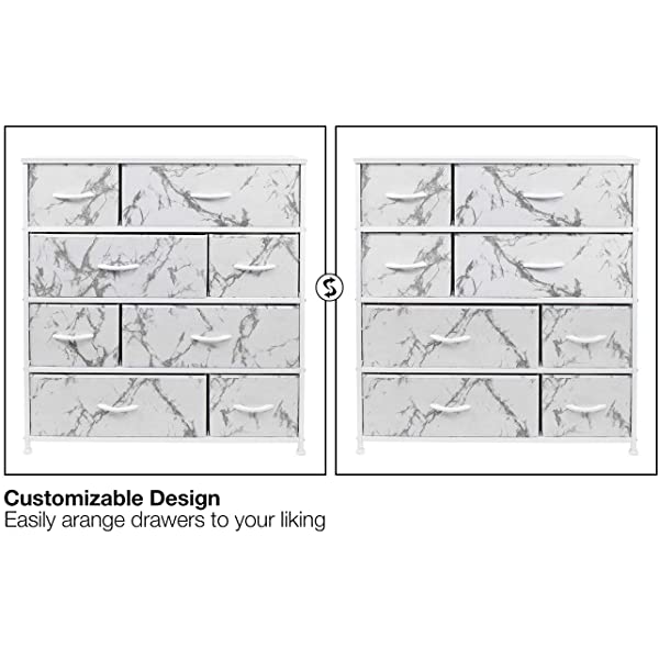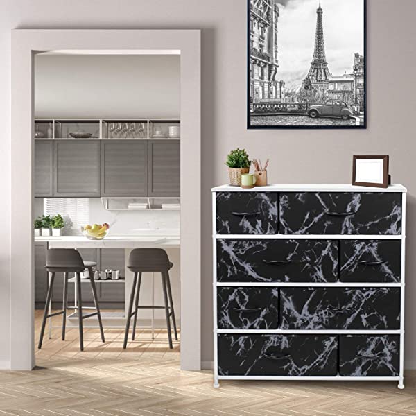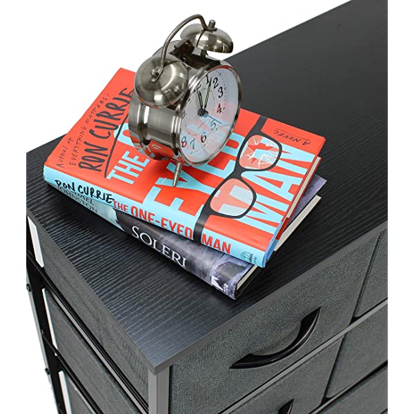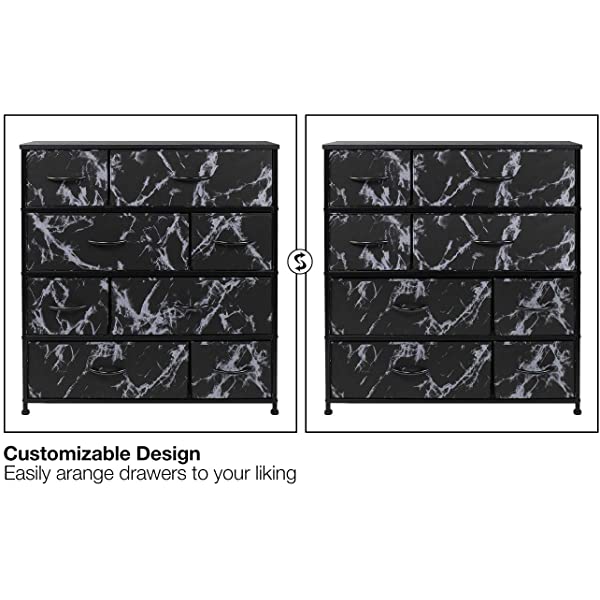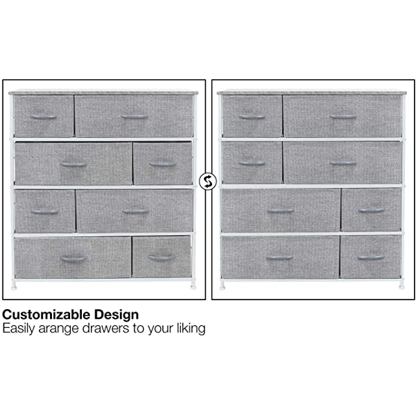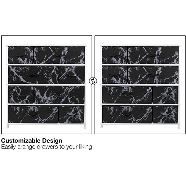 SMART & STYLISH DESIGN — Made with strong steel frame and durable MDF wood top with smooth finish — Drawers made of breathable, non-woven fabric — Wipe clean — Minimal assembly required — Hardware and instructions INCLUDED — Measures approximately 34” L x 11.5” W x 36” H. REMOVABLE & FOLDABLE DRAWERS — Soft fabric drawers with reinforced base — Easy pull handle for quiet opening and closing — Removable Drawers fold flat for easy storage when not in use — Entire unit is portable, lightweight, and easy to relocate to different spaces — Each drawer approx. 8.25” deep. FOR HOME, OFFICE, DORM — Suitable for bedroom, living room dresser, guest room, closet, nursery, hallway, college dorm, small apartment solutions, etc — Can be used as dressers for bedroom, storage cube dresser, 5 drawer dresser, small closet dresser, storage chest, living room dresser, sofa end tables, office supply storage, kids nightstand, or baby nursery table — Complements most décor whether traditional, rustic, or modern. DISPLAY & DE-CLUTTER — Wood top provides hard surface for displaying lamps, alarm clocks, books, eyeglasses, charging station, and more — Drawers great for storing clothes, blankets, linens, baby clothes, lingerie, purses, scarves, socks, accessories, gadgets, toiletries, cosmetics, hair/beauty products, paperwork, toys, knitting supplies, and household clutter. 8-DRAWER DRESSER (BLACK) — Style meets function with our dresser chest, complete with a wood surface and storage drawers — Pairs beautifully with the Sorbus Foldable Furniture Collection.