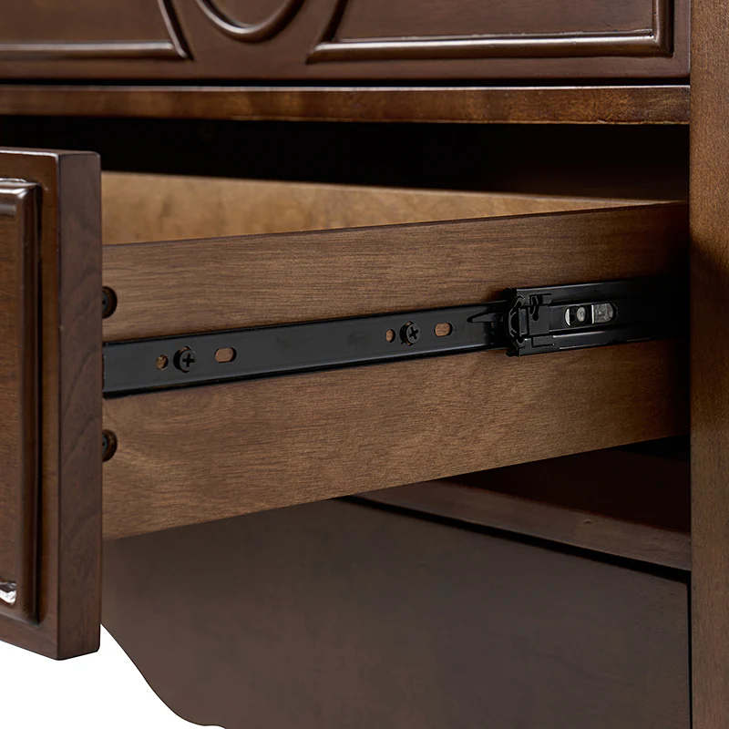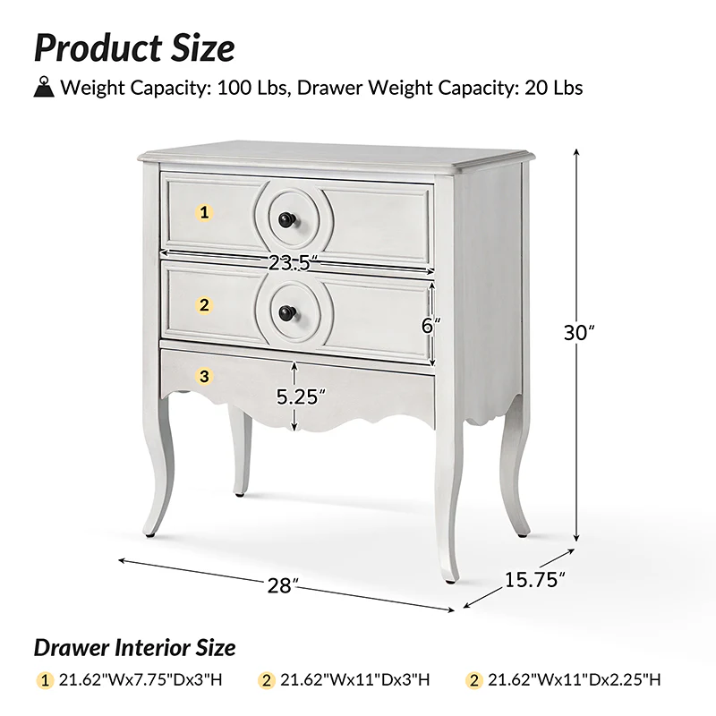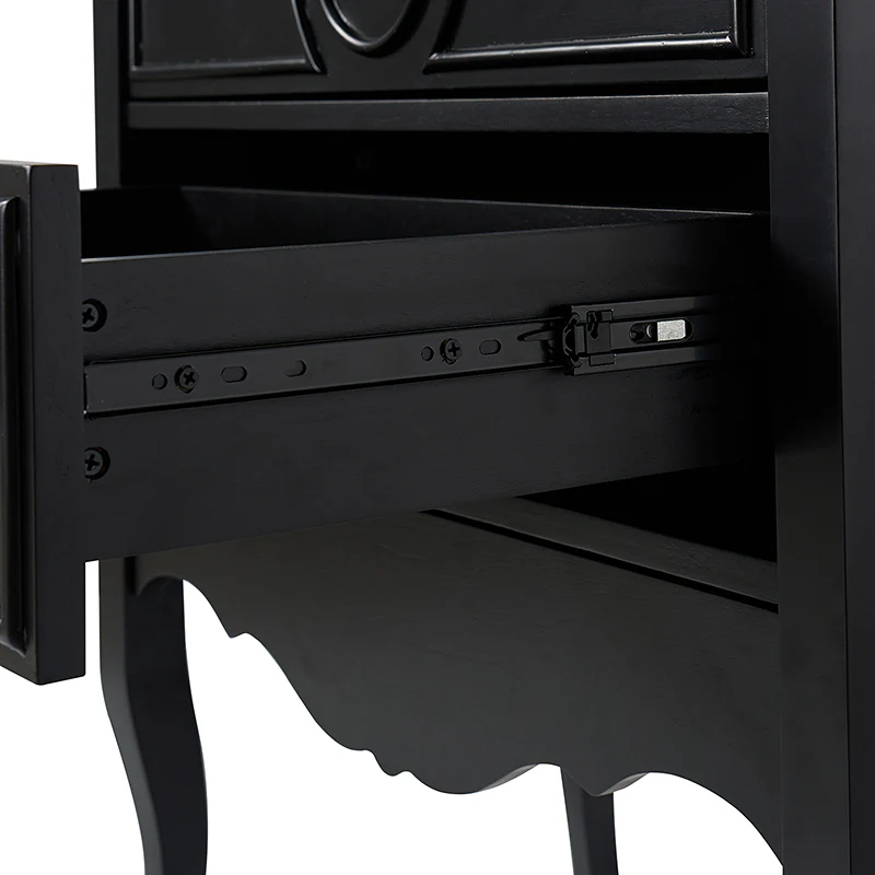 The classic nightstand with a hidden drawer is a blend of classic elegance and functionality. Its design features two visible drawers and a discreetly hidden drawer, providing ample storage space while maintaining a sleek appearance. The top drawer comes with a built-in charging station, offering convenient access to power your devices while keeping them organized. With its classical exterior and high legs, this nightstand exudes timeless charm and sophistication. The wooden trim detail creates a visually appealing framework, adding to its overall aesthetic. Additionally, the adjustable feet ensure stability and durable. This nightstand seamlessly combines traditional craftsmanship with mid-century practicality, making it a perfect addition to any bedroom setting.