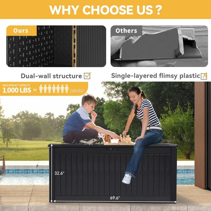 【Extra Large Storage Capacity】- This outdoor deck box offers a spacious 260-gallon capacity, perfect for storing patio furniture cushions, pool accessories, and garden tools. Ideal for both indoor and outdoor use, it keeps your space organized and clutter-free.