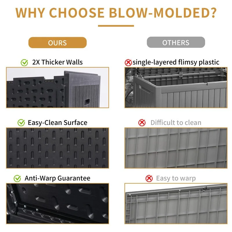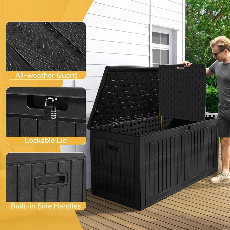 【Durable Weather-Resistant Design】- Crafted from high-quality, weather-resistant resin, this deck box features a double-layer cover design and solid structure, including a reinforced bottom plate and ribs. It withstands various weather conditions while maintaining its appearance, making it a perfect addition to any garden, backyard, or patio.