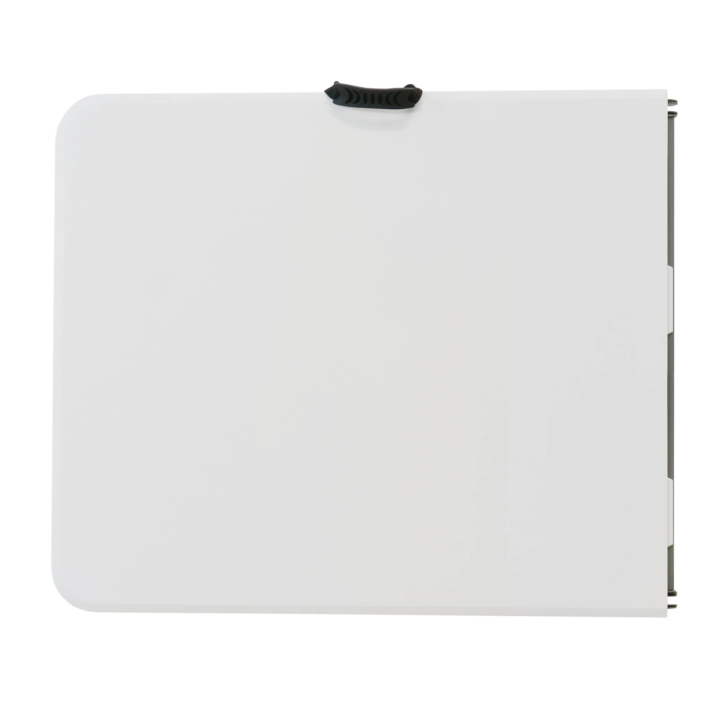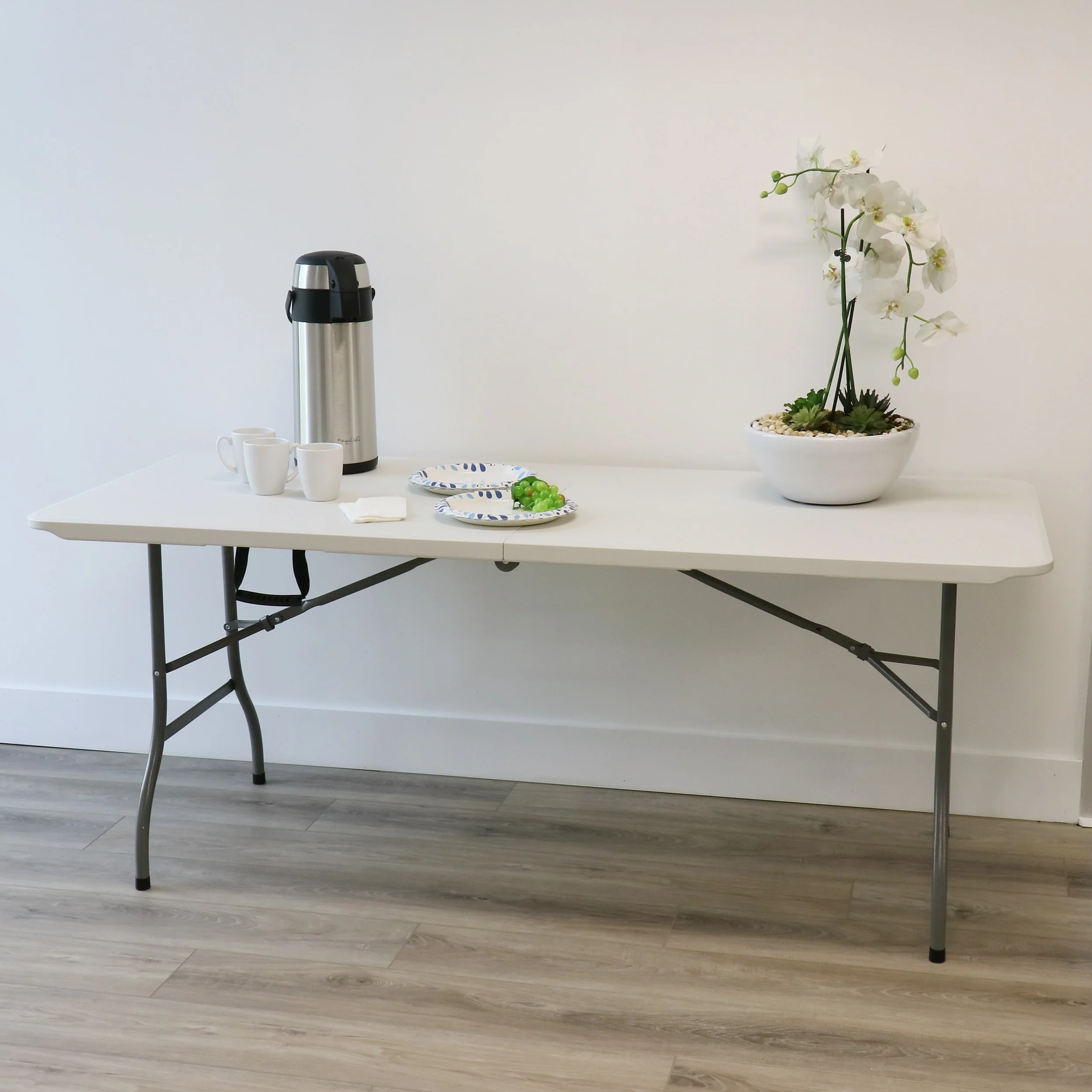 Be ready for any occasion with this Elama 6 Foot Plastic Folding Table in White. Pop out this table at anytime, easily fold it out for quick use. Nonslip feet won't scratch your floors or patio while keeping the table in place. The plastic material with metal legs is a breeze to clean up, perfect for serving food and using outside. When you're done, simply pull the ring located on the inside leg and fold it flat to store it away for next time. Invite friends and family over for a nice lunch or dinner party, or break out some board games for a fun game night!