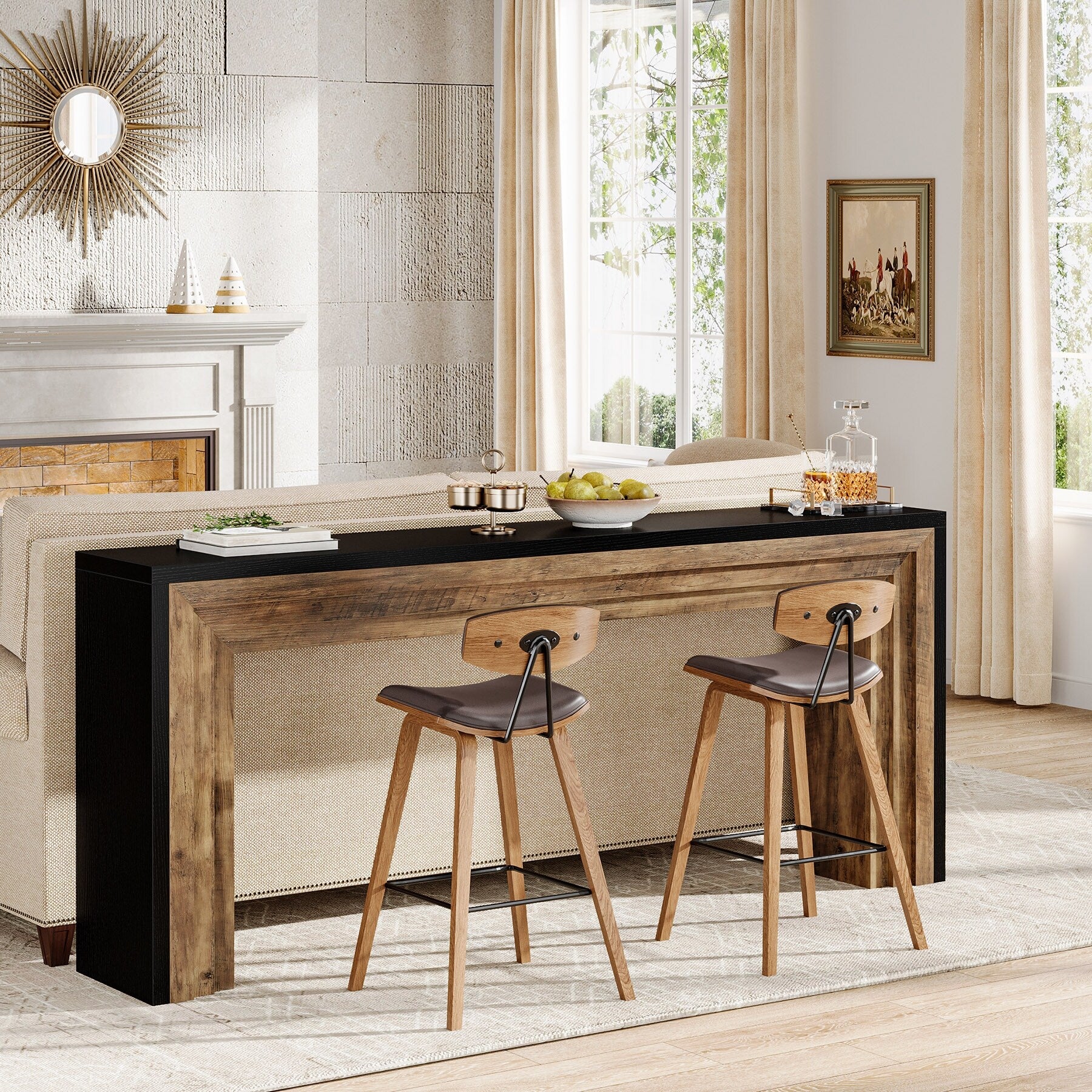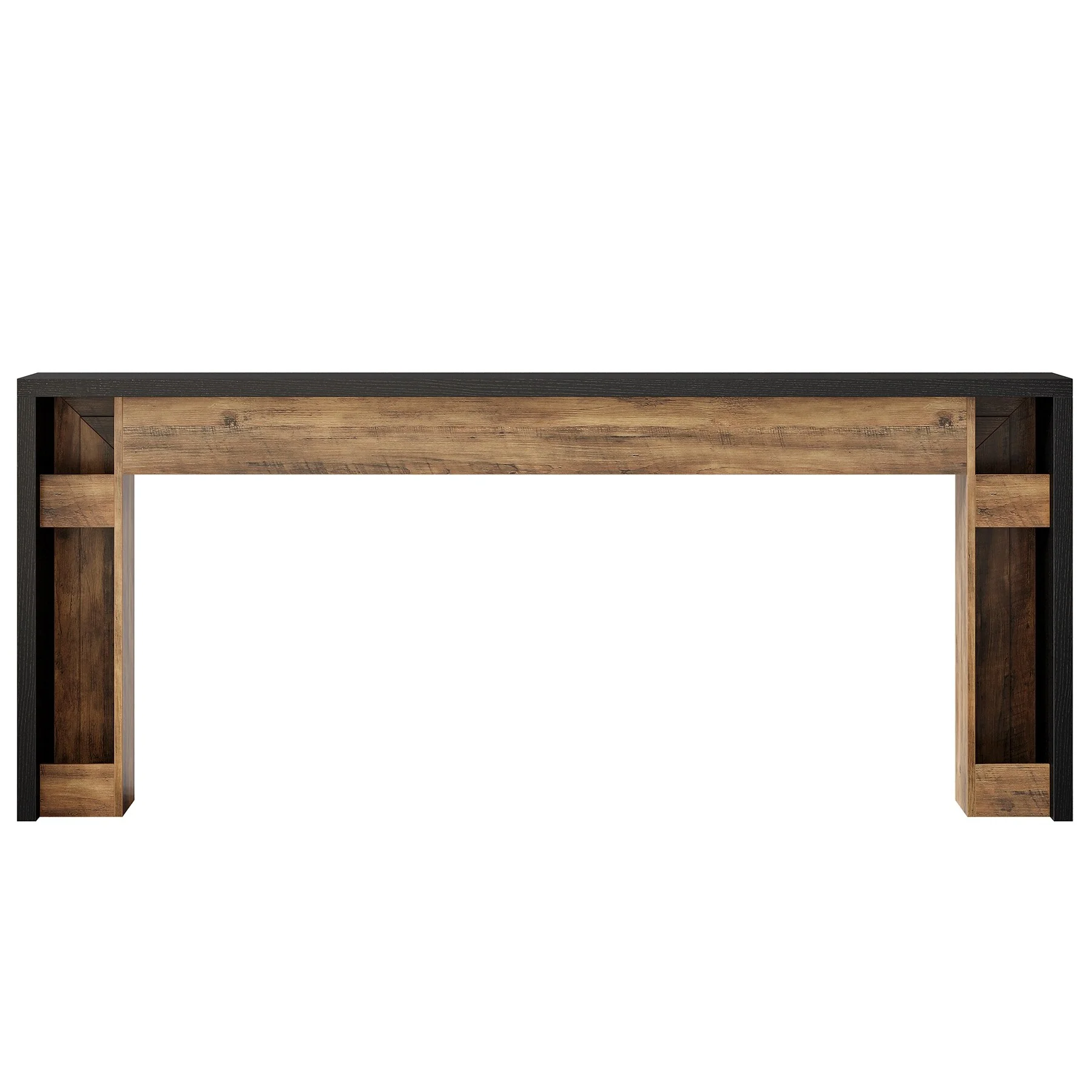 Showcase your style with our striking two-tone entryway table, featuring a blend of black and natural wood grain along with geometric stripes. At 70.9"L x 11.61"W, its compact design provides ample space for decor while supporting up to 300 lbs. Crafted from premium E1-grade particleboard, it ensures durability and stability, making it perfect for any setting in your home.