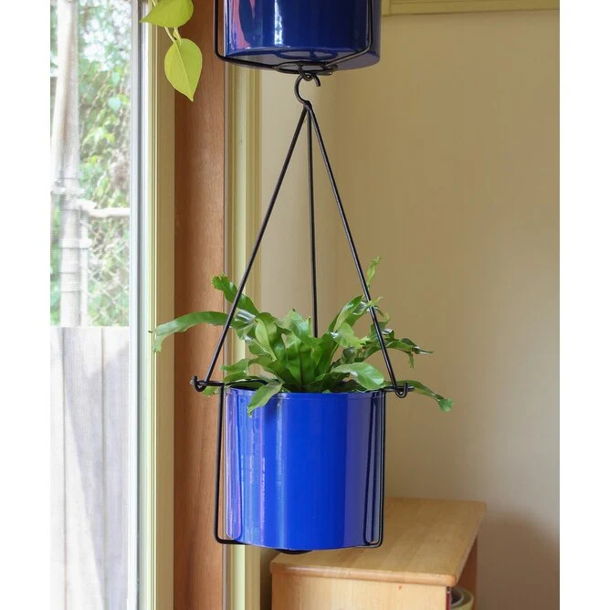 The Vera Planter is a contemporary style plant hanger for the modern home or container garden, with attractive design that is simple and practical in its ease of use. Slip the planter into the basket, hook the end of each rod into the three loops and hang from the hook at the top. Cylindrical planting pots included are made of galvanized steel with Burnt Sienna patina or French Blue powder coating, have removable drainage plugs. Cross-bar provided at the base allows planters to be linked in a vertical arrangement or hang individually from top hanging hook. Made for indoor and outdoor use and powder coated for weather resistance.