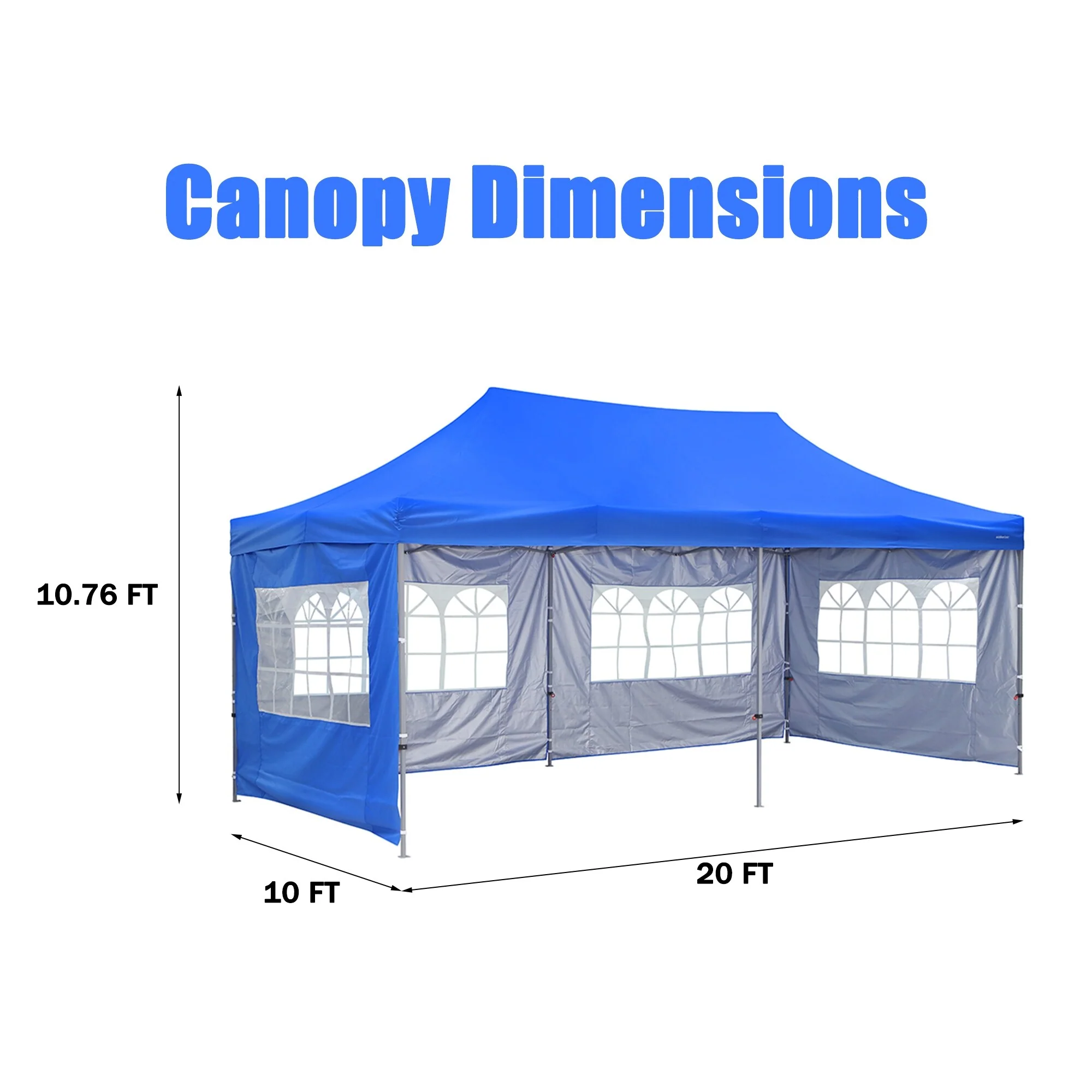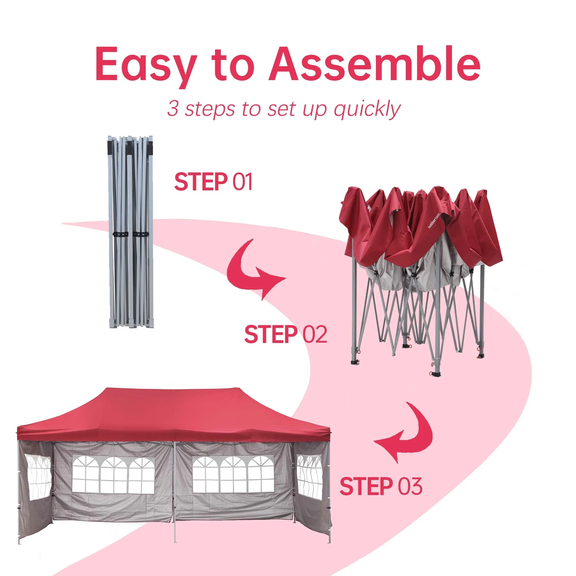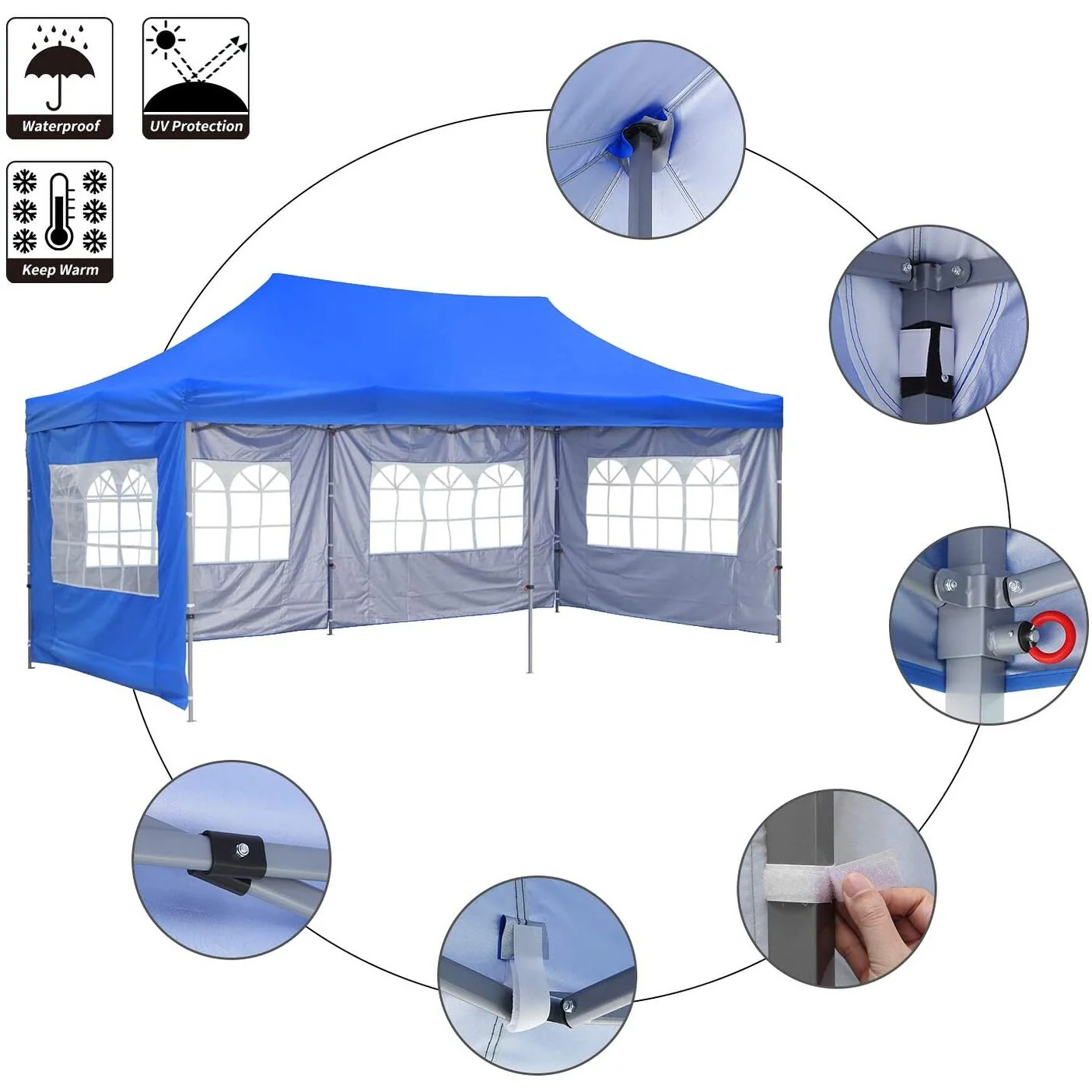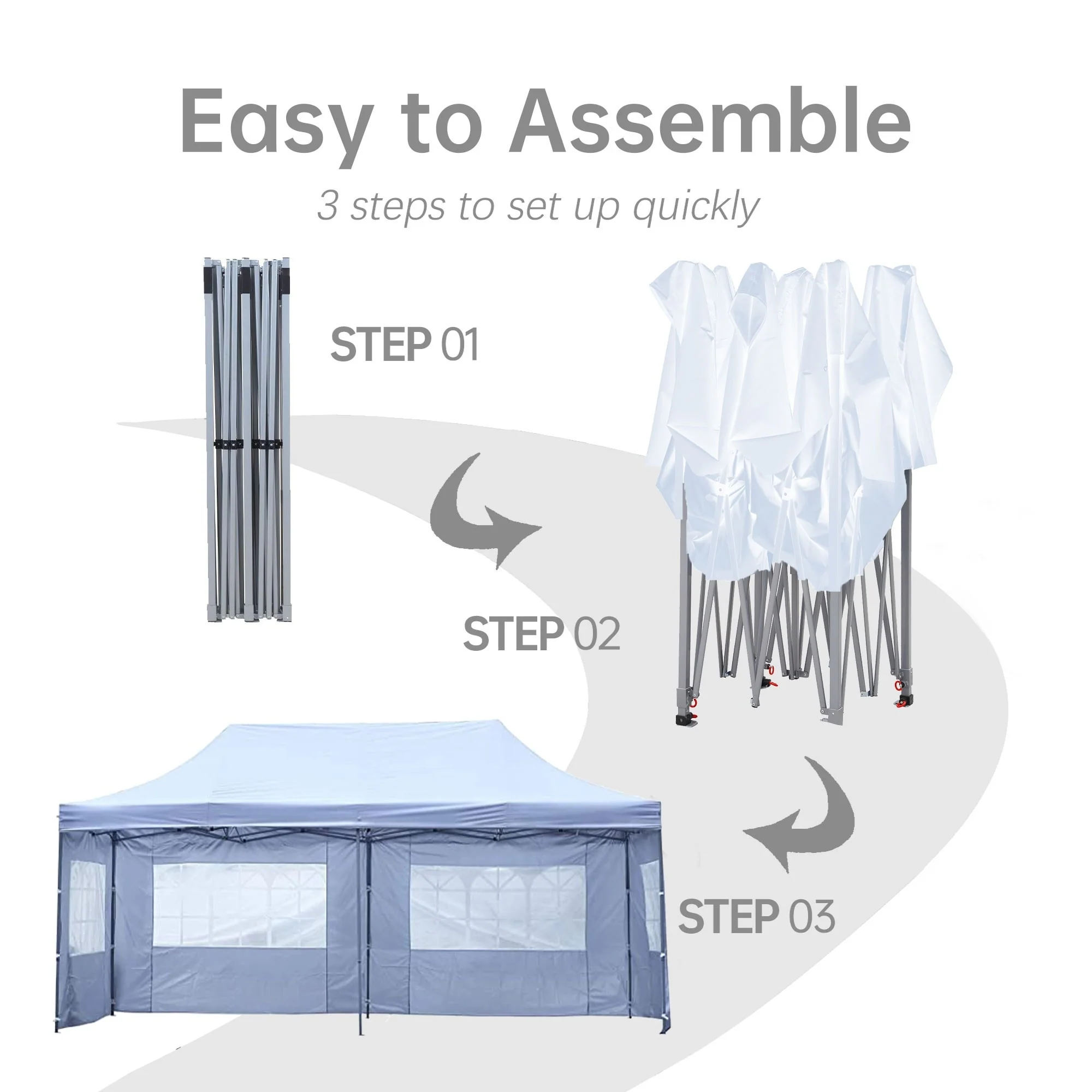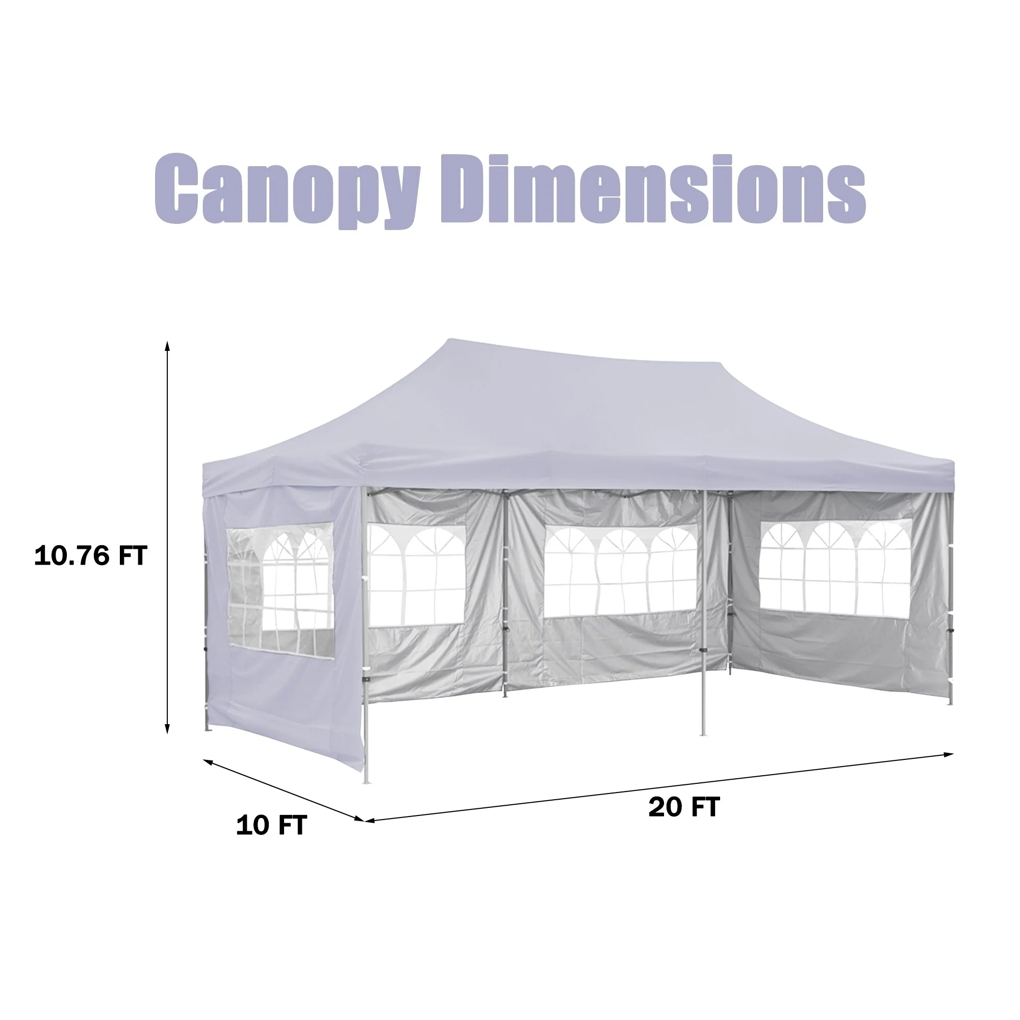 Set up a stylish and functional outdoor gathering space in minutes with the Ainfox 10x20FT Pop Up Patio Canopy Tent. This spacious tent features a water-resistant 210D Oxford Tough Fabric and a sturdy, rust-resistant powder-coated steel frame. The silver-coated inner lining blocks up to 99% of harmful UV rays, and the four transparent windows and four removable sidewalls add extra protection without sacrificing ventilation. With its easy folding and pop-up design and included wheeled carrying bag, this tent is perfect for outdoor weddings, parties, events, and tailgating.