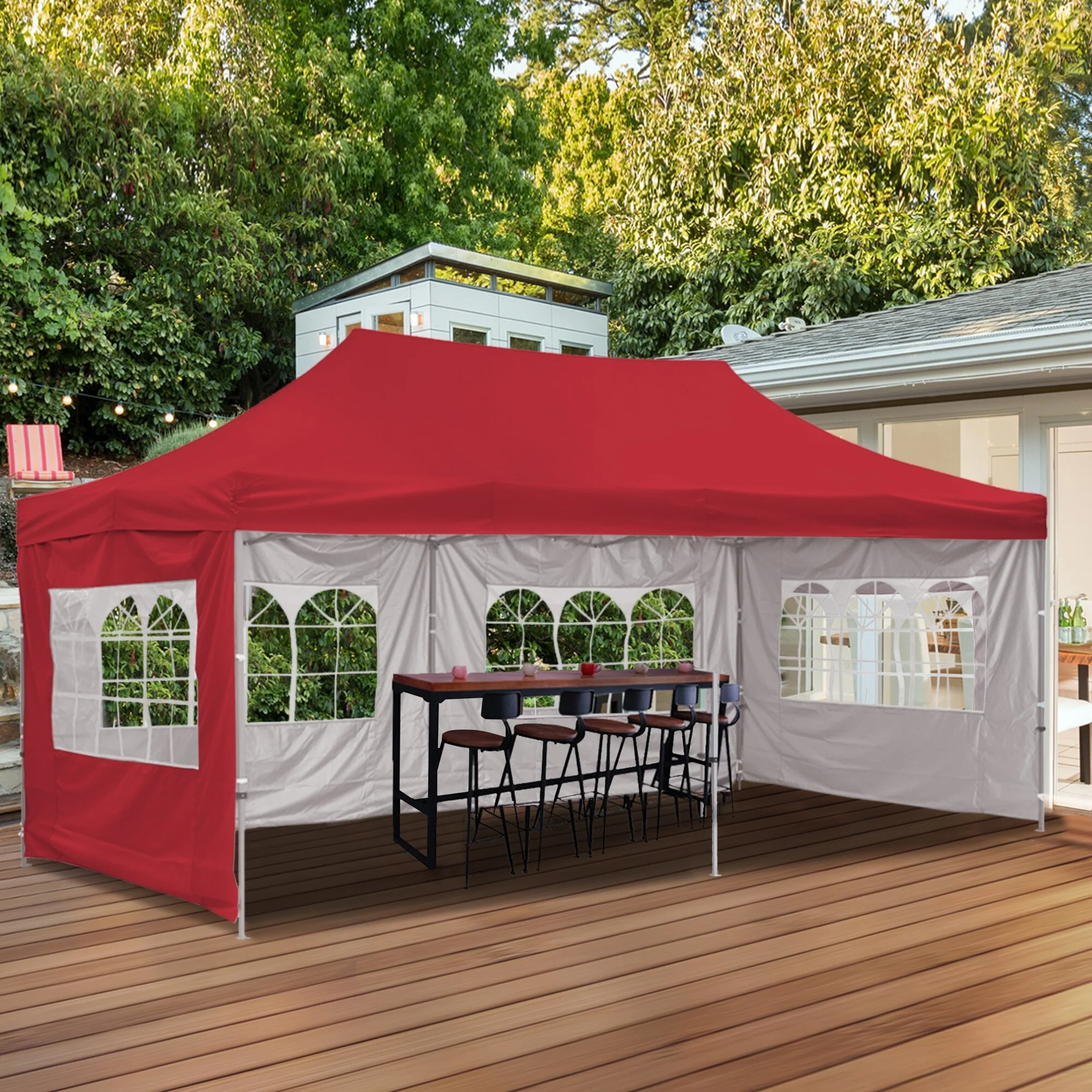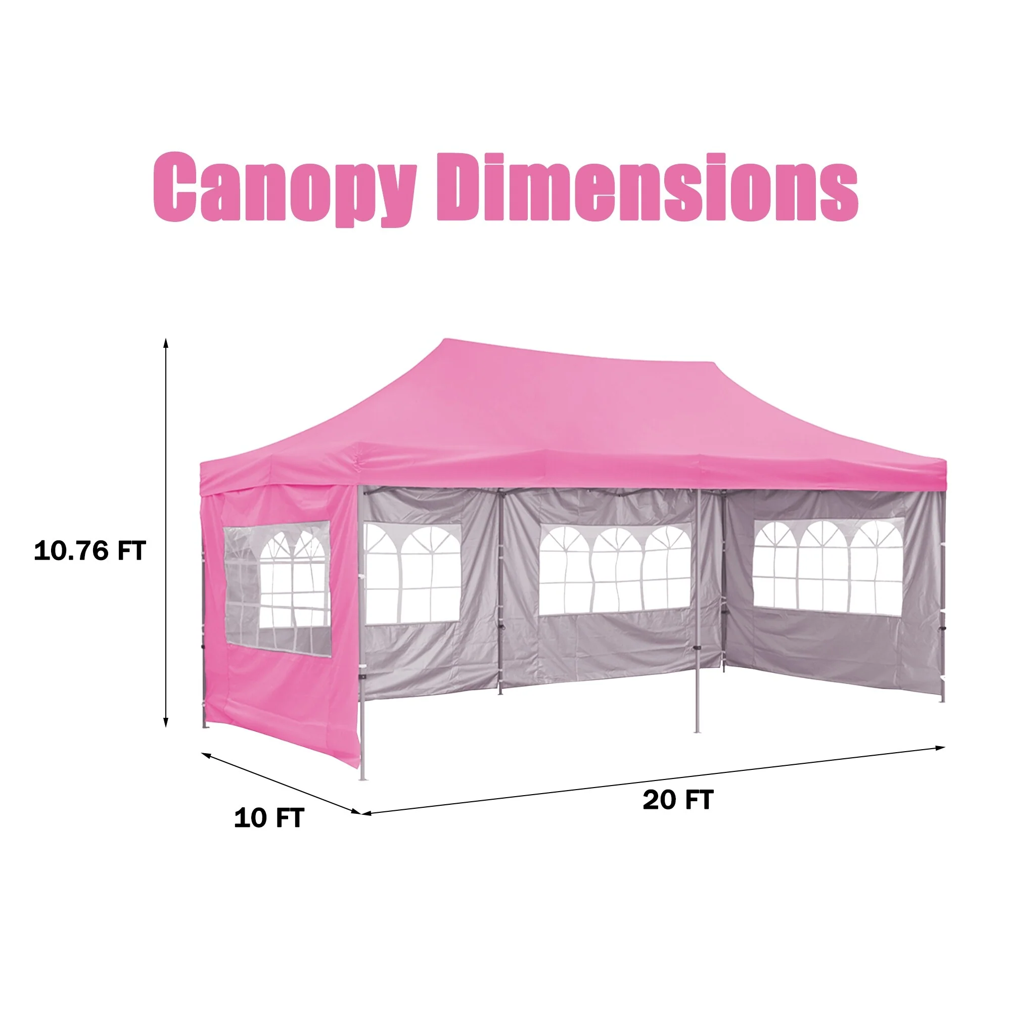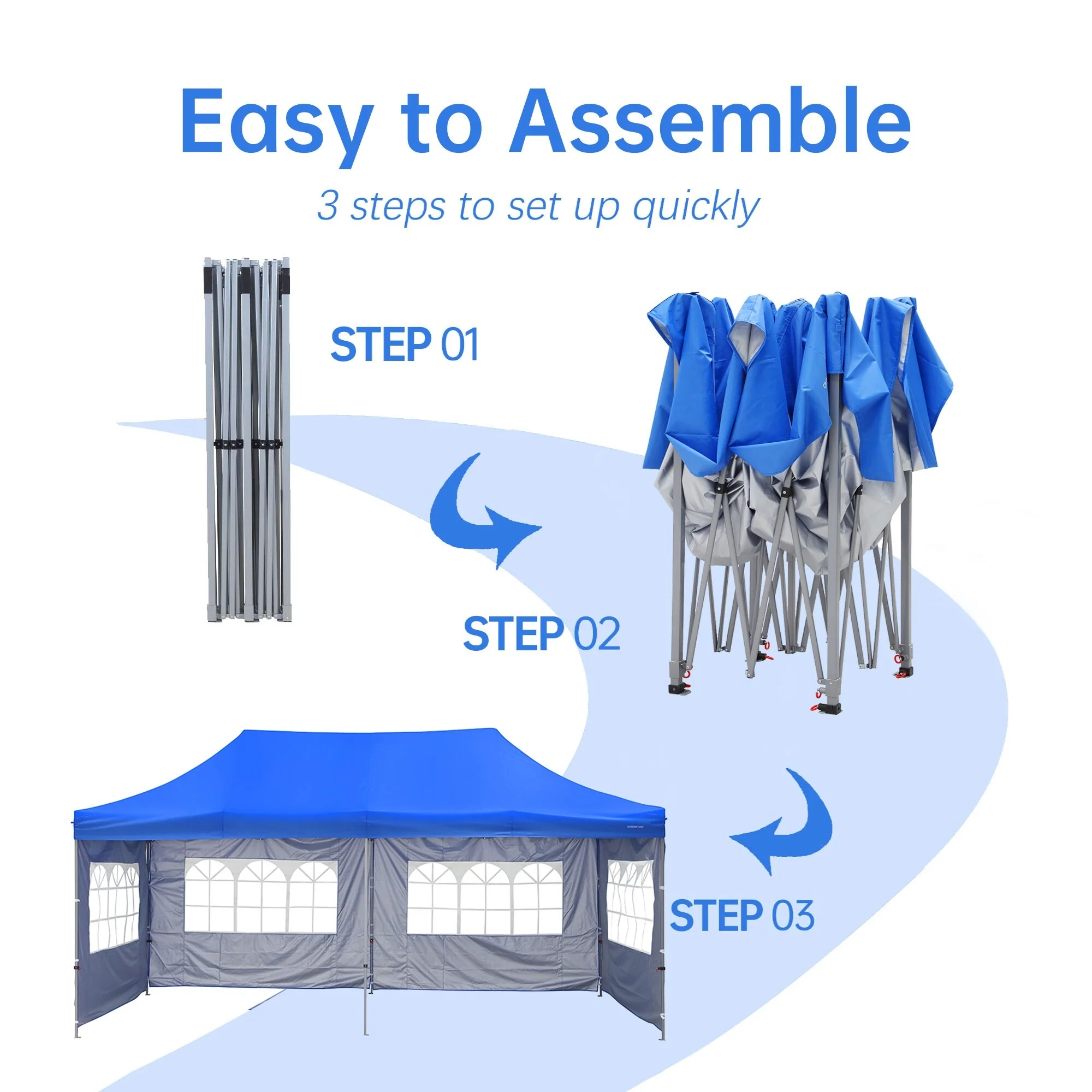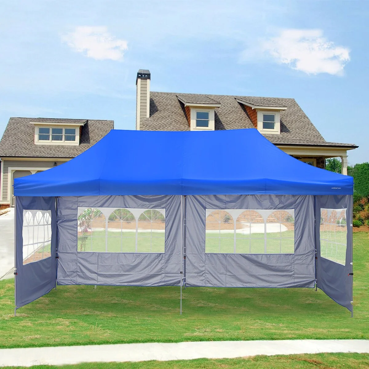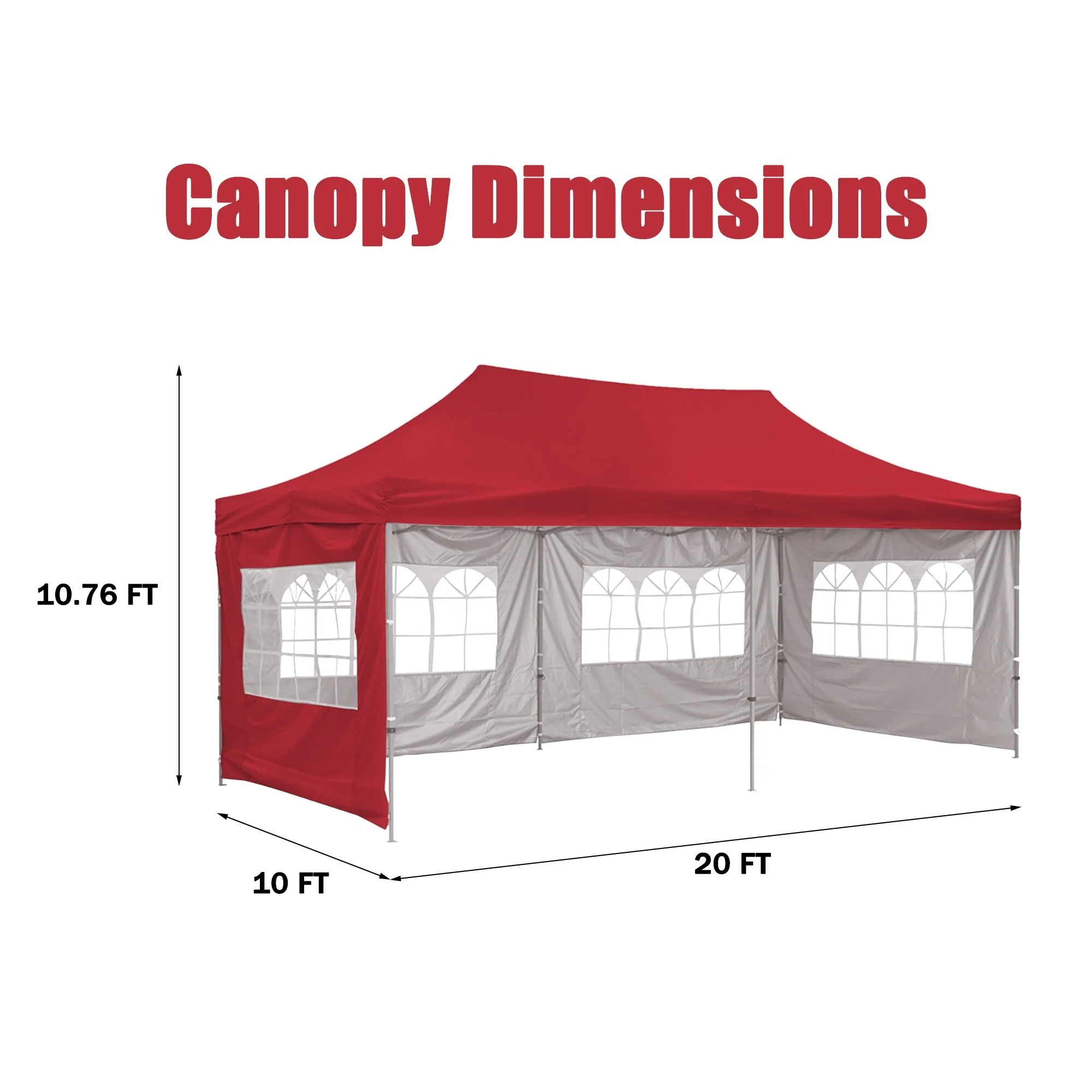 Set up a stylish and functional outdoor gathering space in minutes with the Ainfox 10x20FT Pop Up Patio Canopy Tent. This spacious tent features a water-resistant 210D Oxford Tough Fabric and a sturdy, rust-resistant powder-coated steel frame. The silver-coated inner lining blocks up to 99% of harmful UV rays, and the four transparent windows and four removable sidewalls add extra protection without sacrificing ventilation. With its easy folding and pop-up design and included wheeled carrying bag, this tent is perfect for outdoor weddings, parties, events, and tailgating.