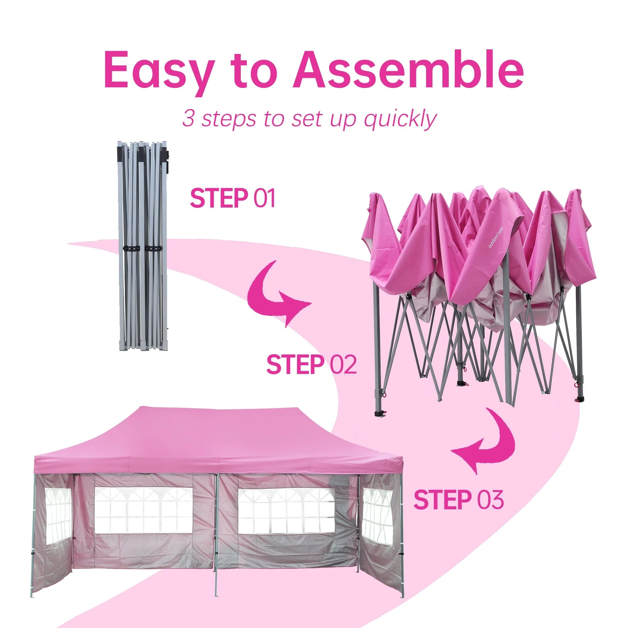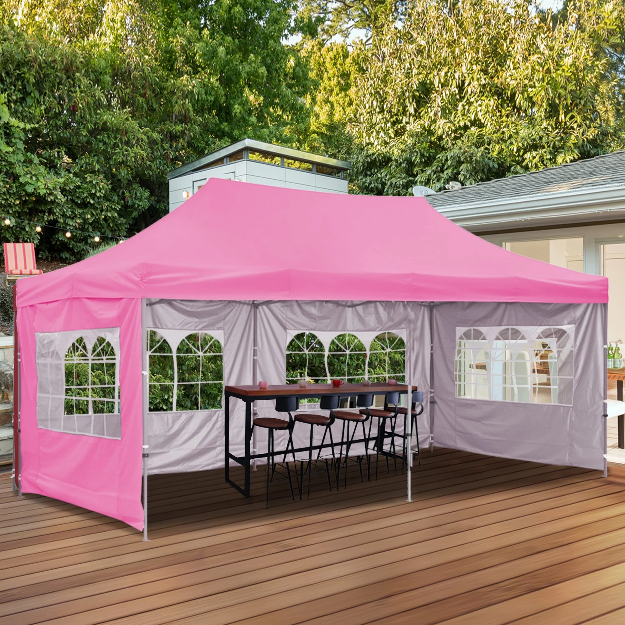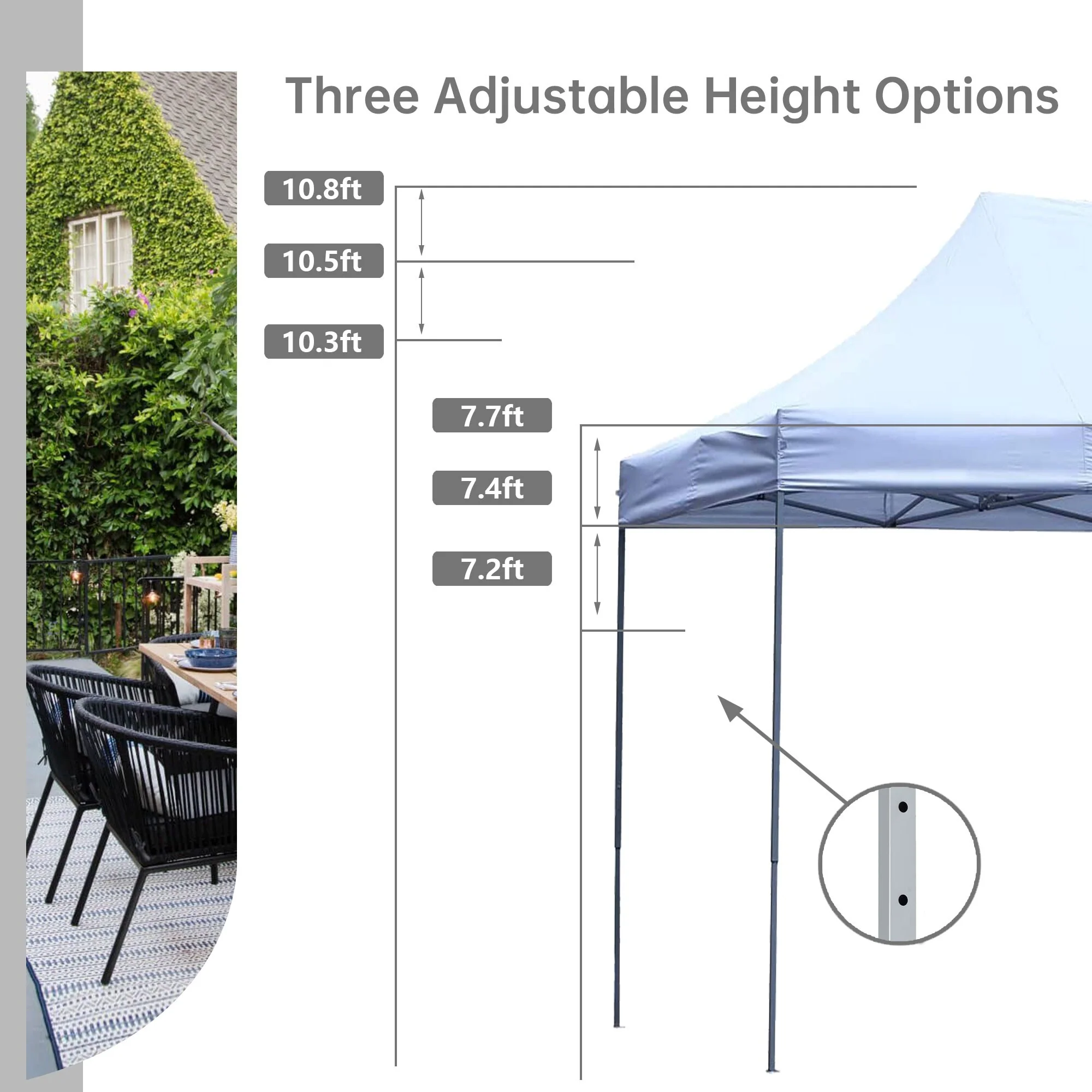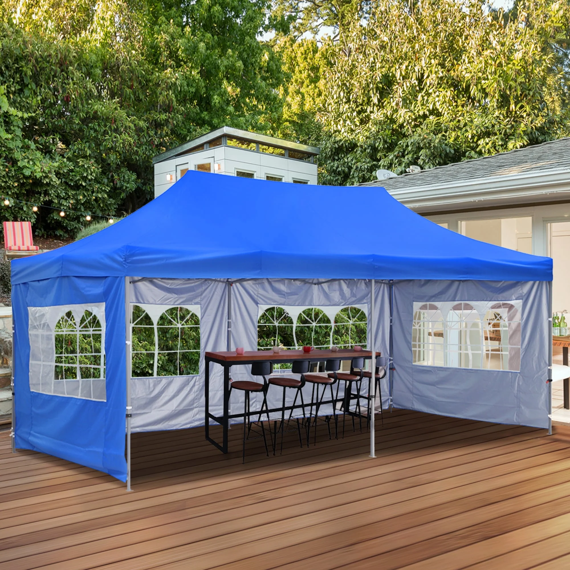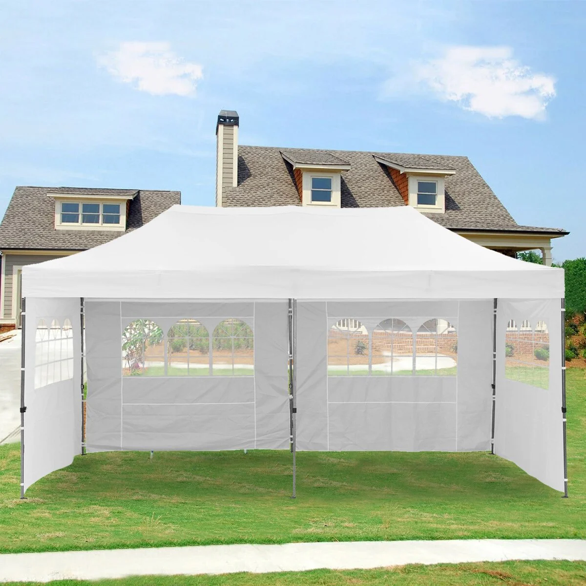 Set up a stylish and functional outdoor gathering space in minutes with the Ainfox 10x20FT Pop Up Patio Canopy Tent. This spacious tent features a water-resistant 210D Oxford Tough Fabric and a sturdy, rust-resistant powder-coated steel frame. The silver-coated inner lining blocks up to 99% of harmful UV rays, and the four transparent windows and four removable sidewalls add extra protection without sacrificing ventilation. With its easy folding and pop-up design and included wheeled carrying bag, this tent is perfect for outdoor weddings, parties, events, and tailgating.