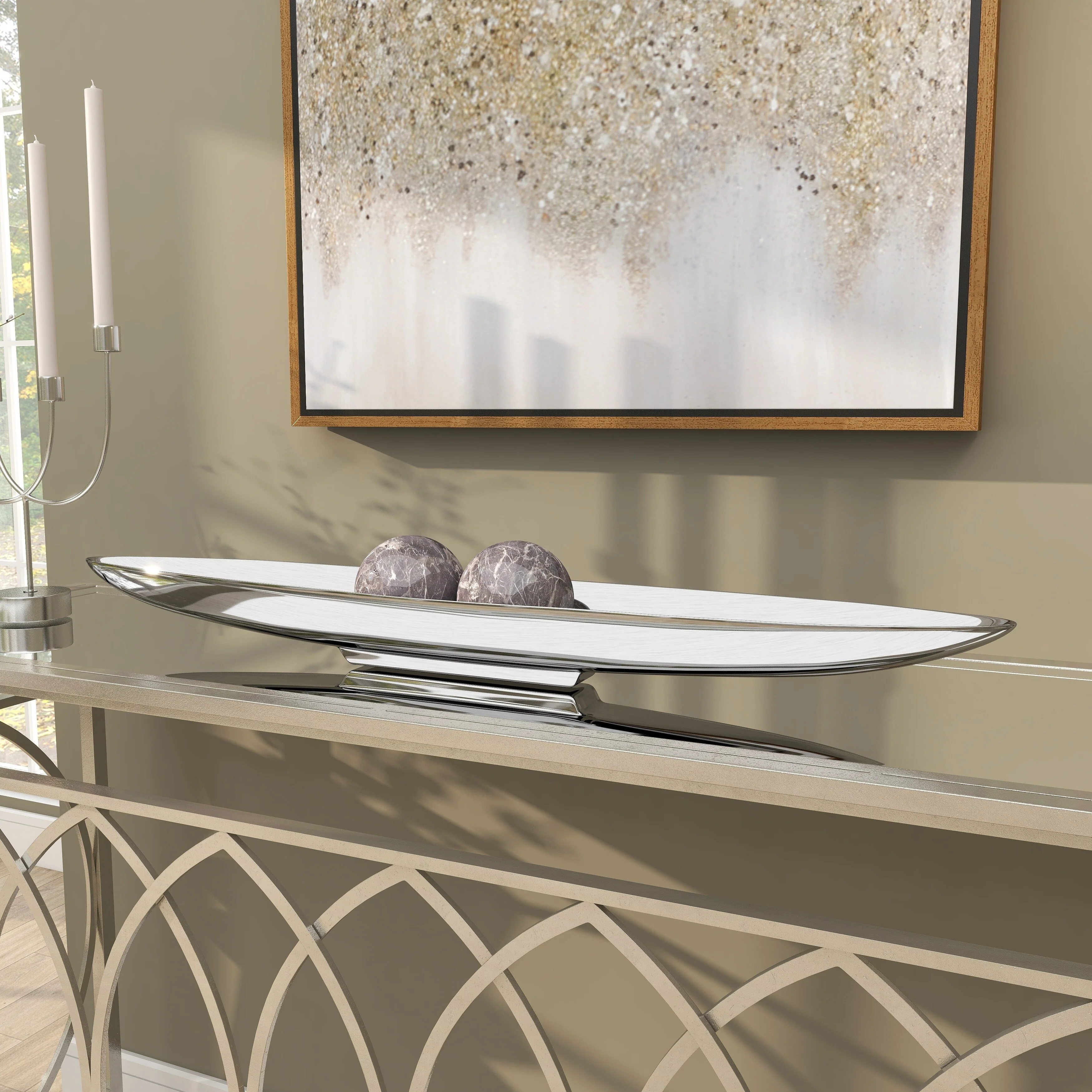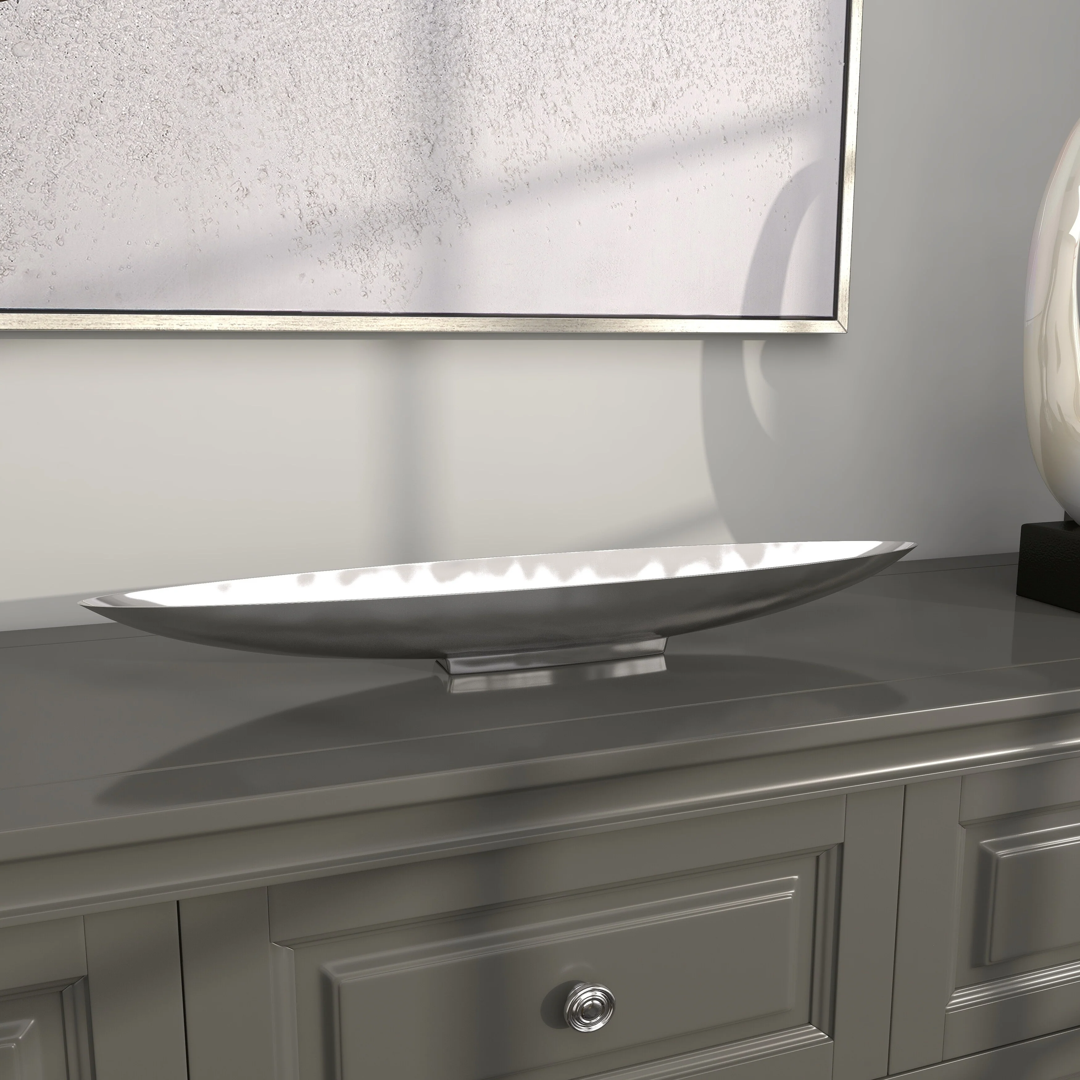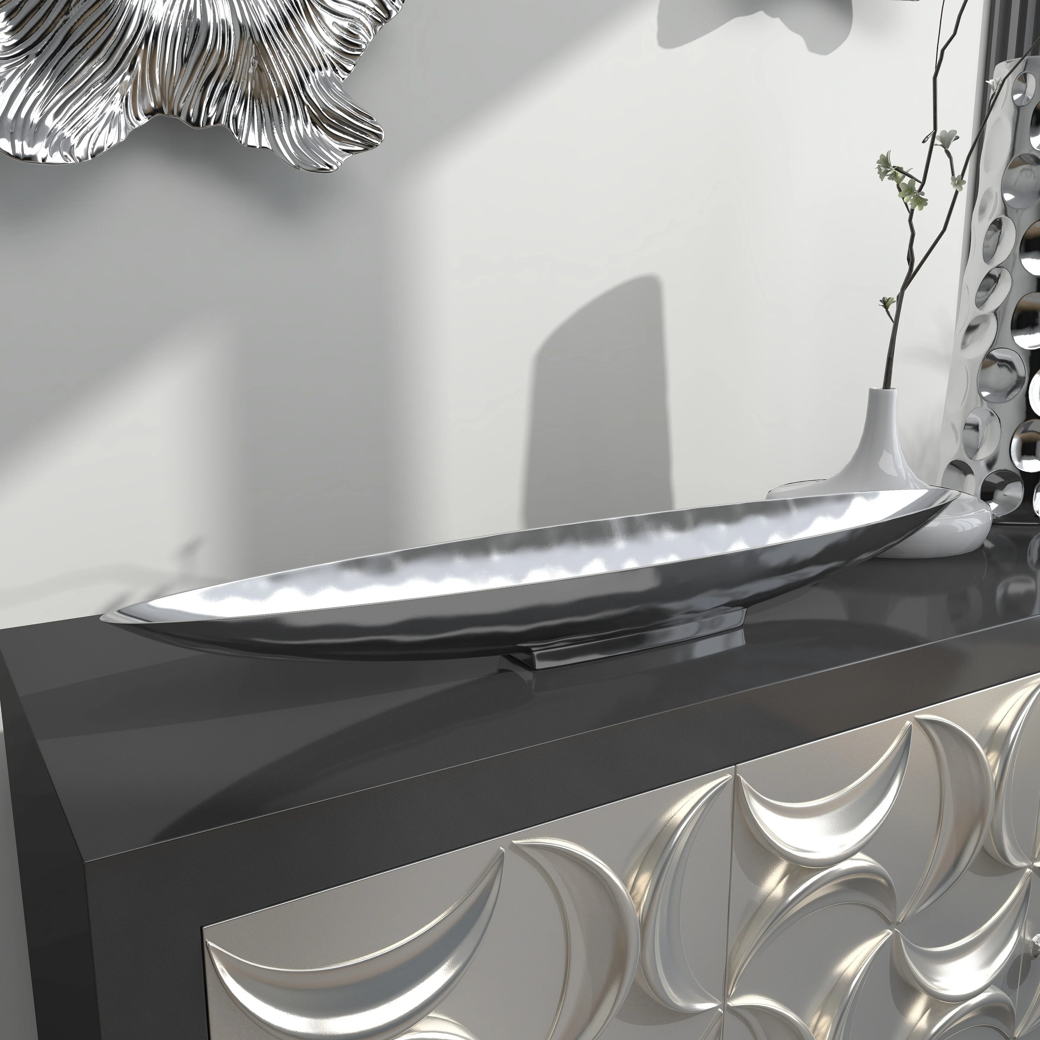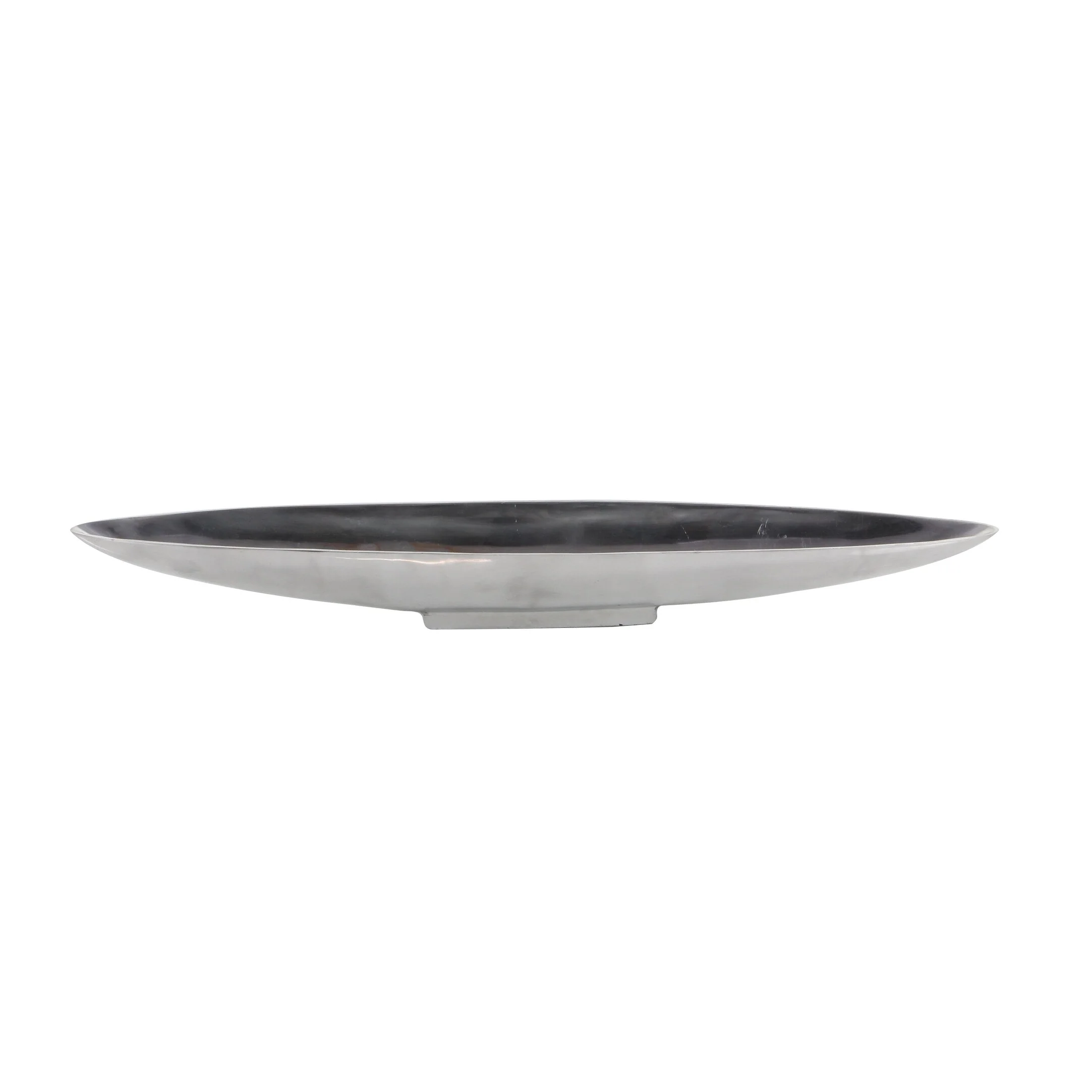 - Very large tray with canoe shape, shallow bowl center, metallic polished silver finish on a polished silver aluminum block base