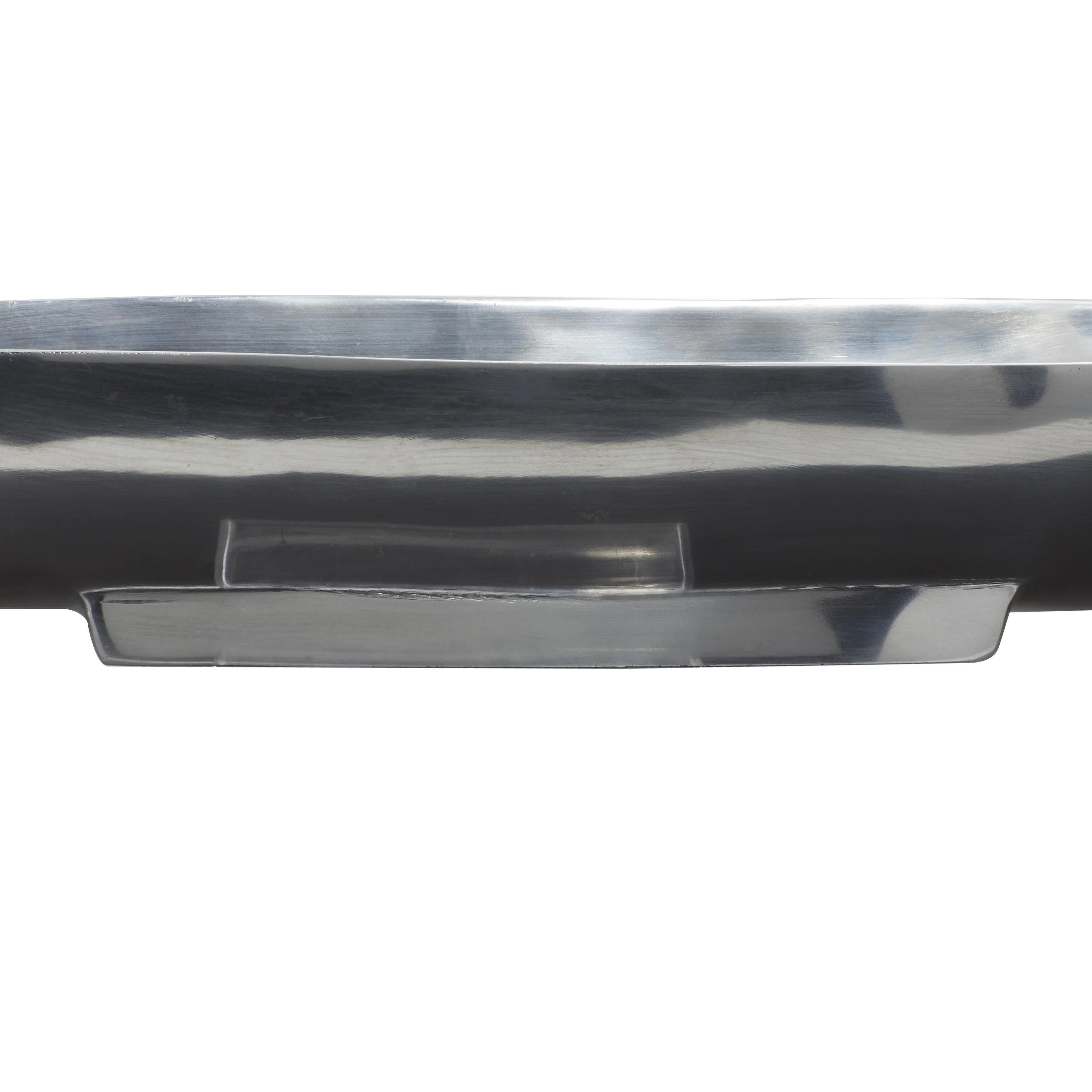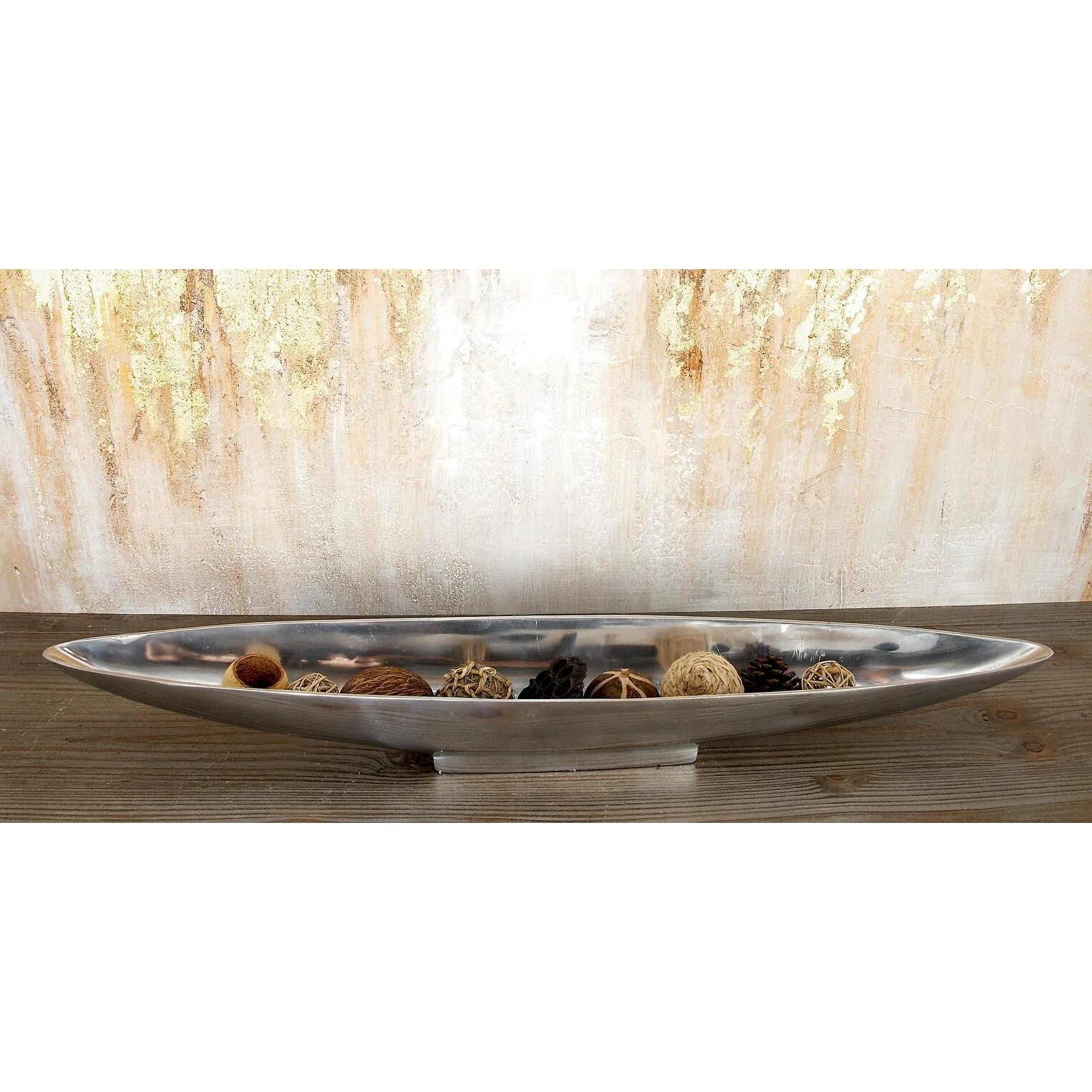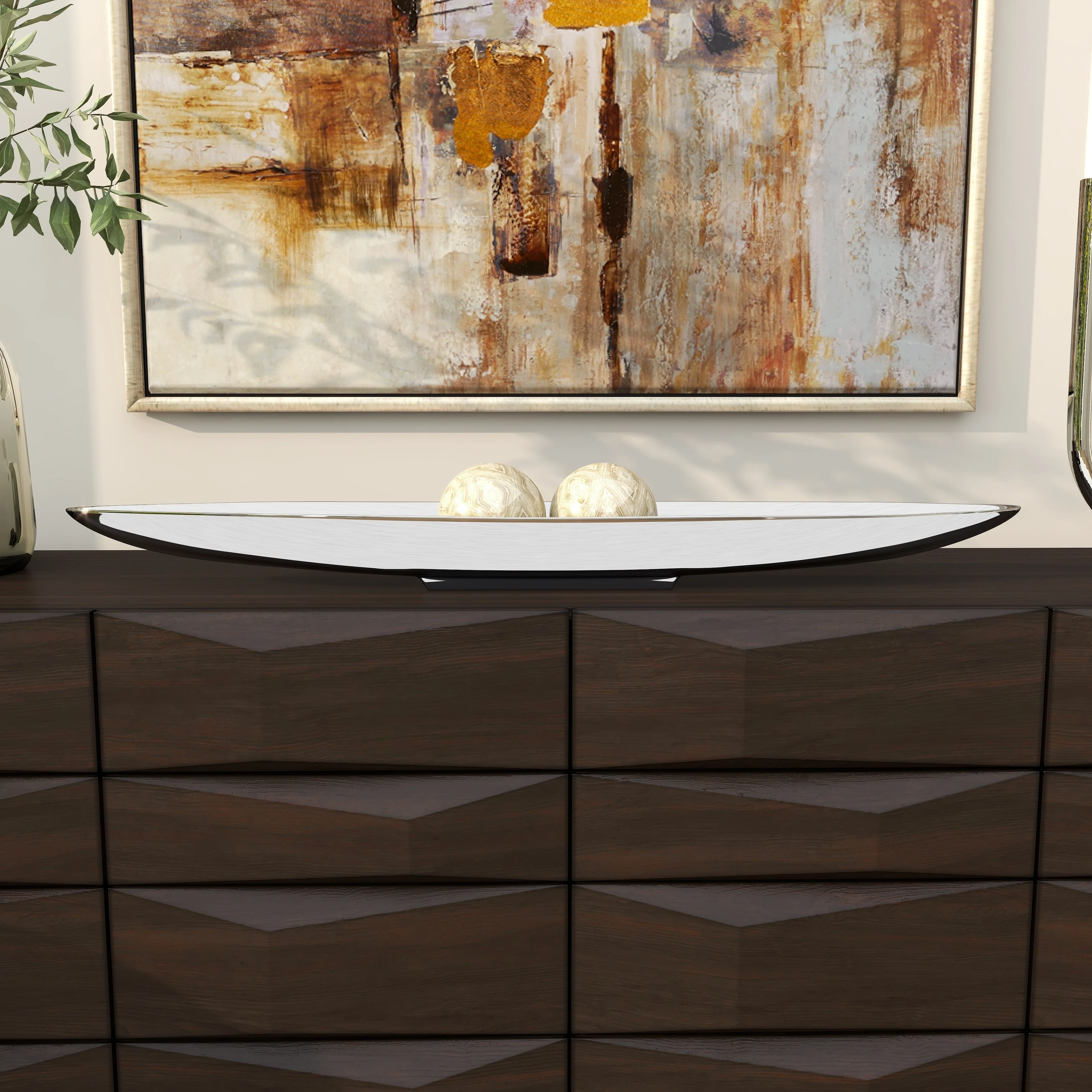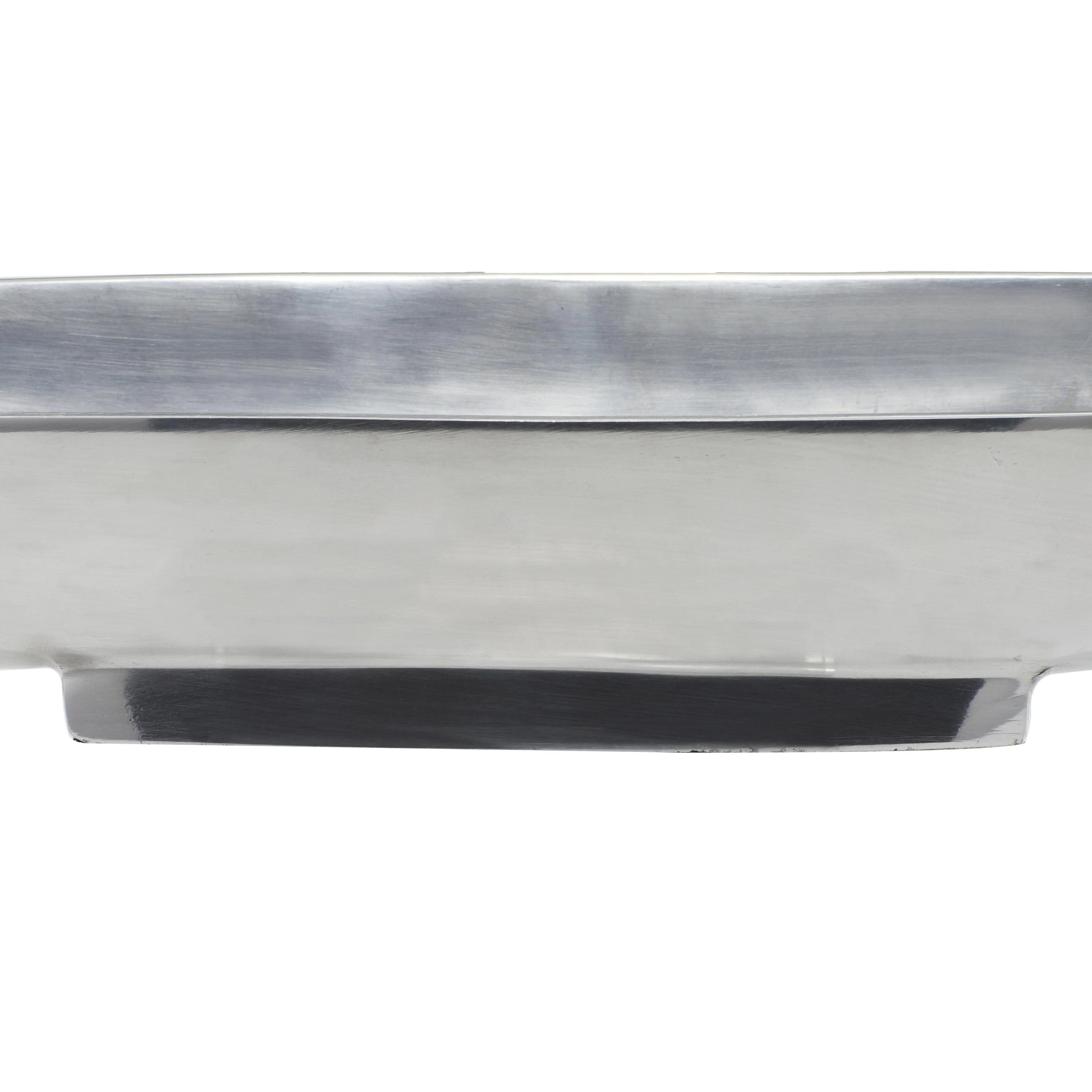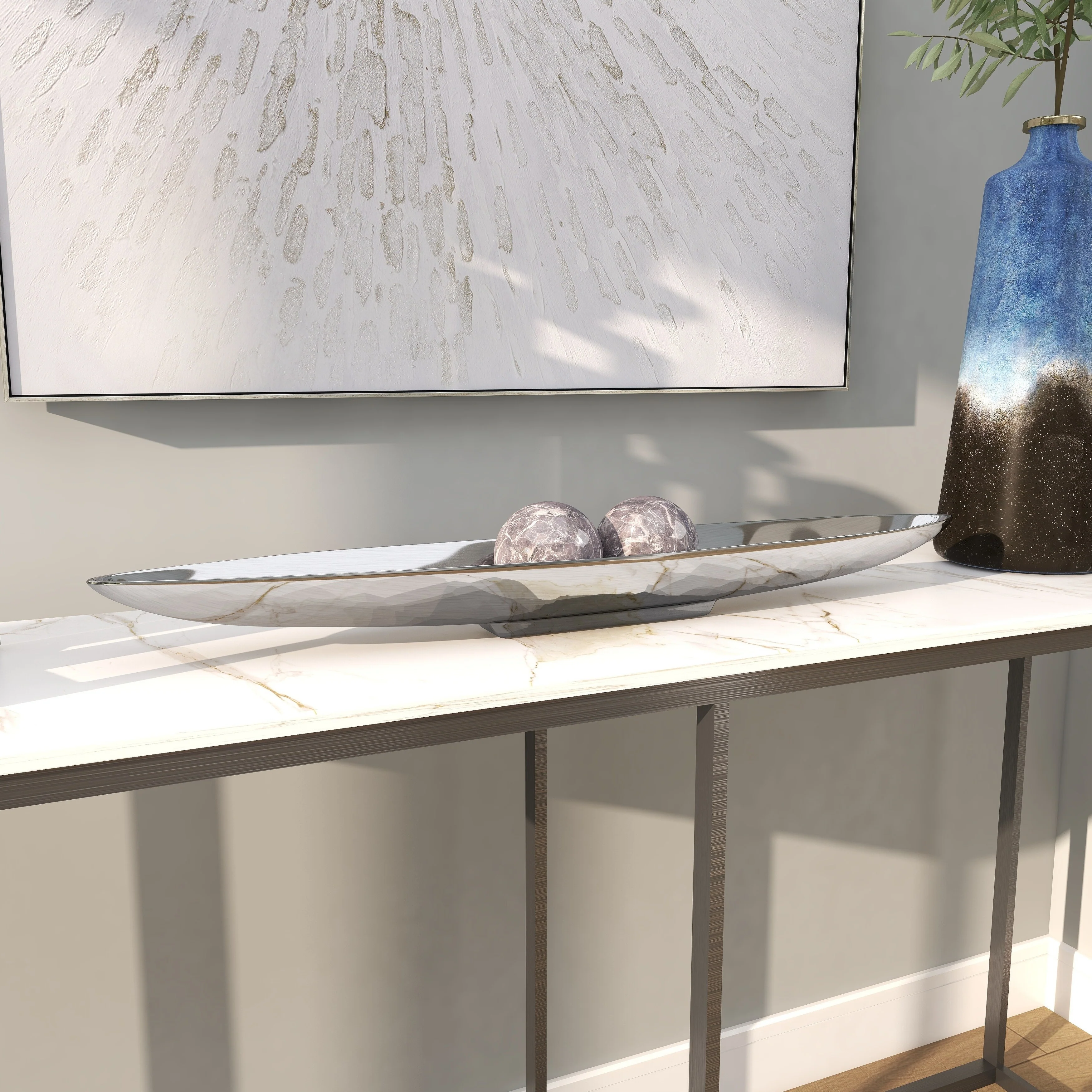 - Very large tray with canoe shape, shallow bowl center, metallic polished silver finish on a polished silver aluminum block base