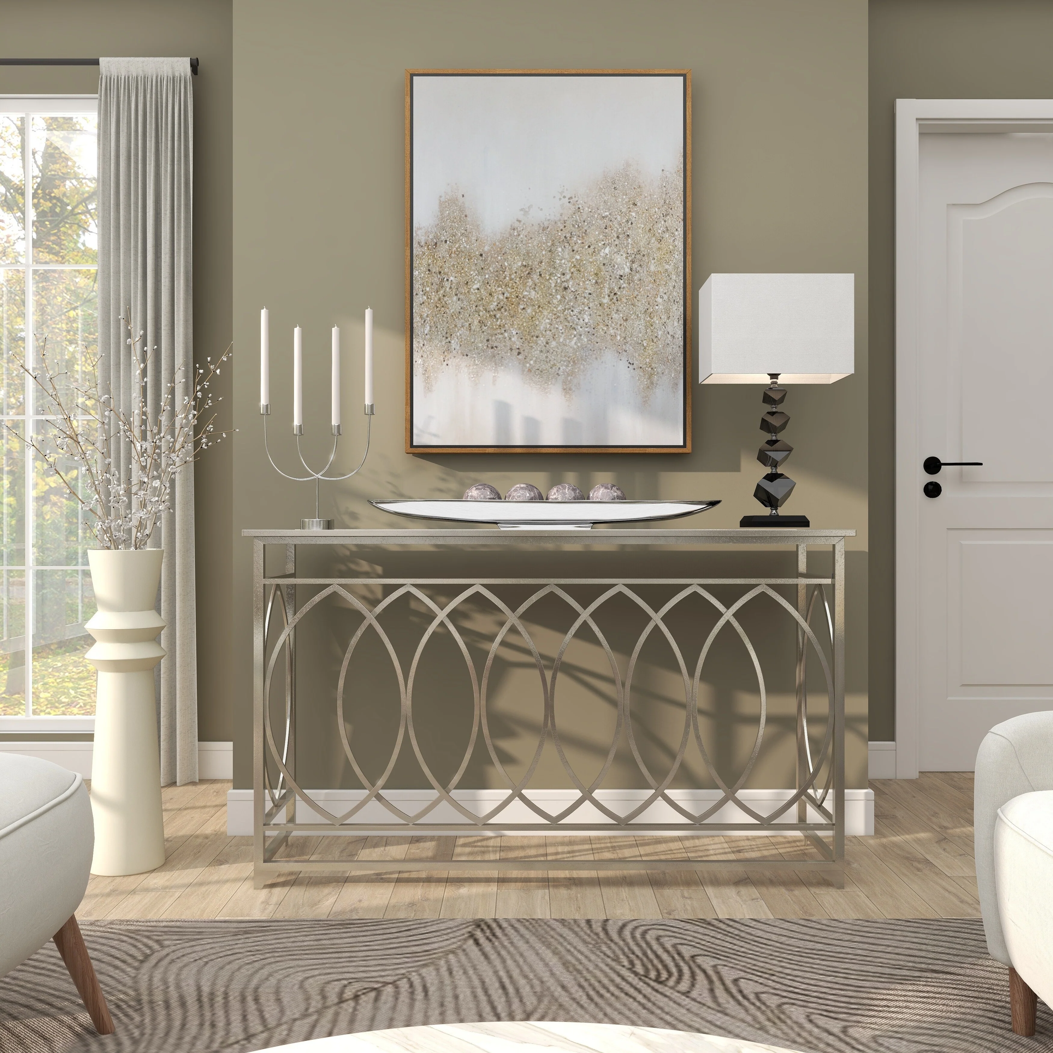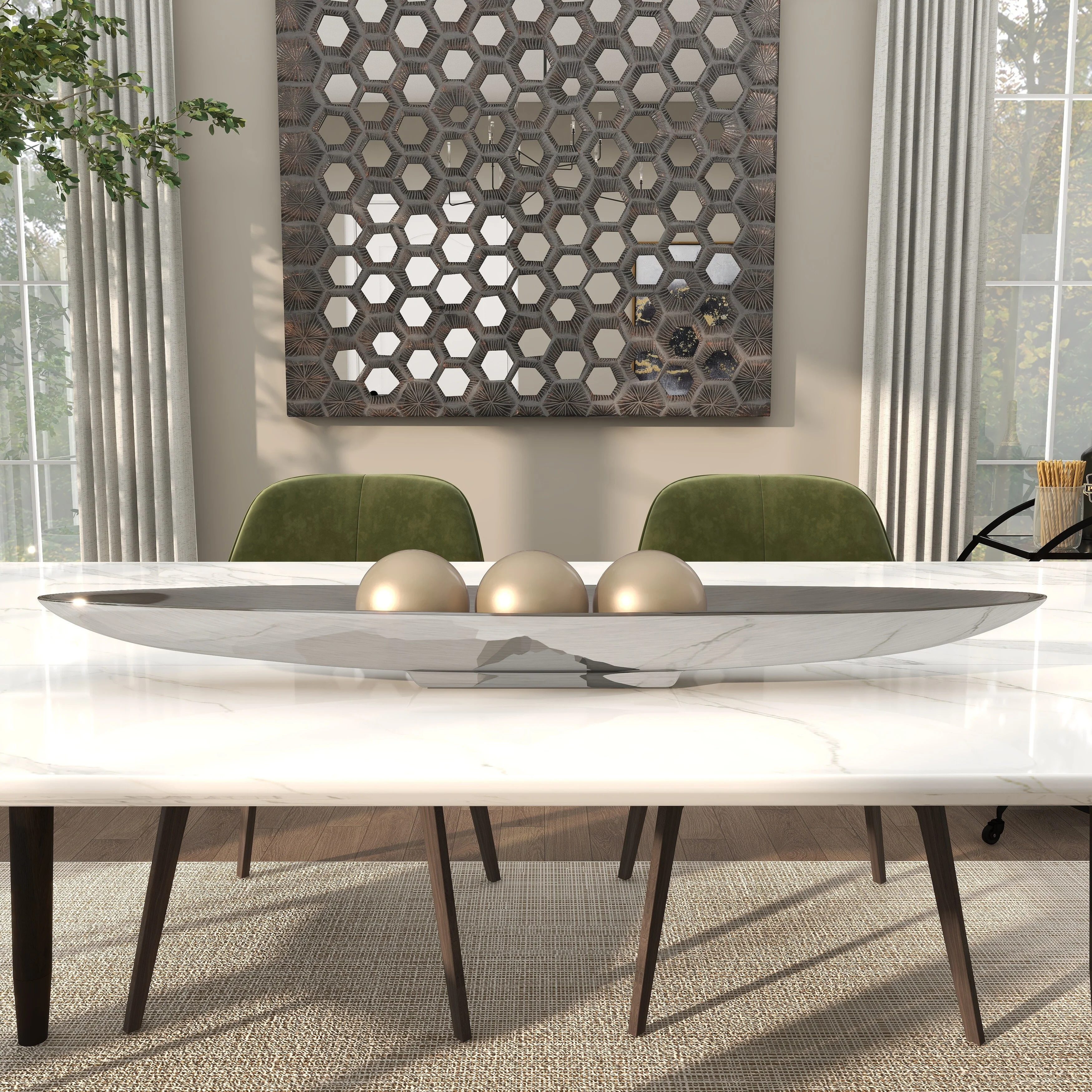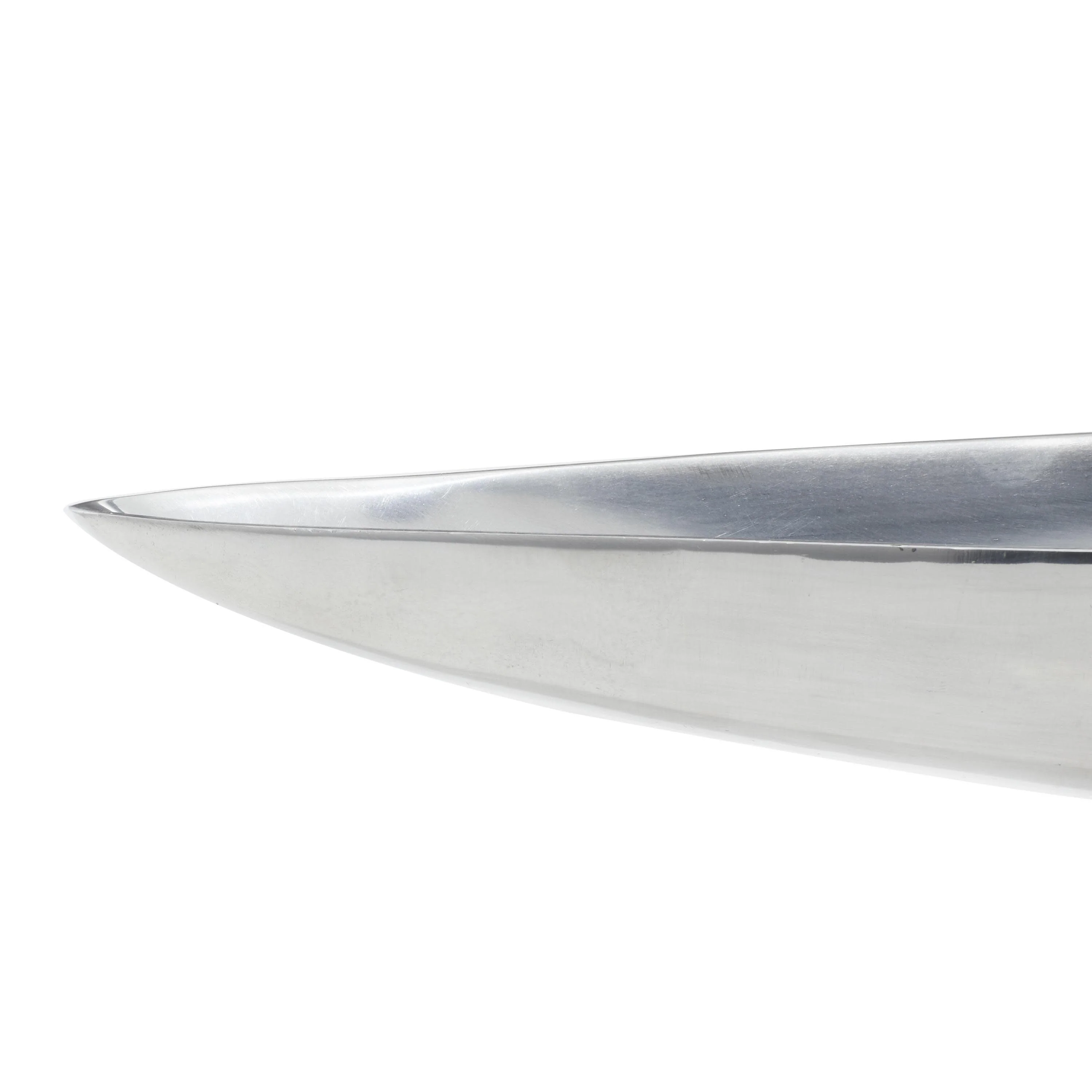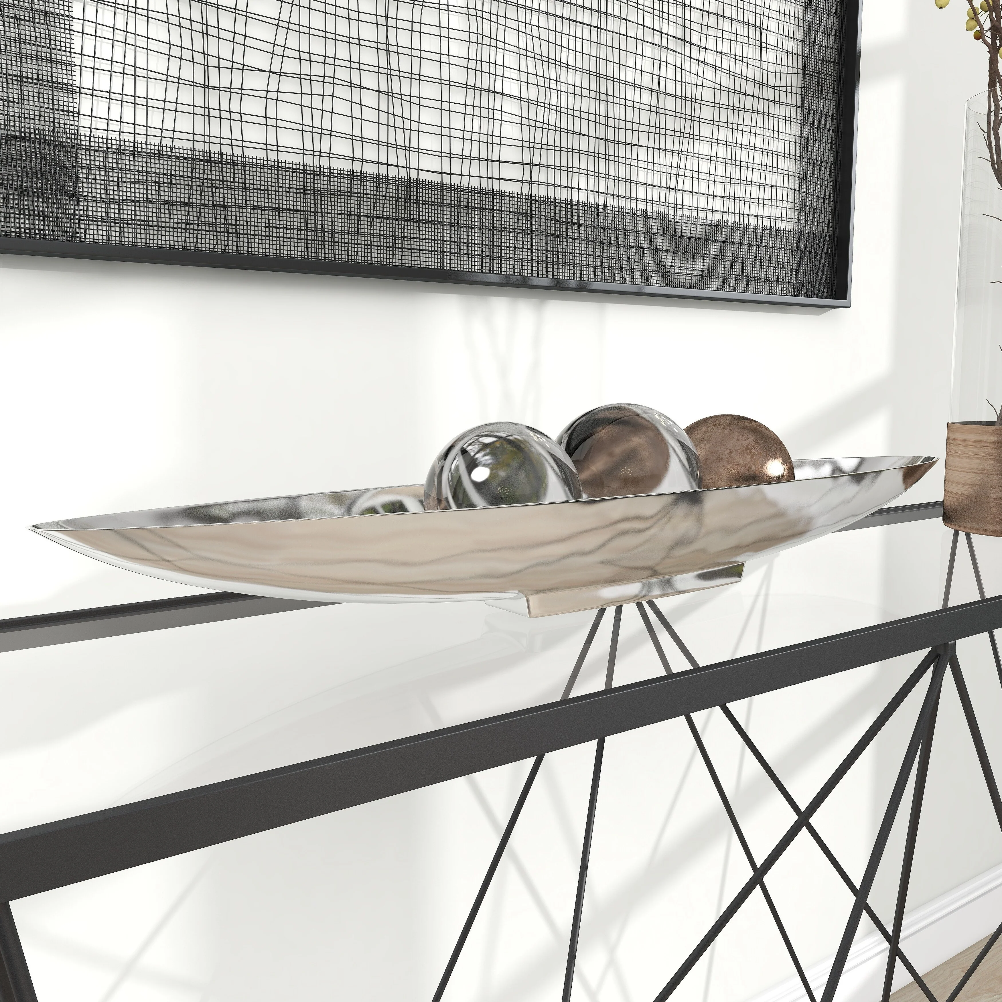 - Very large tray with canoe shape, shallow bowl center, metallic polished silver finish on a polished silver aluminum block base