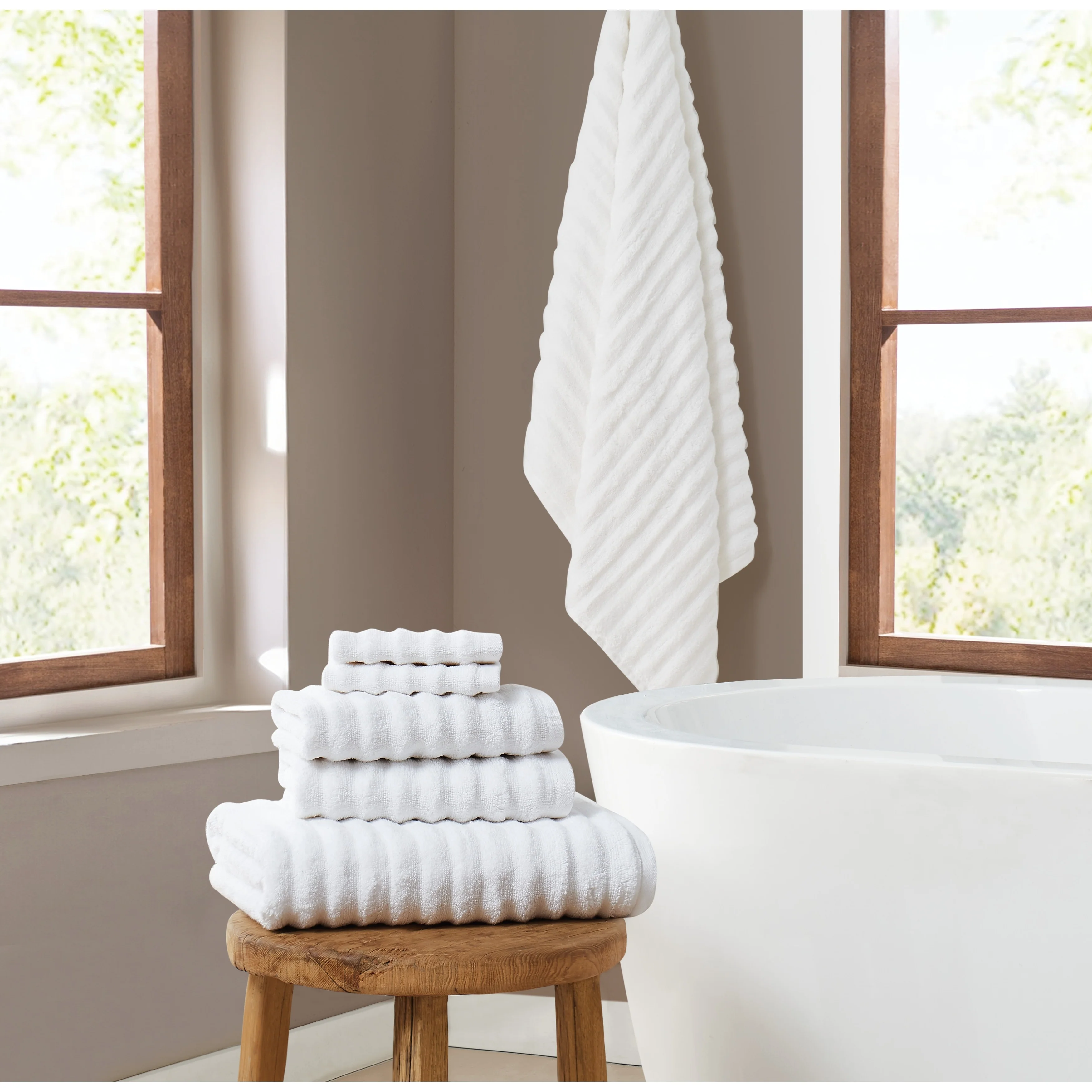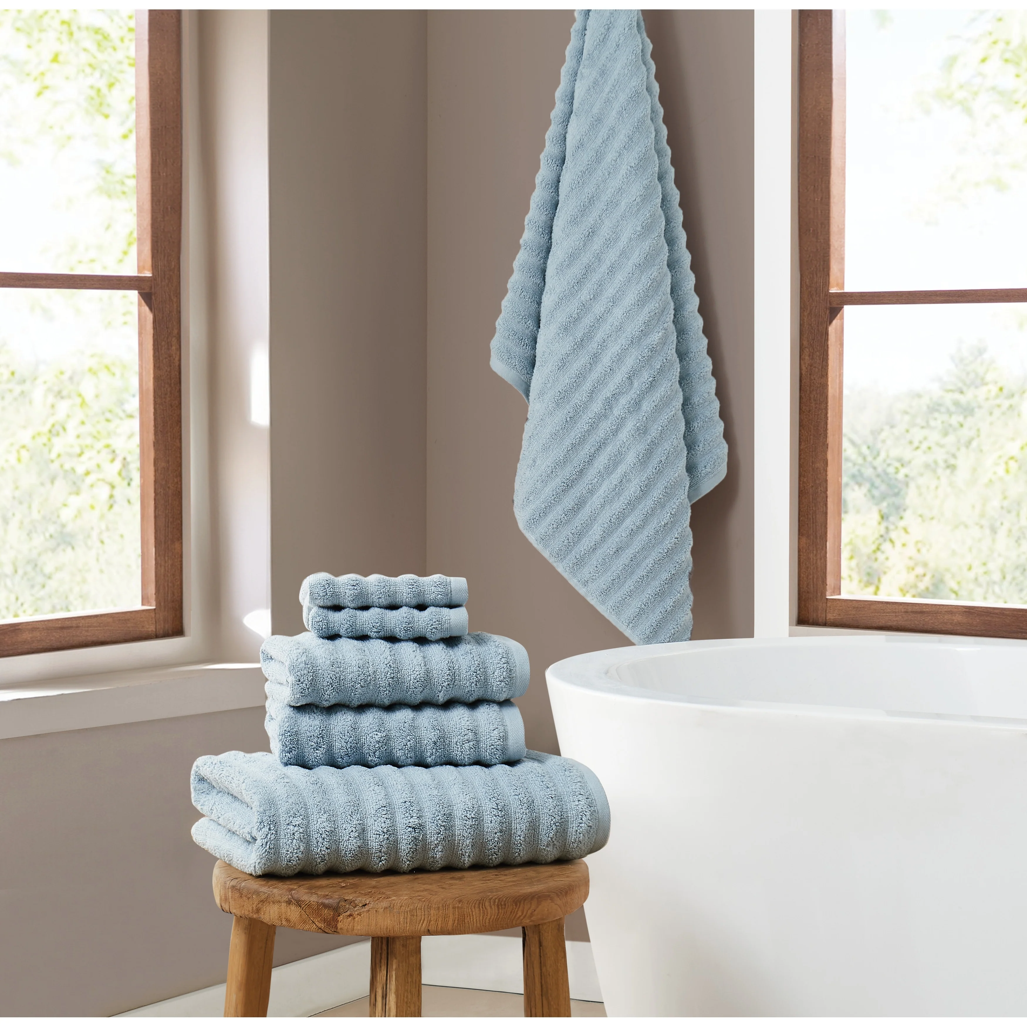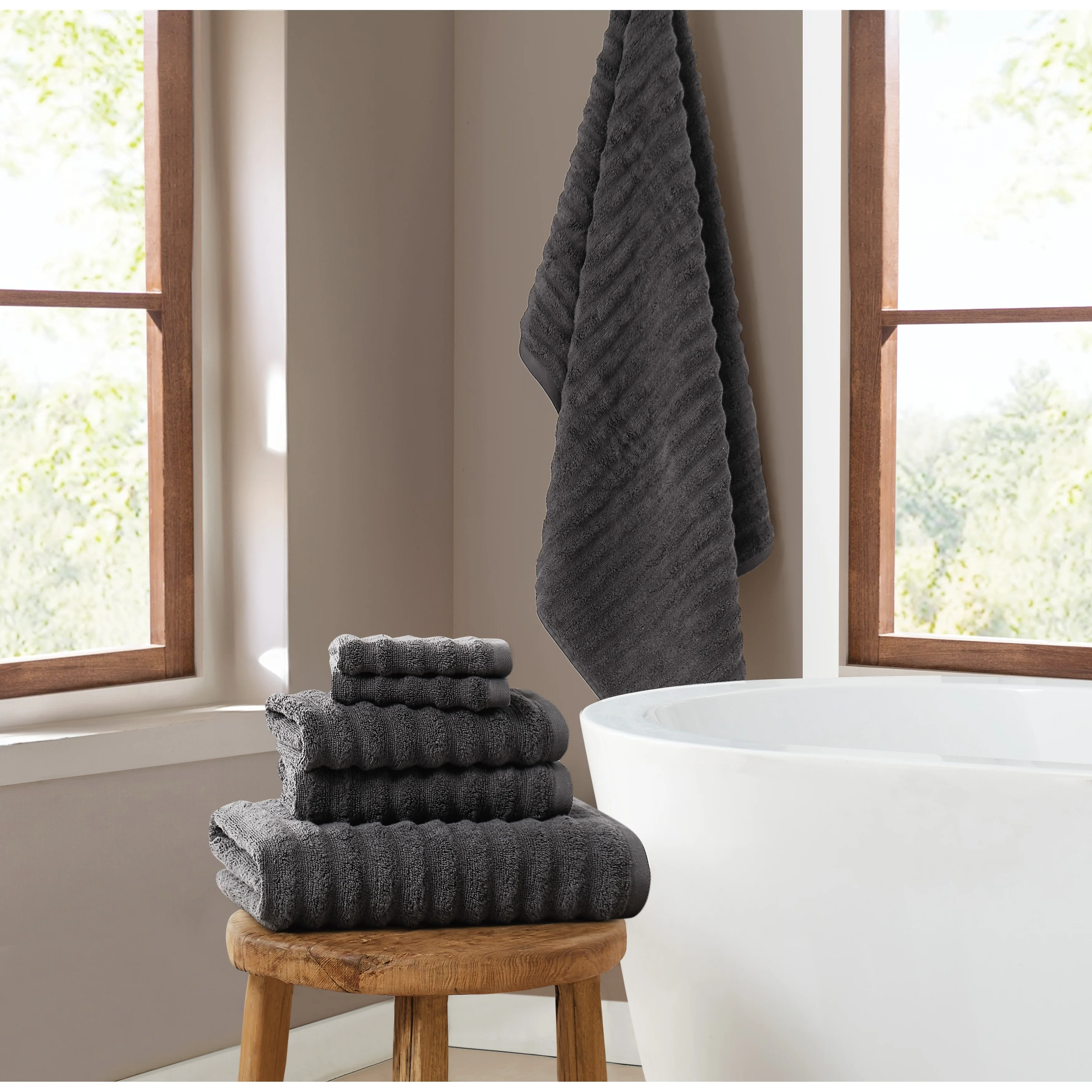 Transform your bathroom into a sanctuary of relaxation and rejuvenation with the Brooklyn Loom Textured Zero Twist 6 Piece Towel Set. Pamper yourself with the ultimate spa-like experience, courtesy of these exquisite towels designed to elevate your bathing routine to new heights of luxury. This meticulously crafted set includes two sumptuous bath towels measuring 30 by 54 inches, two plush hand towels measuring 16 by 28 inches, and two soft washcloths measuring 12 by 12 inches, providing everything you need for a spa-like experience in the comfort of your home. Featuring a sophisticated ridge pattern on the face of the towels, this set adds a touch of elegance and texture to your bathroom decor. Crafted from premium 100% cotton and utilizing zero twist yarns, these towels offer exceptional softness and absorbency, enveloping you in unparalleled comfort with every use. Brooklyn Loom is committed to delivering products of the highest quality and safety, and this towel set is no exception. OEKO-TEX Standard 100 Certification ensures that these towels meet stringent global standards for textile safety and environmental sustainability, providing you with peace of mind as you indulge in their luxurious comfort. Transform your bathroom into a sanctuary of relaxation and rejuvenation with the Brooklyn Loom Textured Zero Twist 6 Piece Towel Set. Pamper yourself with the ultimate spa-like experience, courtesy of these exquisite towels designed to elevate your bathing routine to new heights of luxury.