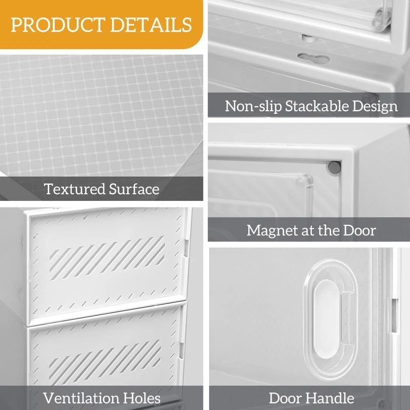The materials we use are different from the general plastic products on the market. This product is made of high-quality plastic plate, which is more durable. The size of the shoebox is enough for ordinary men's or women's shoes (US Size: 5.0 ~ 10 / EU size: 37 ~ 44). A single shoebox can accommodate l 23 * W 33.4 * h 14cm shoes, including ordinary sports shoes, flat shoes, flip flops, sandals, etc.Shoe storage boxes provide additional storage space no matter where you need them, keeping your home comfortable and tidy. Our stackable shoe storage boxes provide additional storage space no matter where you need it, keeping your home comfortable and tidy. You can use them not only to store shoes but also clothes, cosmetics, electronics, and other odds and ends. The ventilated design facilitates the air circulation in the item to ensure that there is no peculiar smell. The body of the boxes is made of ABS plastic, which is new patented material. It is 0.62mm thick to ensure the boxs firmness.