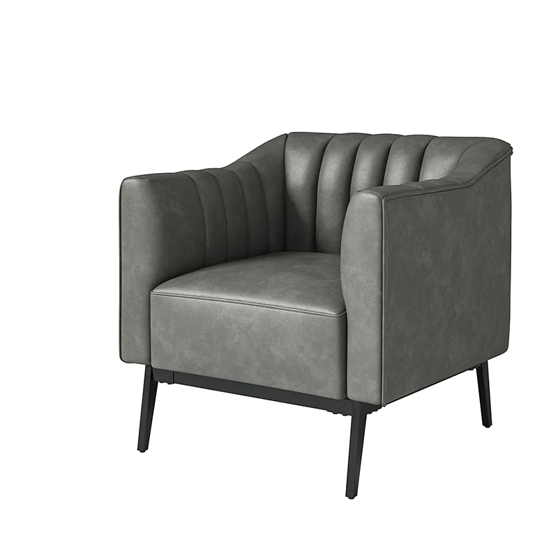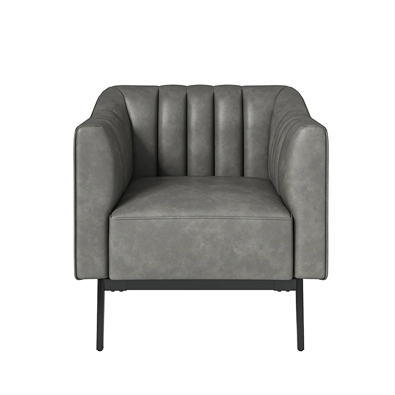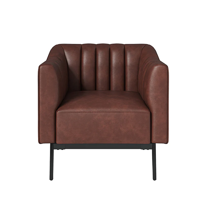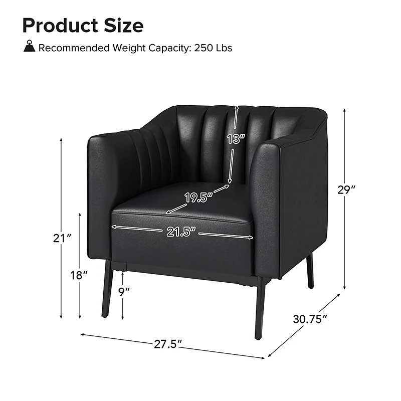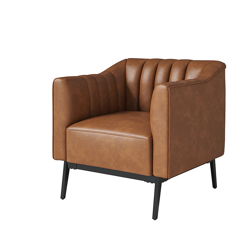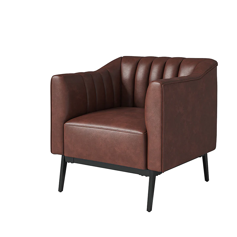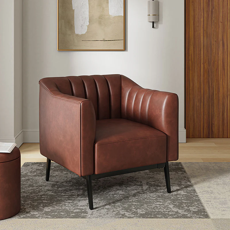 BImmerse yourself in the industrial chic with this exquisitely designed accent chair. Upholstered in quality PU leather, this chair is waterproof and easily cleanable surface ensuring a worry-free experience. Supported by sturdy metal legs, this chair offers reliable stability and robust support, ensuring longevity. The vertical channel tufting on the chair enhances both comfort and visual appeal, creating a visually appealing texture that complements the overall aesthetic. The solid back provides ample support and comfort, making it a good choice for long hours of relaxation or work. Elevate your living or office space with this practical chair that combines industrial charm with contemporary comfort.