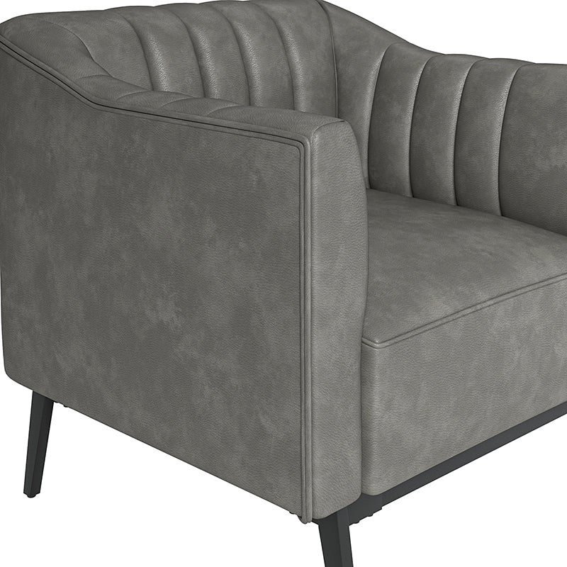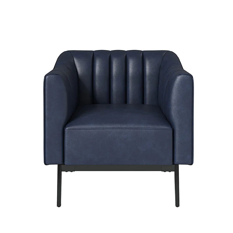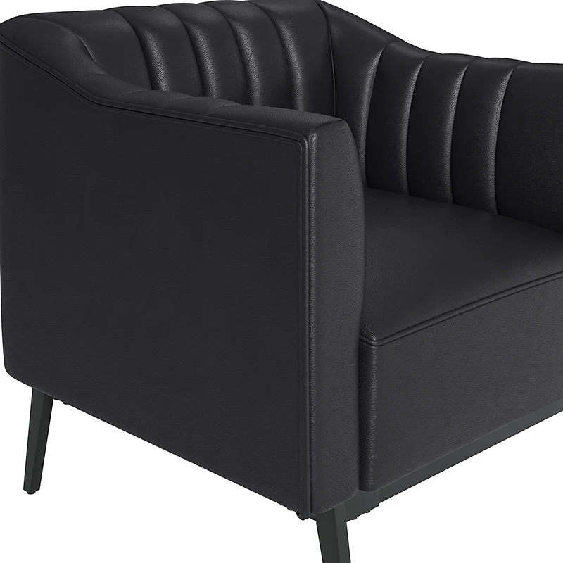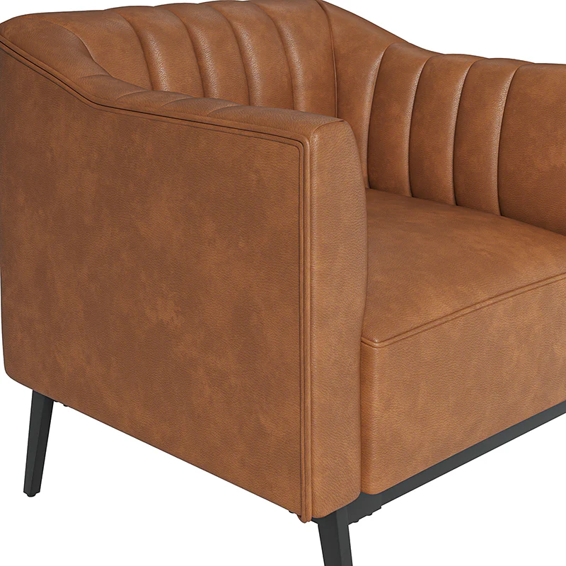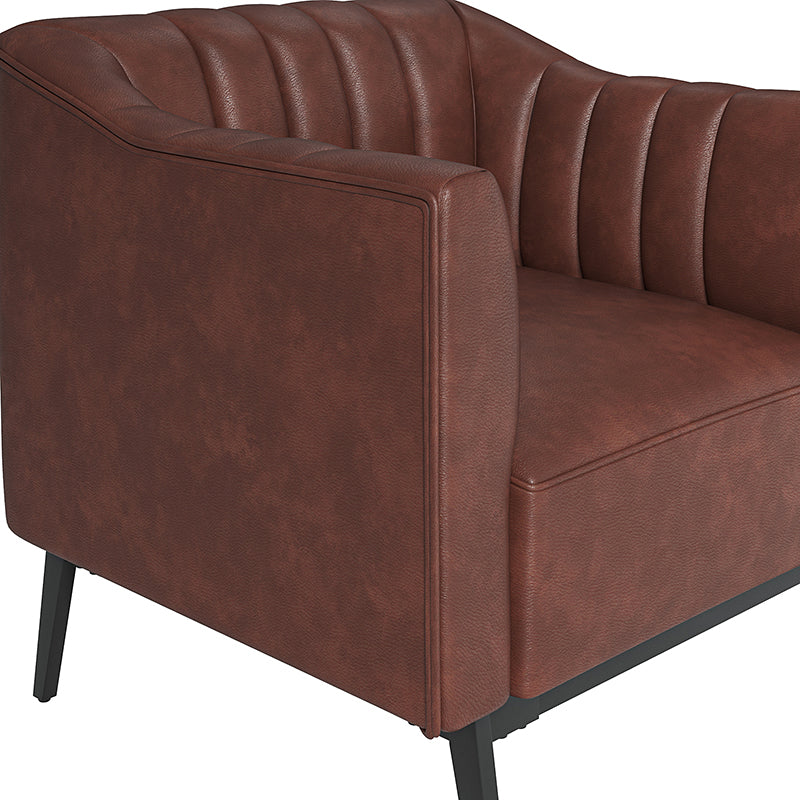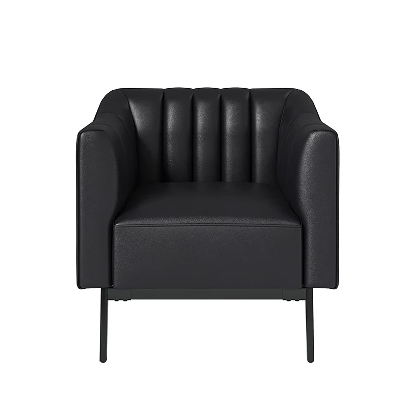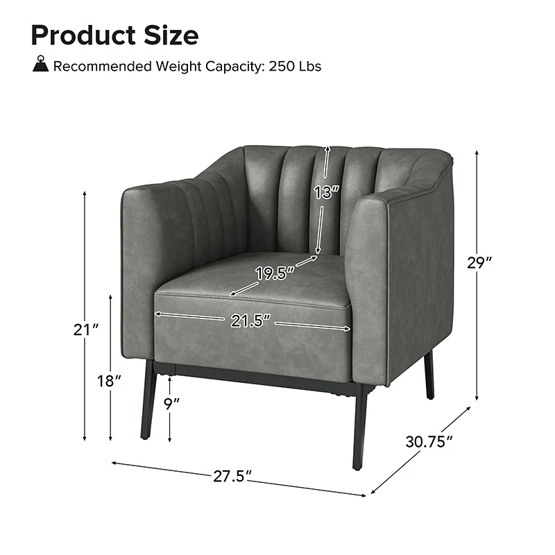 BImmerse yourself in the industrial chic with this exquisitely designed accent chair. Upholstered in quality PU leather, this chair is waterproof and easily cleanable surface ensuring a worry-free experience. Supported by sturdy metal legs, this chair offers reliable stability and robust support, ensuring longevity. The vertical channel tufting on the chair enhances both comfort and visual appeal, creating a visually appealing texture that complements the overall aesthetic. The solid back provides ample support and comfort, making it a good choice for long hours of relaxation or work. Elevate your living or office space with this practical chair that combines industrial charm with contemporary comfort.