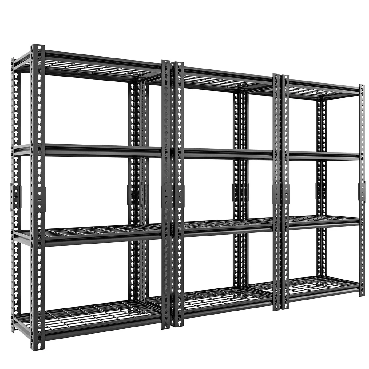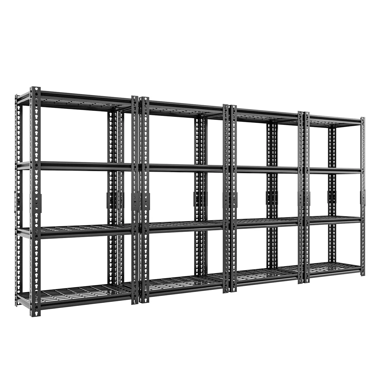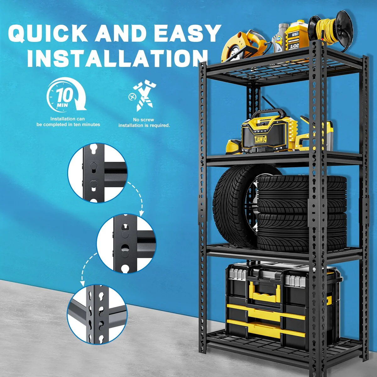 - 【STURDY AND DURABLE GARAGE STORAGE SHELVING】This heavy duty garage shelving is made of high quality steel and can hold up to 400 lbs per tier and up to 1600 lbs total for 4 tiers. The top and bottom parts of the shelves are connected by reinforced connecting buckles to ensure the shelves are incredibly stable. The perfect storage experience. The metal shelves are painted with anti-rust technology, easy to clean, moisture and rust resistant.