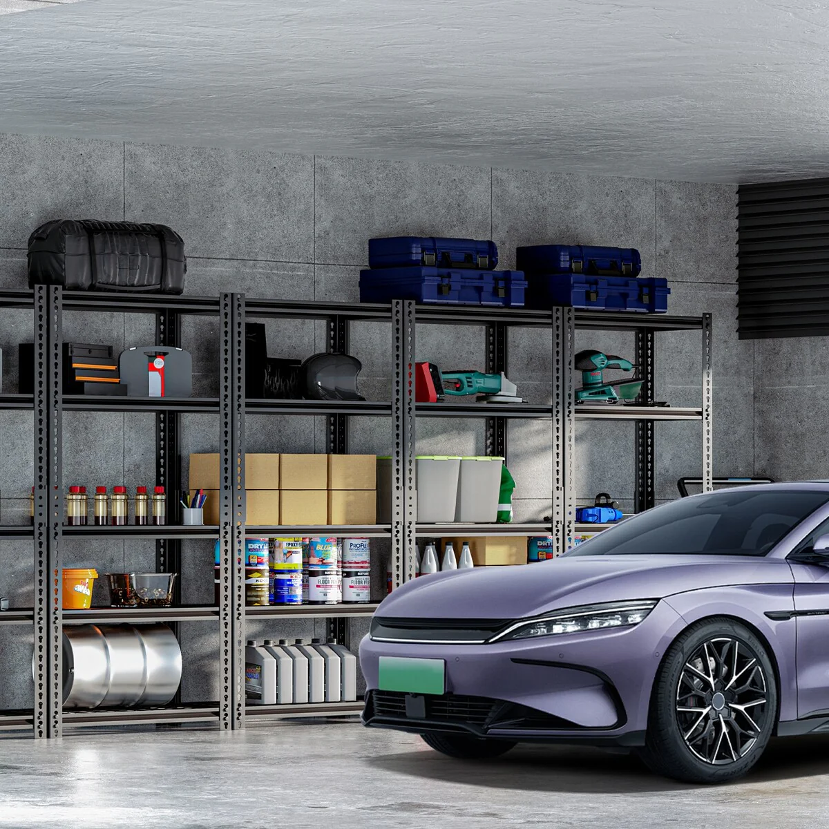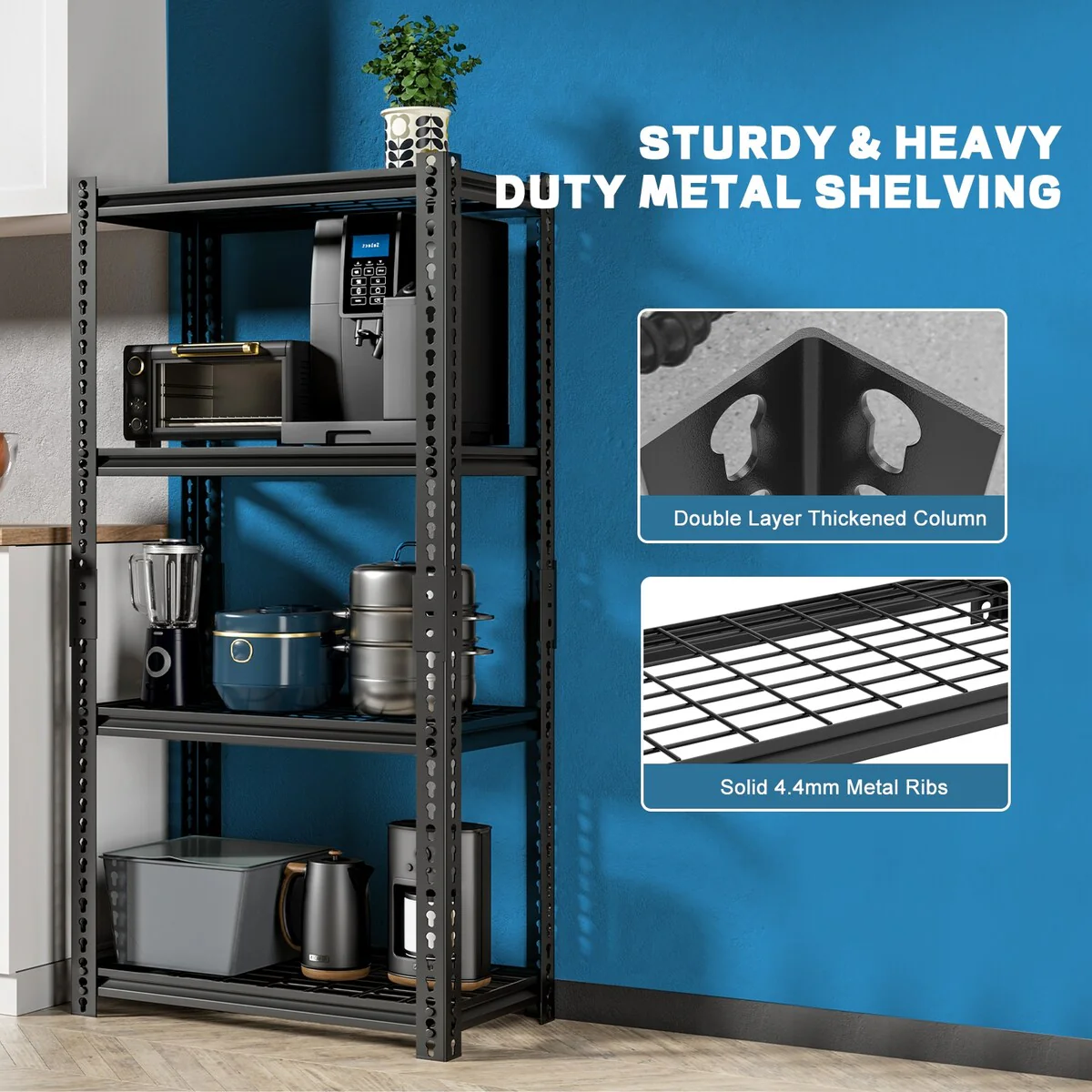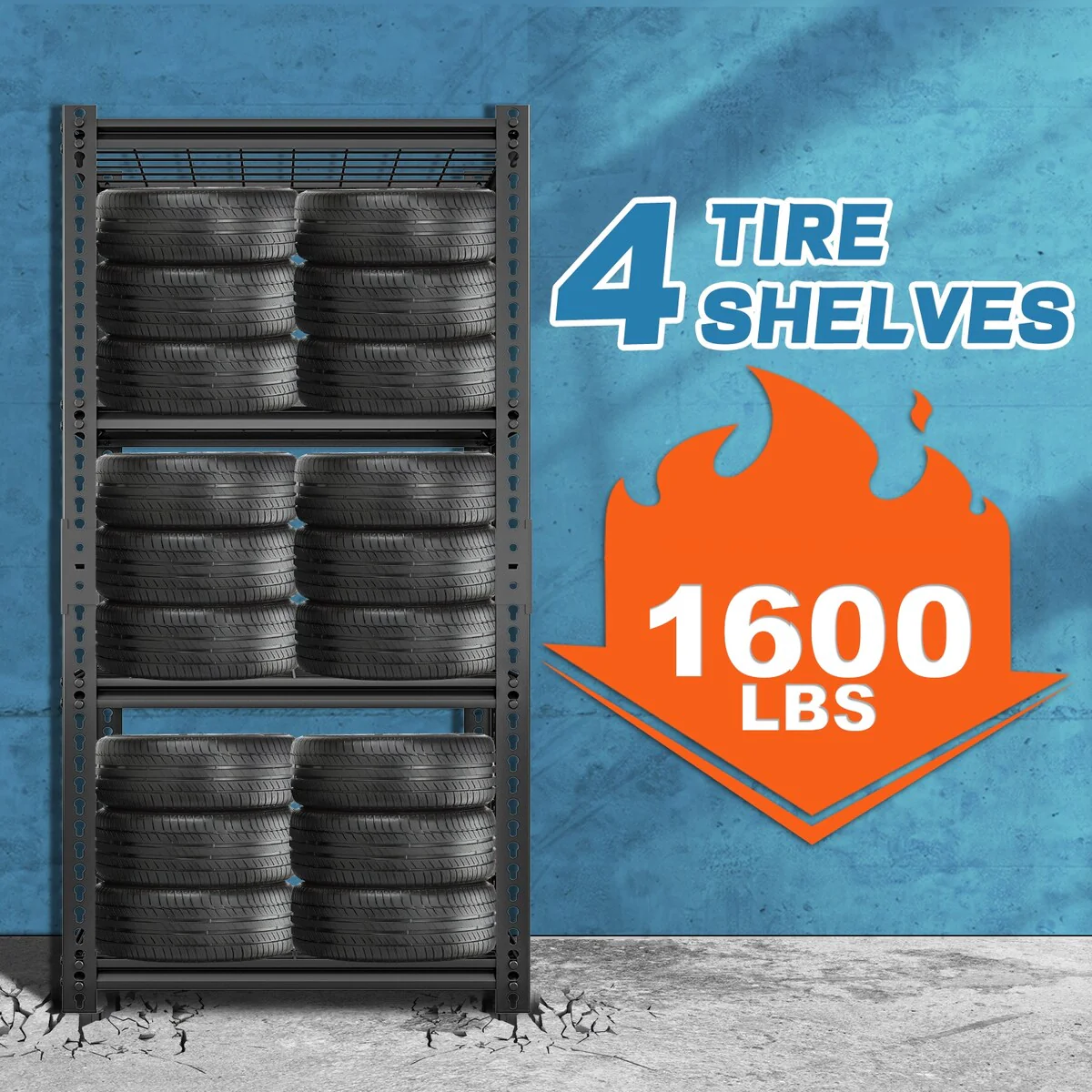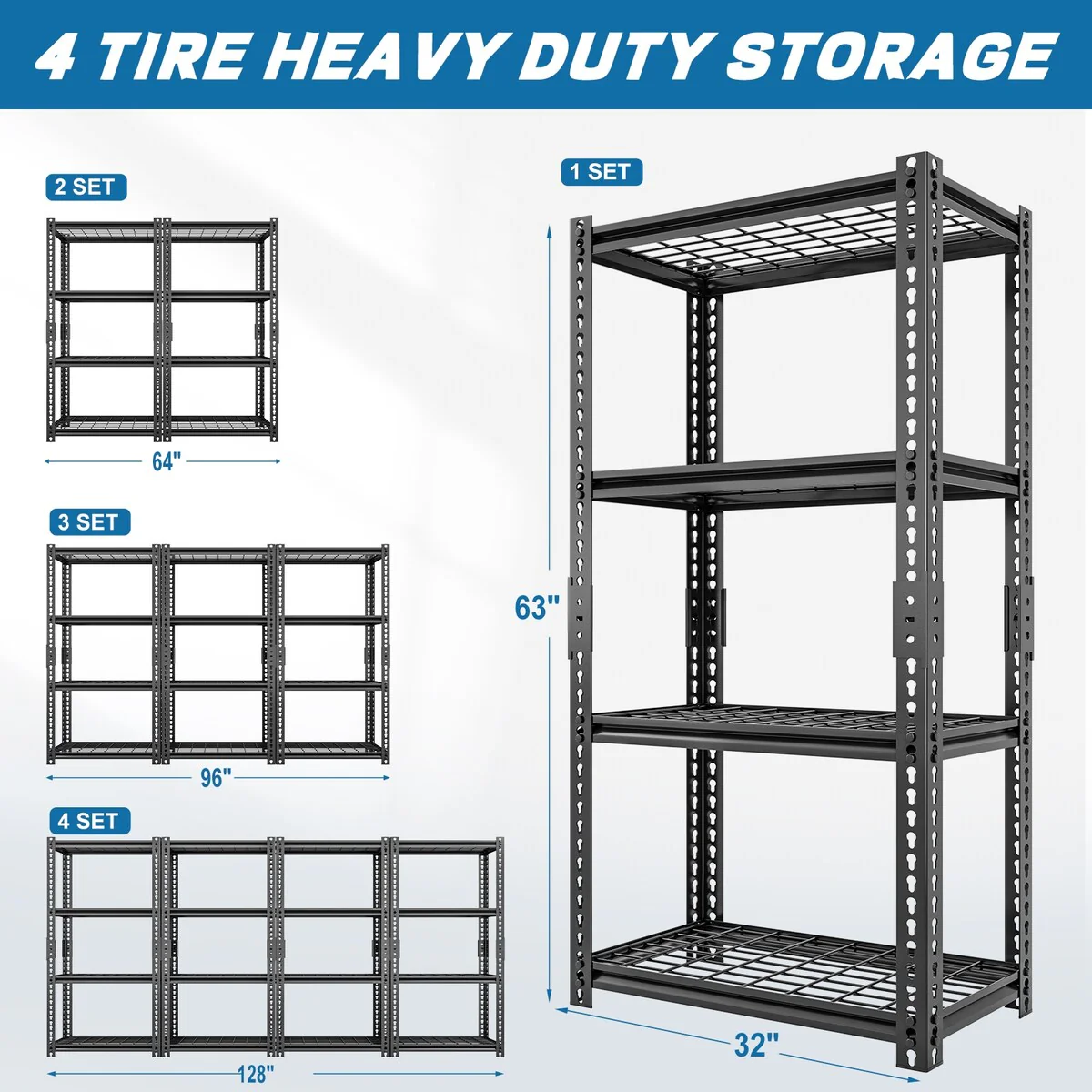 - 【STURDY AND DURABLE GARAGE STORAGE SHELVING】This heavy duty garage shelving is made of high quality steel and can hold up to 400 lbs per tier and up to 1600 lbs total for 4 tiers. The top and bottom parts of the shelves are connected by reinforced connecting buckles to ensure the shelves are incredibly stable. The perfect storage experience. The metal shelves are painted with anti-rust technology, easy to clean, moisture and rust resistant.