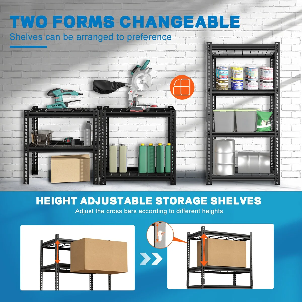 - 【HEIGHT ADJUSTABLE AND DISASSEMBLE INTO TWO SHELVING UNITS】The garage heavy duty shelves can be adjusted up and down by 1.6 inches to accommodate various sizes of items. It can also be assembled into two small storage shelves, arranged as a long table with storage space underneath, or as a workbench. You can customize the storage cabinet as you like.