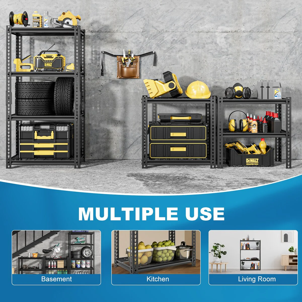 - 【MULTIPURPOSE METAL STORAGE SHELVING】Heavy duty garage shelving is suitable for garage, kitchen, warehouse, living room, bedroom, basement, workplace and so on. Adjustable garage shelves not only expand your storage space, but also keep the space tidy.