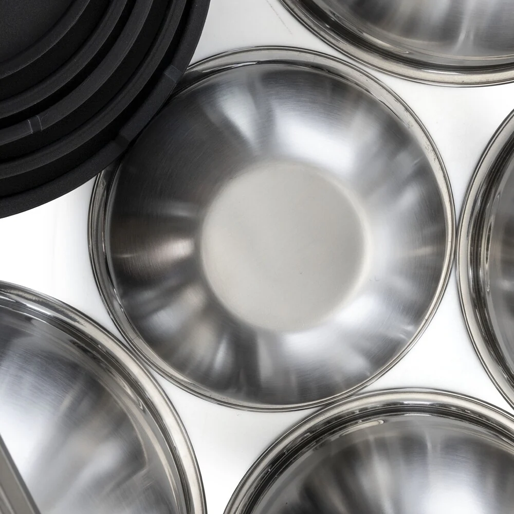 Mix, Measure and store it all in one bowl! With the MegaChef Multipurpose Mixing Bowl Set, you'll never have the need for any other bowls in your kitchen. Each piece includes a tight fit plastic lid that will insure freshness that lasts longer than your typical food storage sets. Features a non-slip silicone bottom and internal etched measuring system. Silicone bottoms keeping your bowls in place no matter how fast you mix. Internal etched measuring system takes the guessing game out so you never have to wonder how much is in the bowl. Constructed of high quality stainless steel, you can go from freezer to refrigerator, to oven and dishwasher without having to think twice! Rust an stain resist, lasting you a lifetime.Set: 5 Piece Mixing Bowls with LidsConstruction: Stainless Steel, Plastic, SiliconeFinish: Internal Mirror finish, Satin External FinishColor: Silver, BlackShape: RoundFreezer SafeRefrigerator SafeOven Safe BowlDishwasher Safe BowlNon-Slip Silicone BaseBPA Free LidsEtched MeasuringHand Wash Recommended for LidSet Includes:One 6Qt. Bowl with LidOne 5Qt. Bowl with LidOne 4Qt. Bowl with LidOne 3Qt. Bowl with LidOne 1.5Qt. Bowl with LidPer Item Measurements: