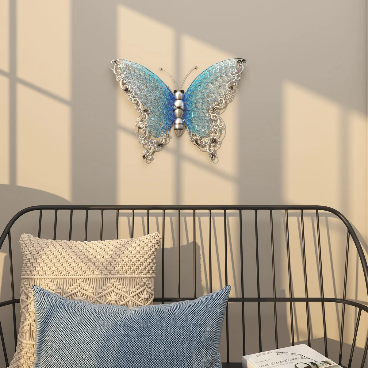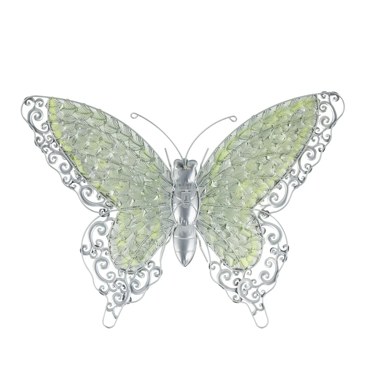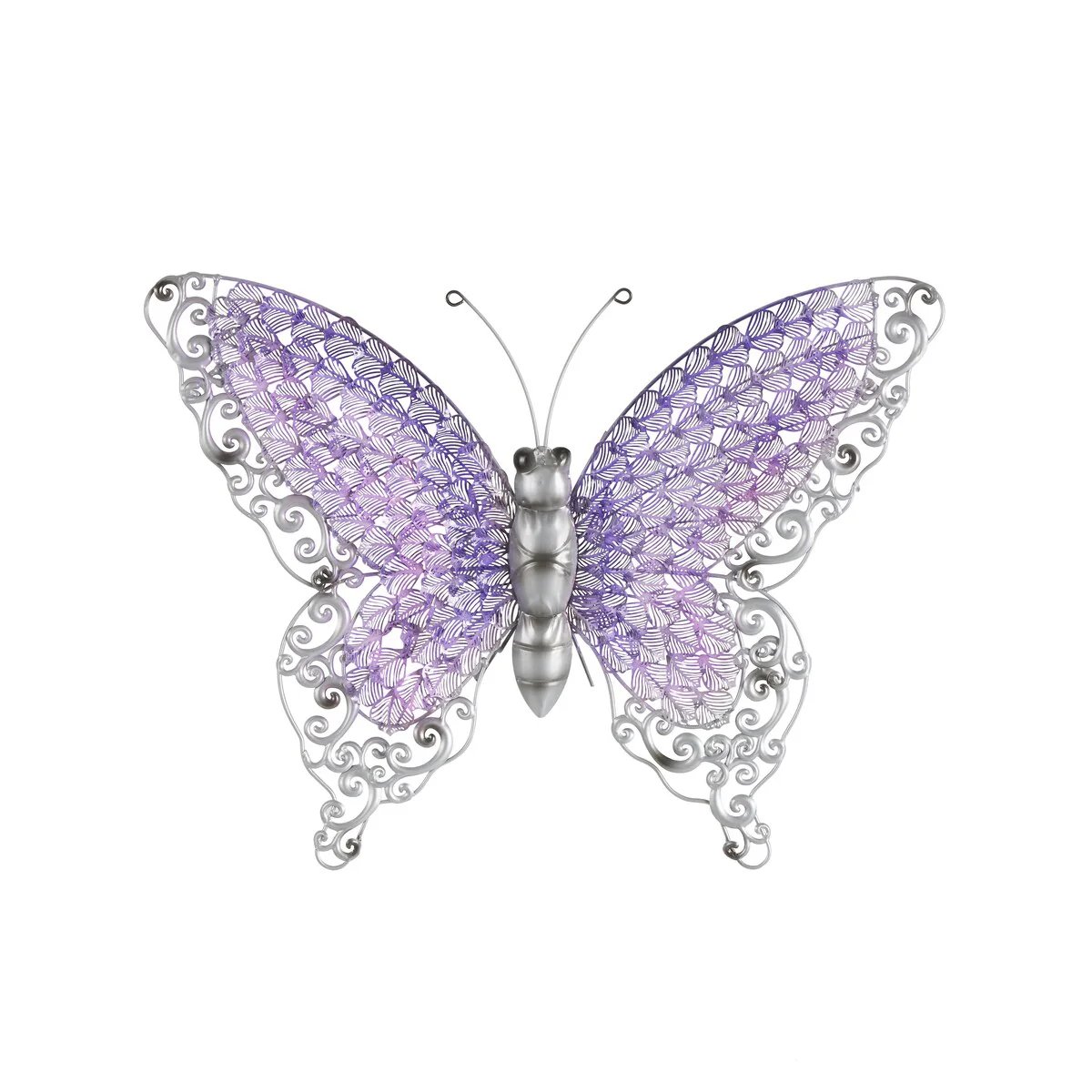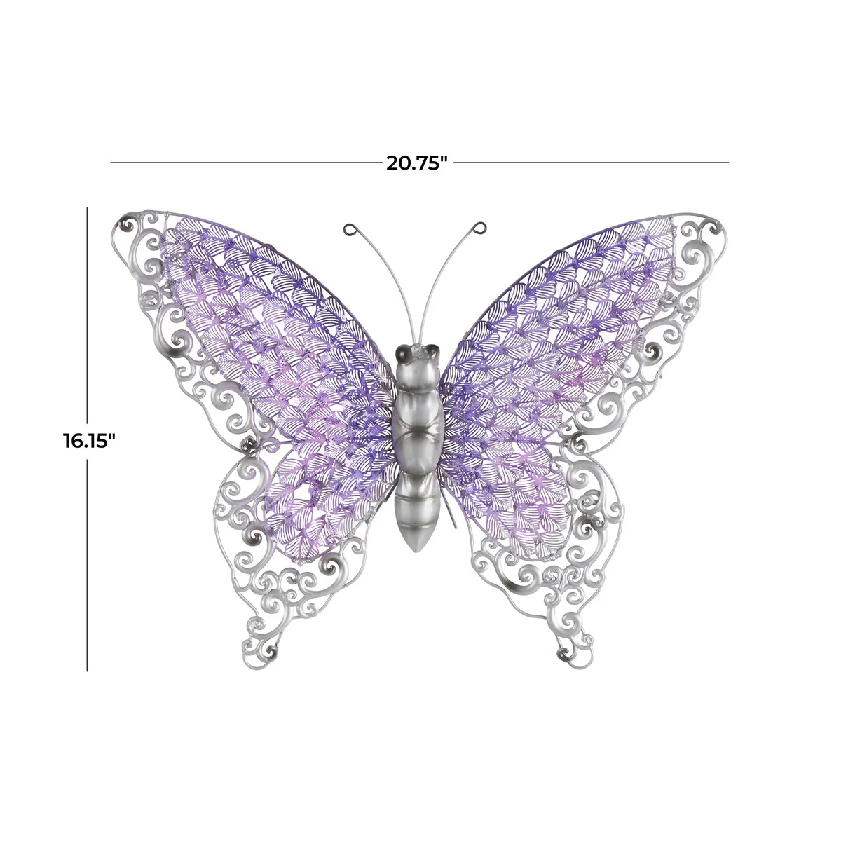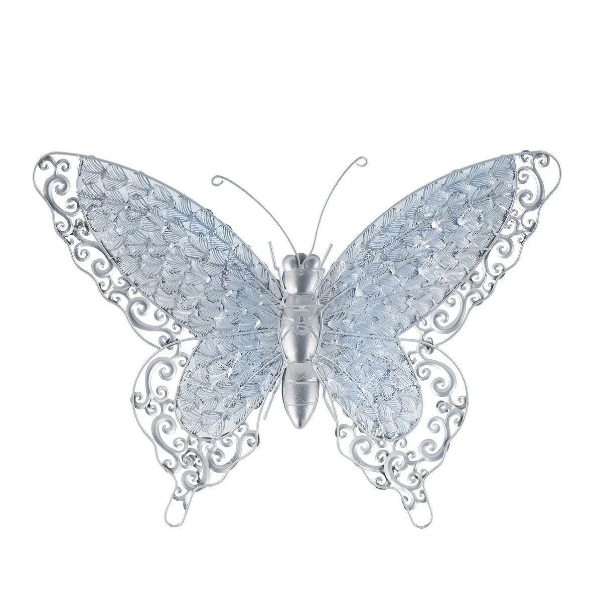 - This iron wall decor is intricately designed with flourish patterns on its wings and a ribbed tail in textured silver finish, along with four thin iron wire feet