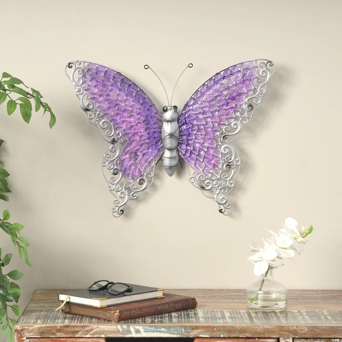 - Asymmetrical decor for wall displays a unique satin finish with blue, green, or pink wings, a silver body, and black highlights adding an eclectic touch to any space