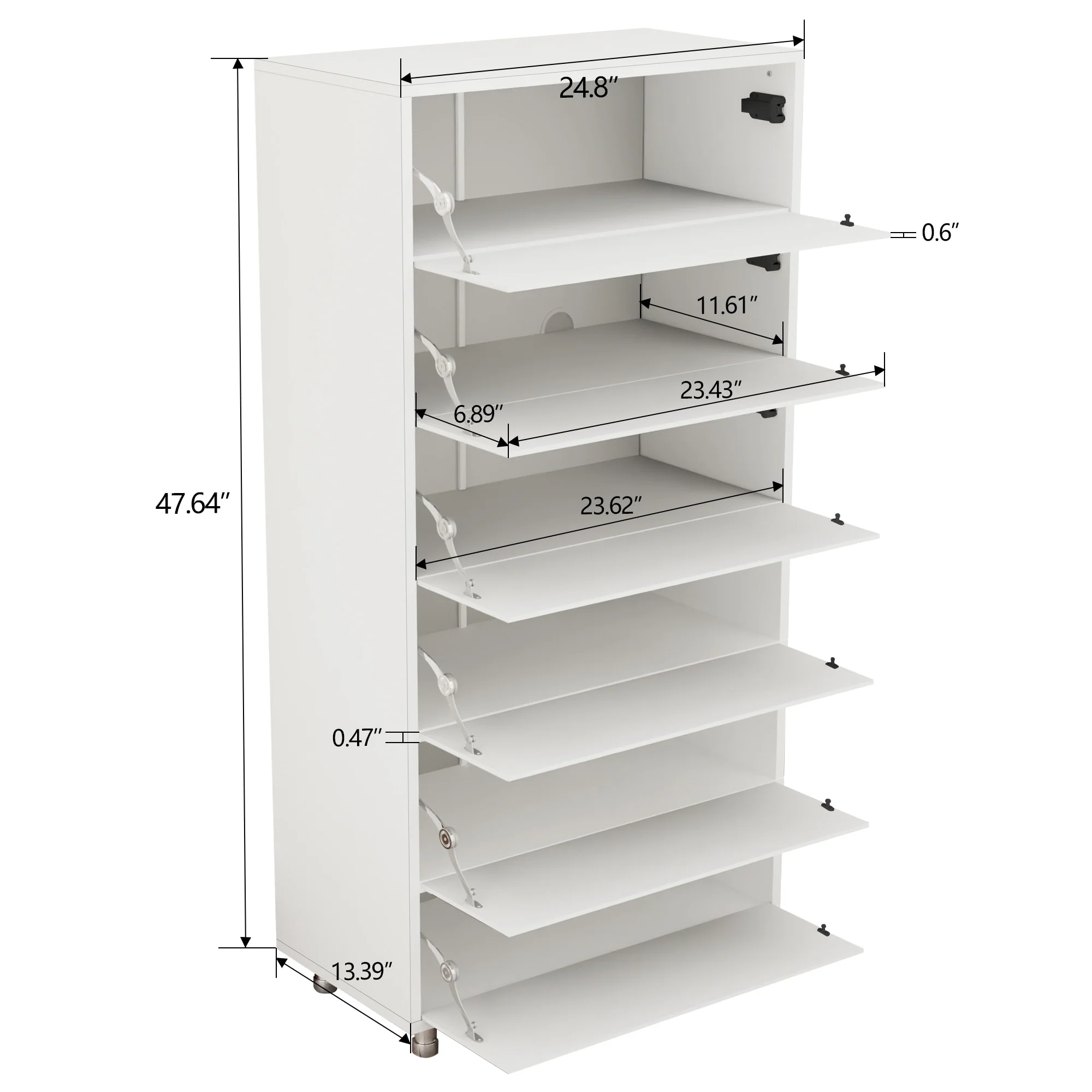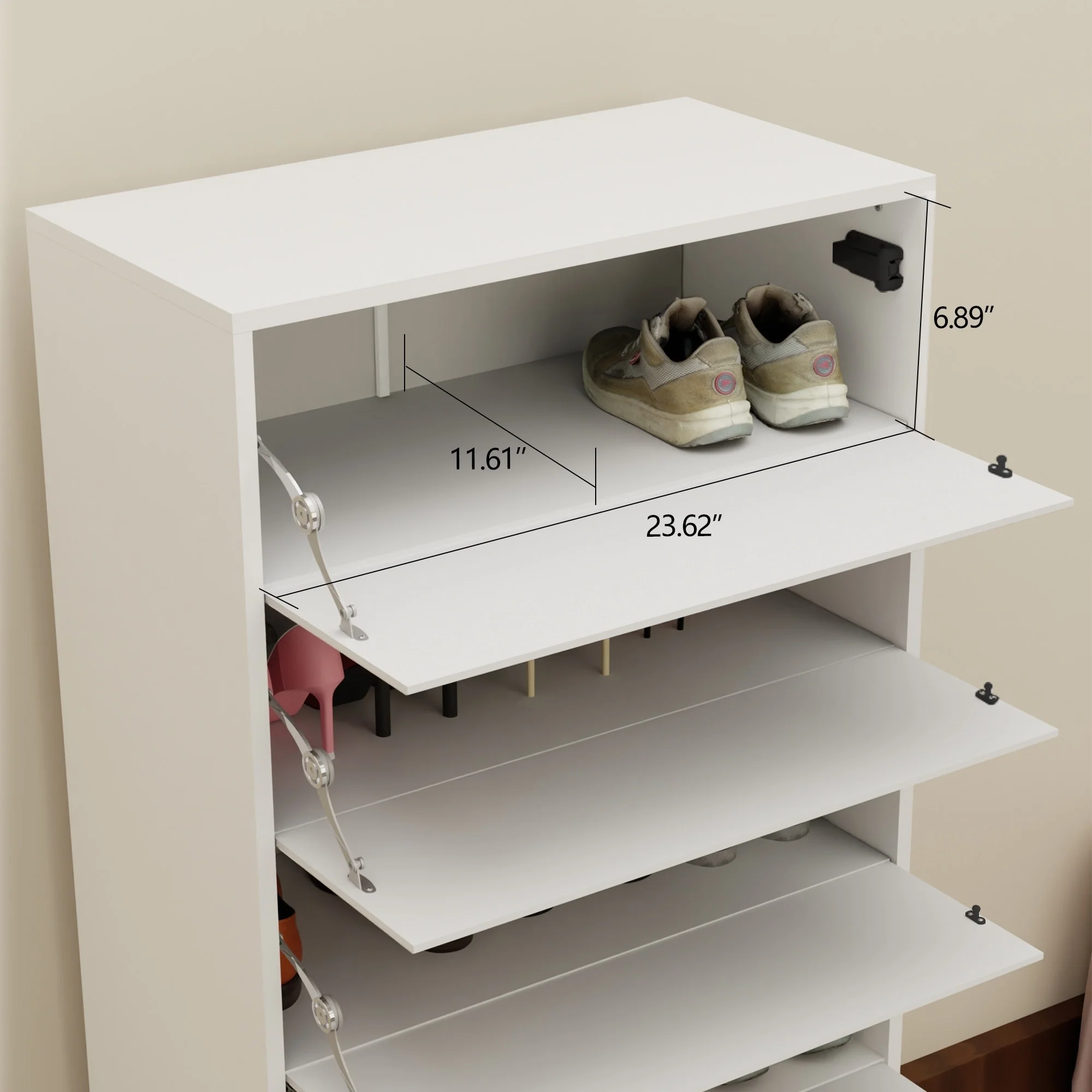 Flip-Down Drawers: Each drawer flips down, concealing the shoes inside to keep the home tidy. The drawers can accommodate large-sized shoes, with a total capacity of about 25 pairs.