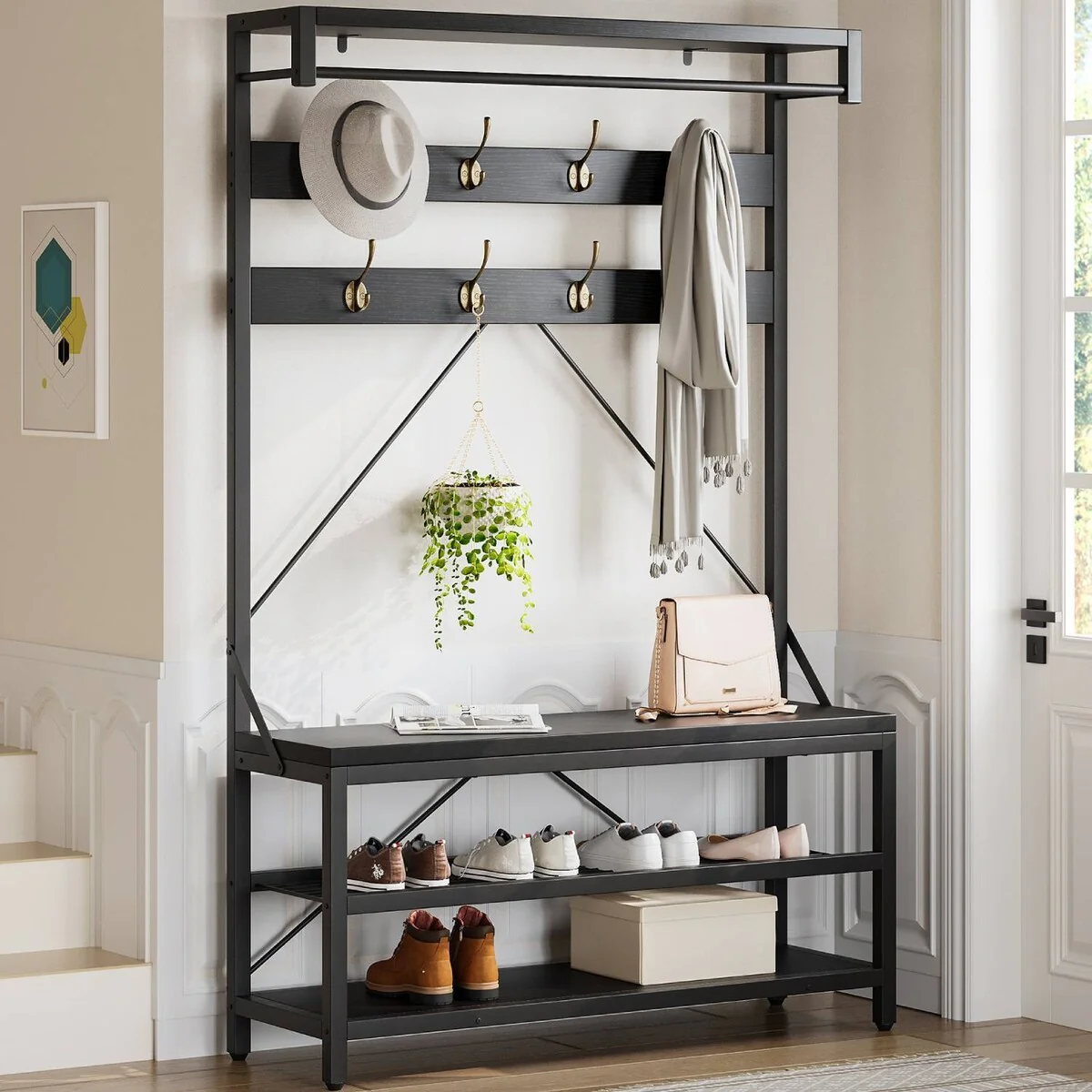 - Combines shelf, coat rack, and shoe storage bench for entryway organization