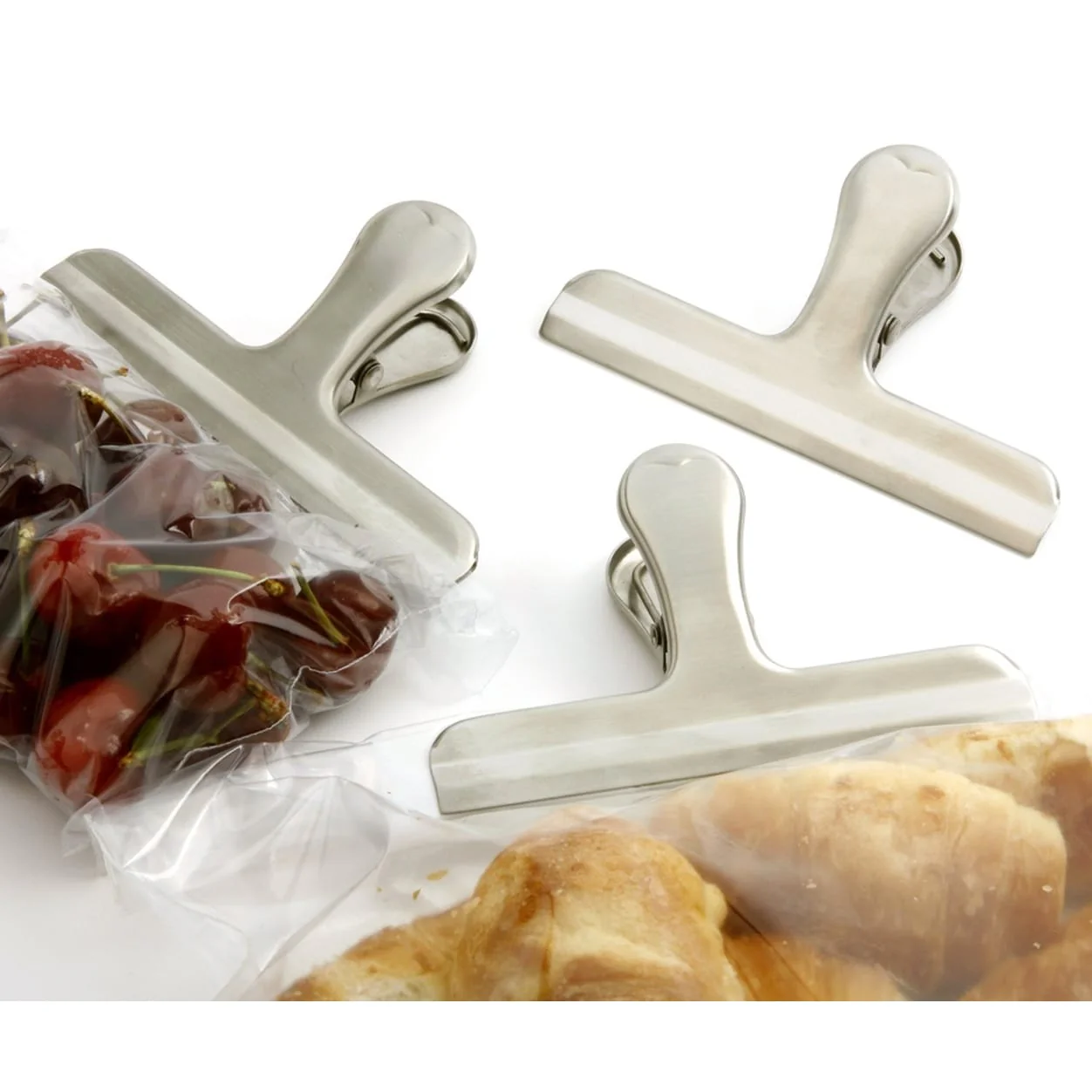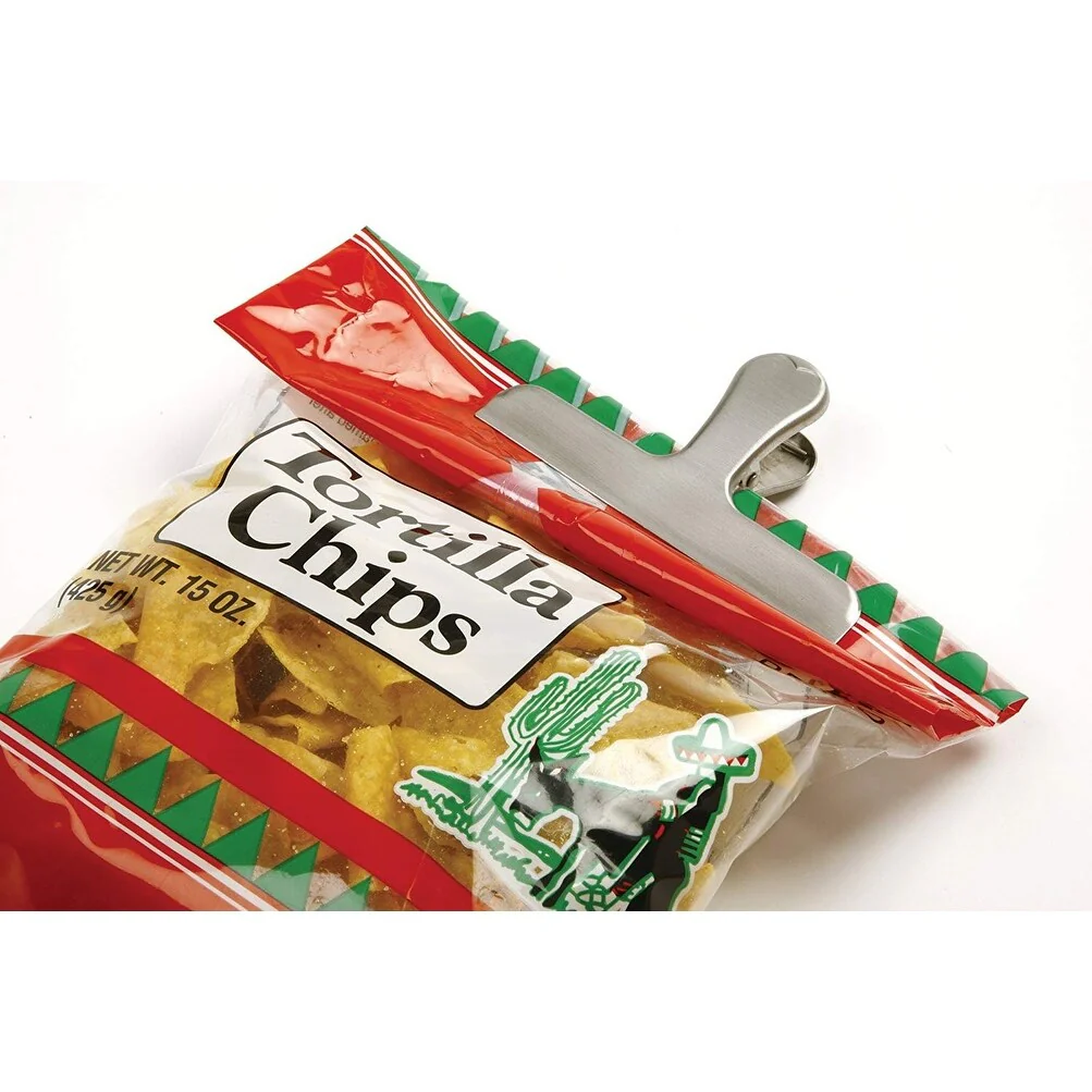 Strong, non-slip clip keeps open bags closed and air tight. Ideal for chips, coffee, bread, crackers, cookies and more. For best results, fold bag opening down and clip. Brushed stainless steel finish. Measures: 2.75" x 4.5" x 1.25 / 7cm x 11.5cm x 3cm.