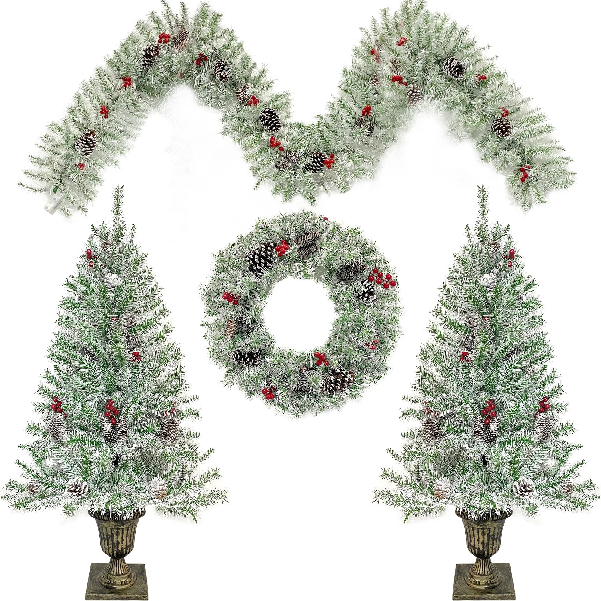 Transform your holiday decor with this complete 4-piece Pre-Lit Christmas Set, including two entrance trees, a garland, and a wreath. Each piece comes adorned with warm LED lights for a cozy, festive glow. Crafted from high-quality, fire-retardant PVC, this set is built for safety and durability, bringing festive cheer to any indoor space.
