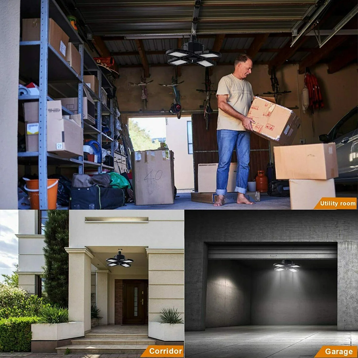 [Wide Coverage]: With 90° adjustable led panels, you can freely change the angle of this garage light to light up at least 270° area, which can have a perfect garage lighting distribution curve according to your application. Perfect for garage, warehouse, basement, supermarket, workshop, display area