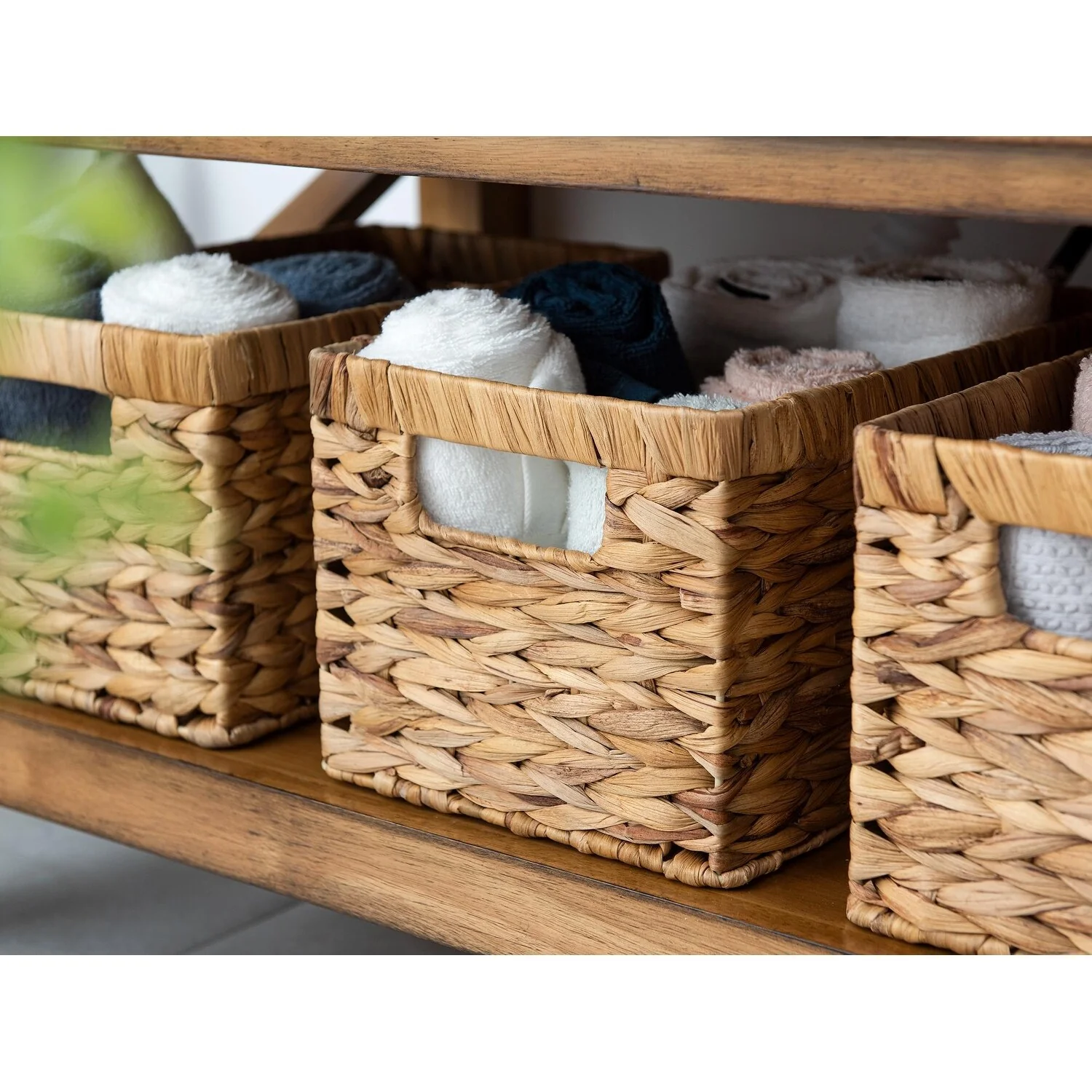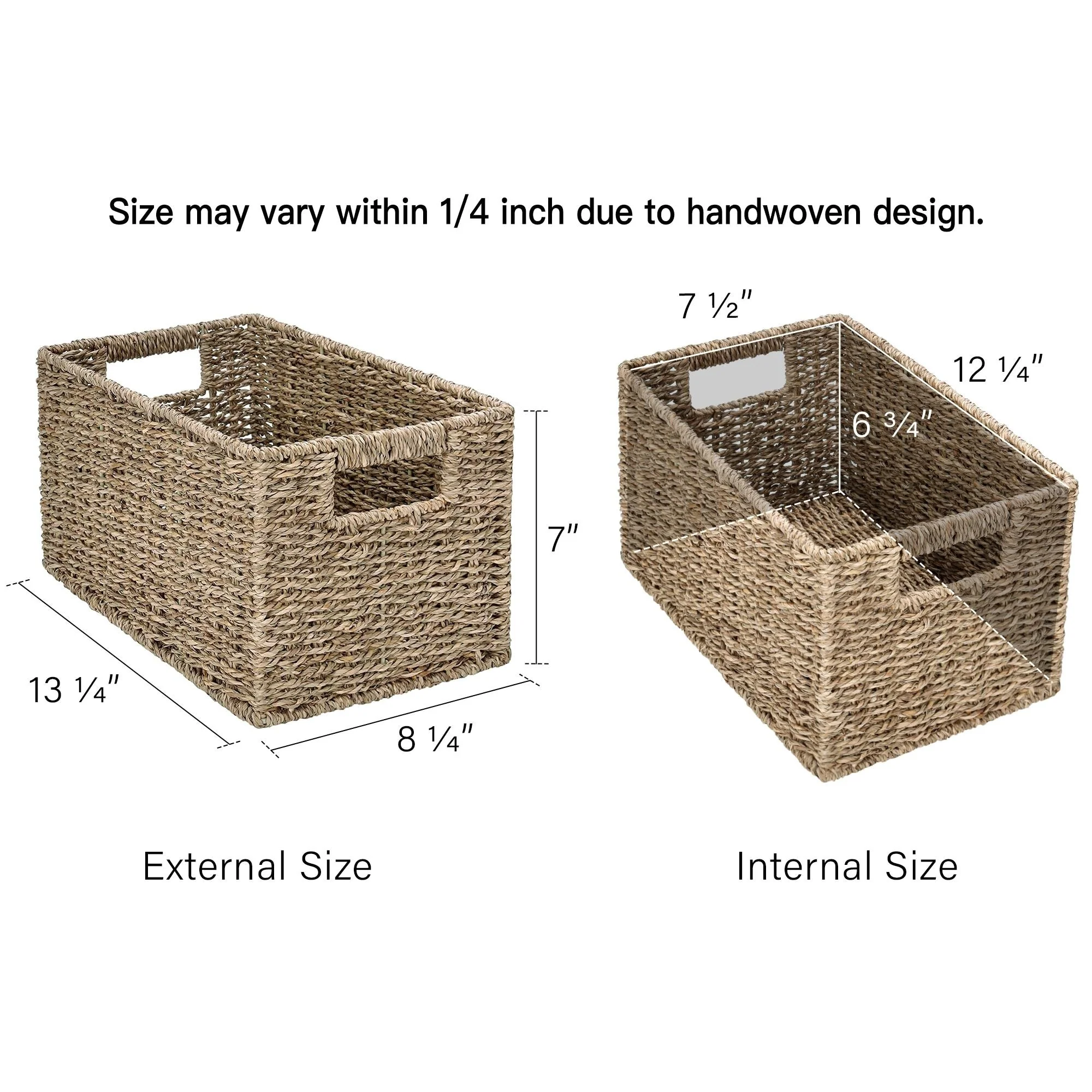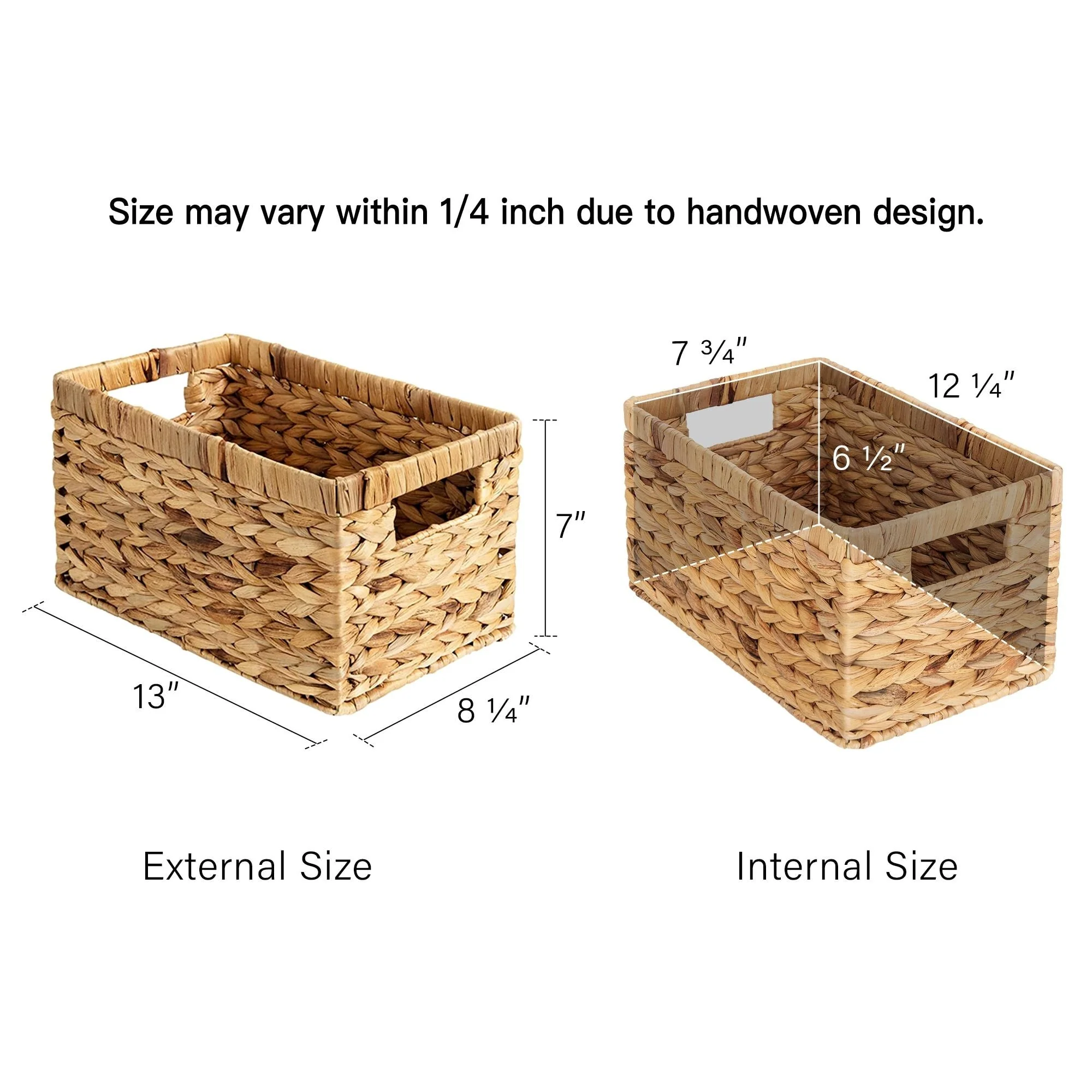 The handcrafted storage basket set is made of natural, clean, and sustainable materials (water hyacinth/seagrass/paper) and will keep your home looking attractive and organized. It is ideal for holding magazines, games, pet toys, media, household items or hand towels and amenities in the bathroom. Built-in handles are designed for easy carrying and comfortable grasping. The woven basket measures 13 inches L x 8 inches W x 7 inches H. Due to the handmade design, there may be a 1/4-inch variation in size.