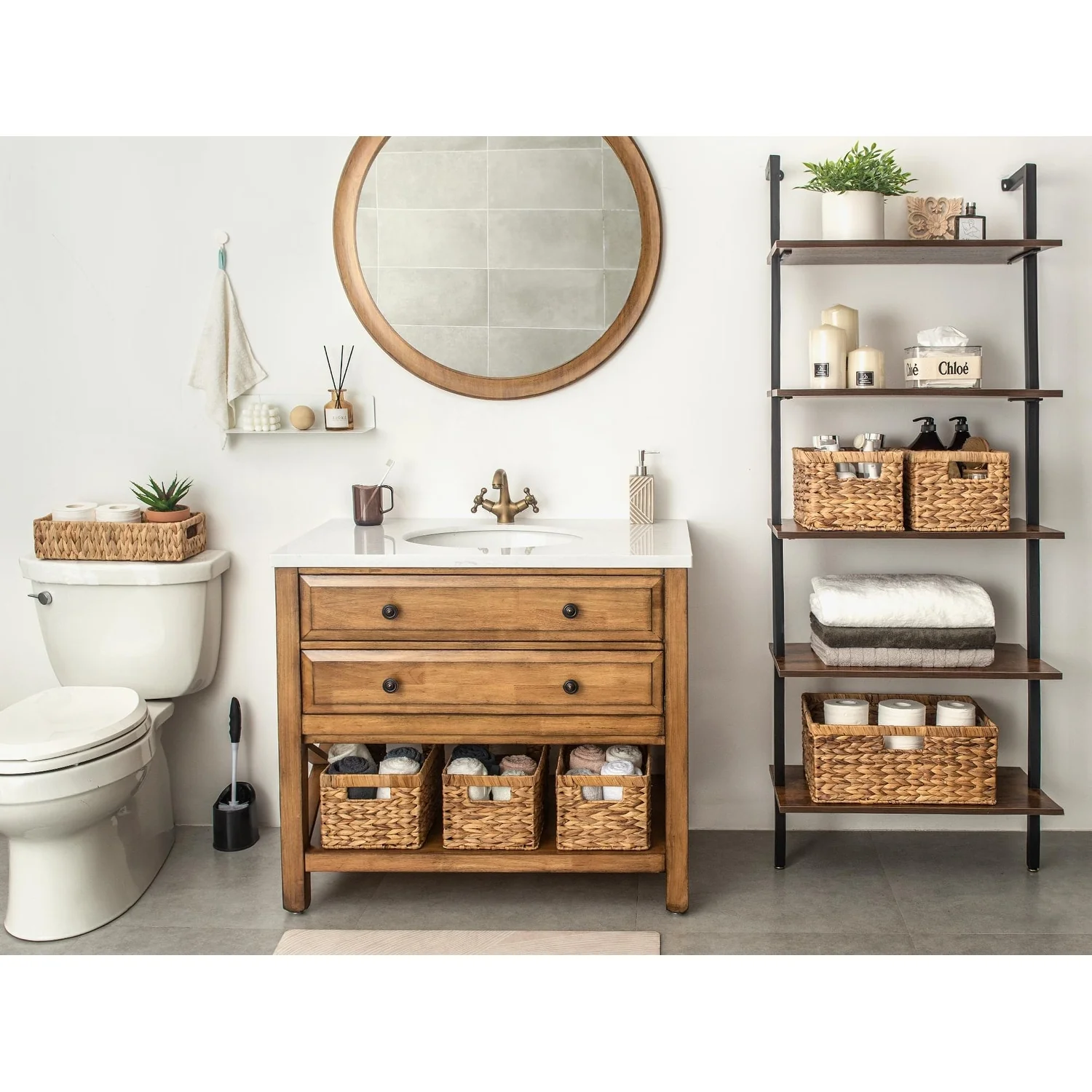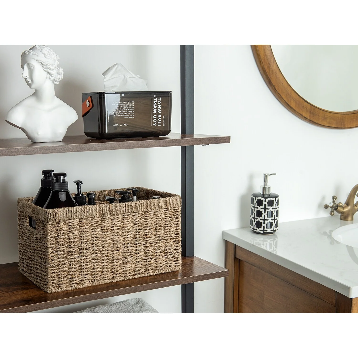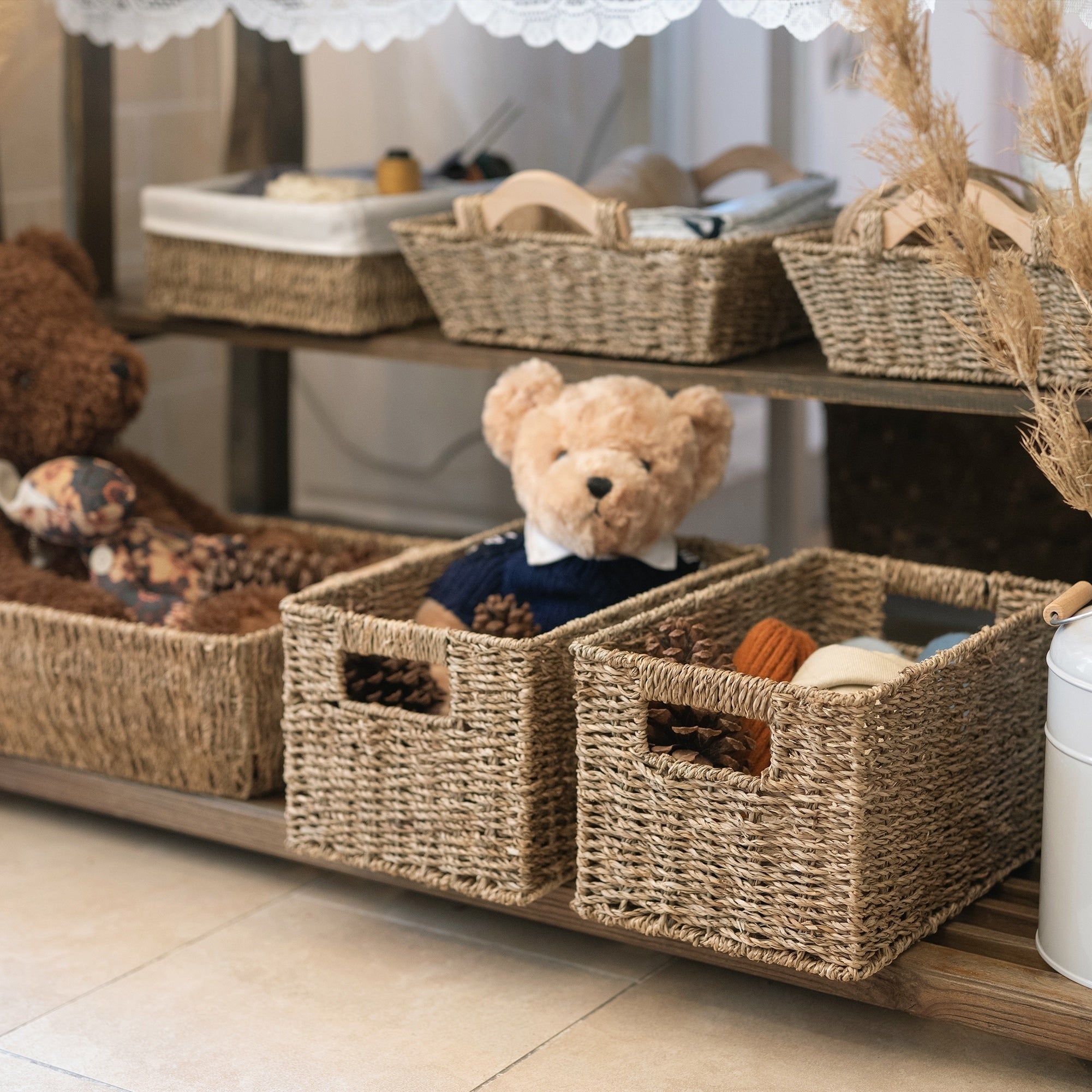 The handcrafted storage basket set is made of natural, clean, and sustainable materials (water hyacinth/seagrass/paper) and will keep your home looking attractive and organized. It is ideal for holding magazines, games, pet toys, media, household items or hand towels and amenities in the bathroom. Built-in handles are designed for easy carrying and comfortable grasping. The woven basket measures 13 inches L x 8 inches W x 7 inches H. Due to the handmade design, there may be a 1/4-inch variation in size.