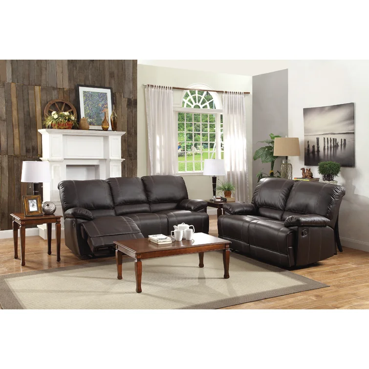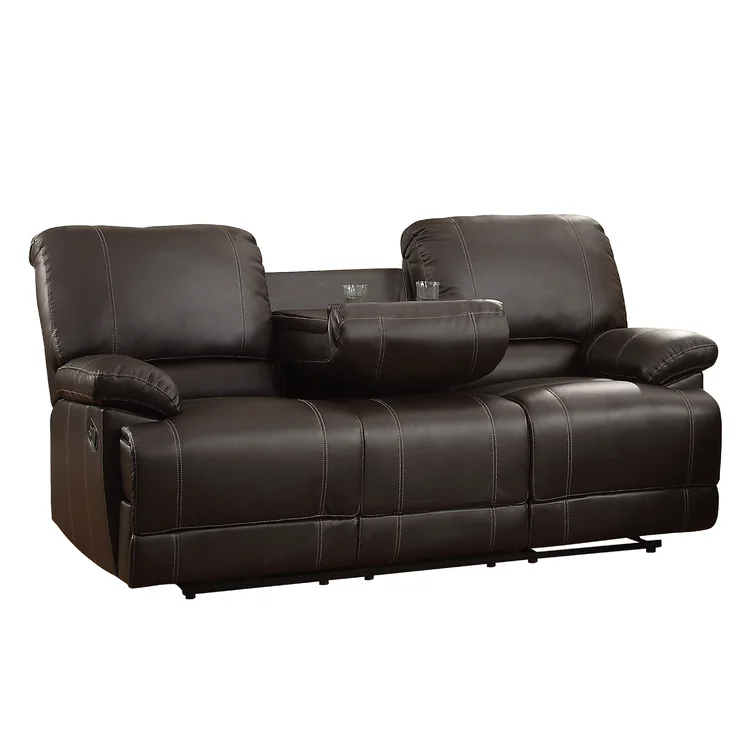 This reclining sofa brings versatile seating to your living space. Made in the USA from metal and a blend of solid and engineered wood, it stands on a plastic base in a black finish. This couch features three reclining seats with split backs and pop-out footrests, each one controlled manually with included levers. Wrapped in 100% polyester upholstery, its foam- and synthetic fiber-filled cushions support you as you sit up or lay down. This sofa's high backs and pillow-top arms create an inviting look. Best of all, no assembly is required: All you need to do is relax.
