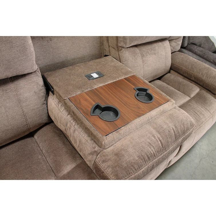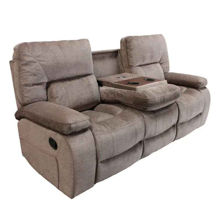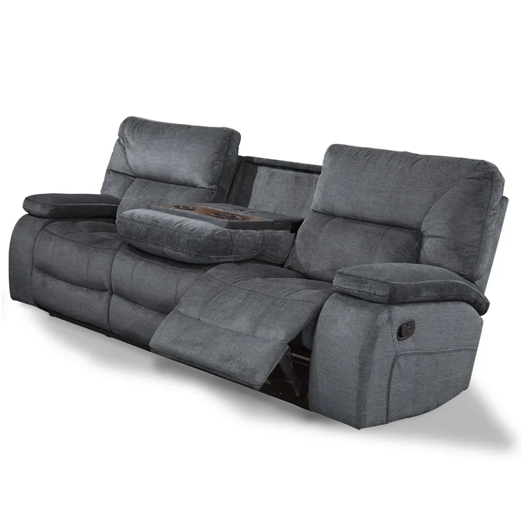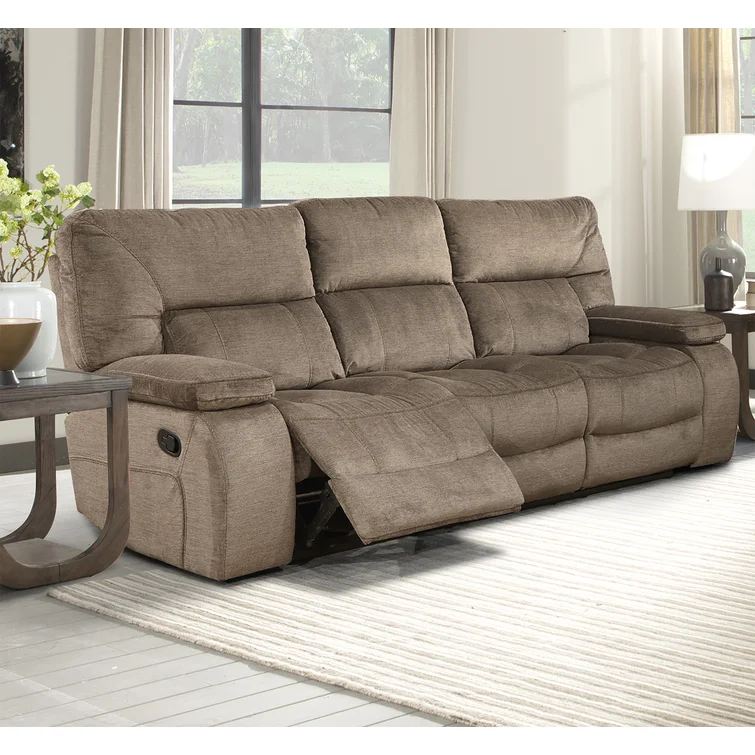 This reclining sofa brings versatile seating to your living space. Made in the USA from metal and a blend of solid and engineered wood, it stands on a plastic base in a black finish. This couch features three reclining seats with split backs and pop-out footrests, each one controlled manually with included levers. Wrapped in 100% polyester upholstery, its foam- and synthetic fiber-filled cushions support you as you sit up or lay down. This sofa's high backs and pillow-top arms create an inviting look. Best of all, no assembly is required: All you need to do is relax.