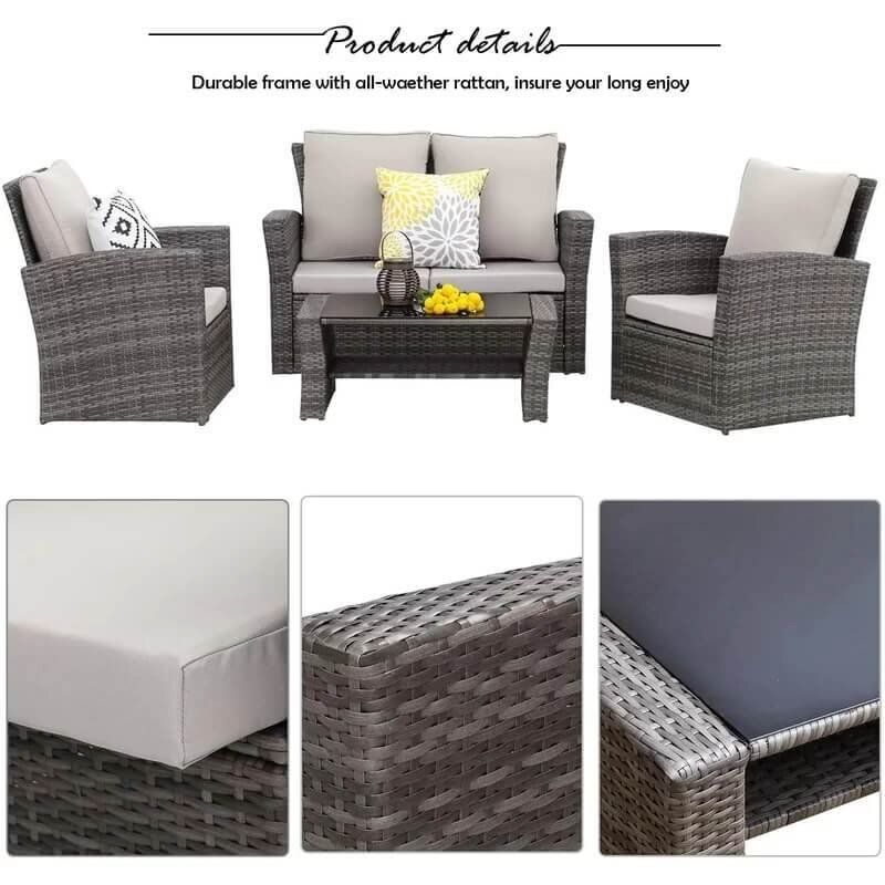 Description?This 5 piece wicker furniture set is an attractive and durable furniture sets. Thick lofty sponge padded cushions and commercial grade hand woven PE rattan wicker provide luxurious comfort and enjoyment to you.Features