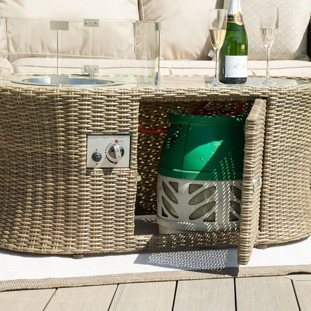 Our classic Winchester Large Corner Sofa Set is now available with a warming Fire Pit Coffee Table. The beige coloured cushions sit perfectly with the weave. creating a modern. elegant style. The Winchester Large Corner Group is recognisable for its signature curved arms and backs. This set is modular and can be positioned with the longer side on either the left or right. The Fire Pit Coffee Table is perfect for use on cooler evenings. All our fire pit systems are CE registered and will accommodate a 5kg green patio gas bottle which can be stored underneath the table. We anticipate each gas bottle will last for approximately 6-7 hours.