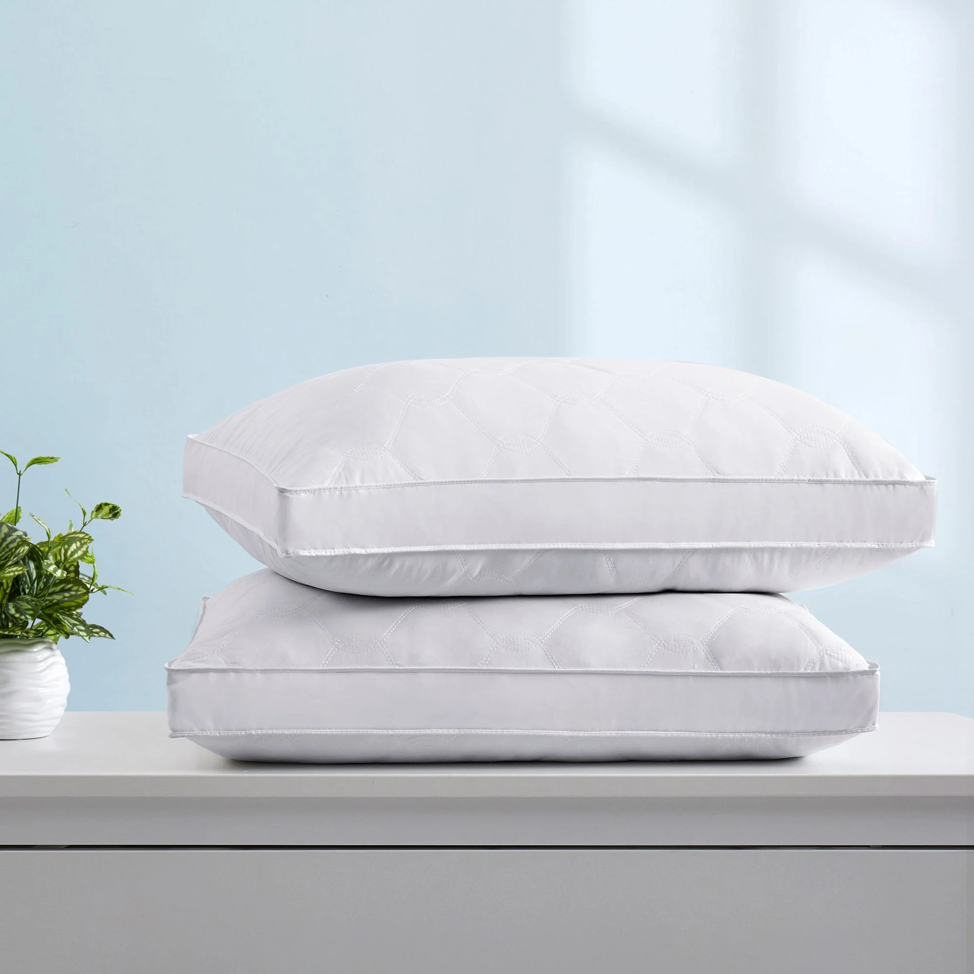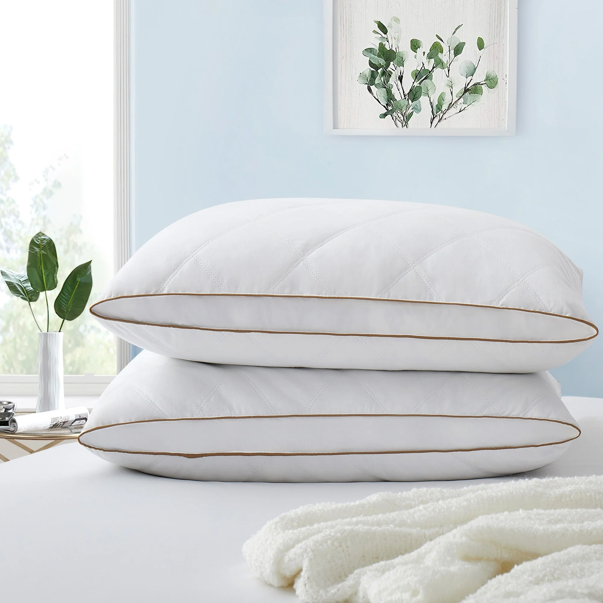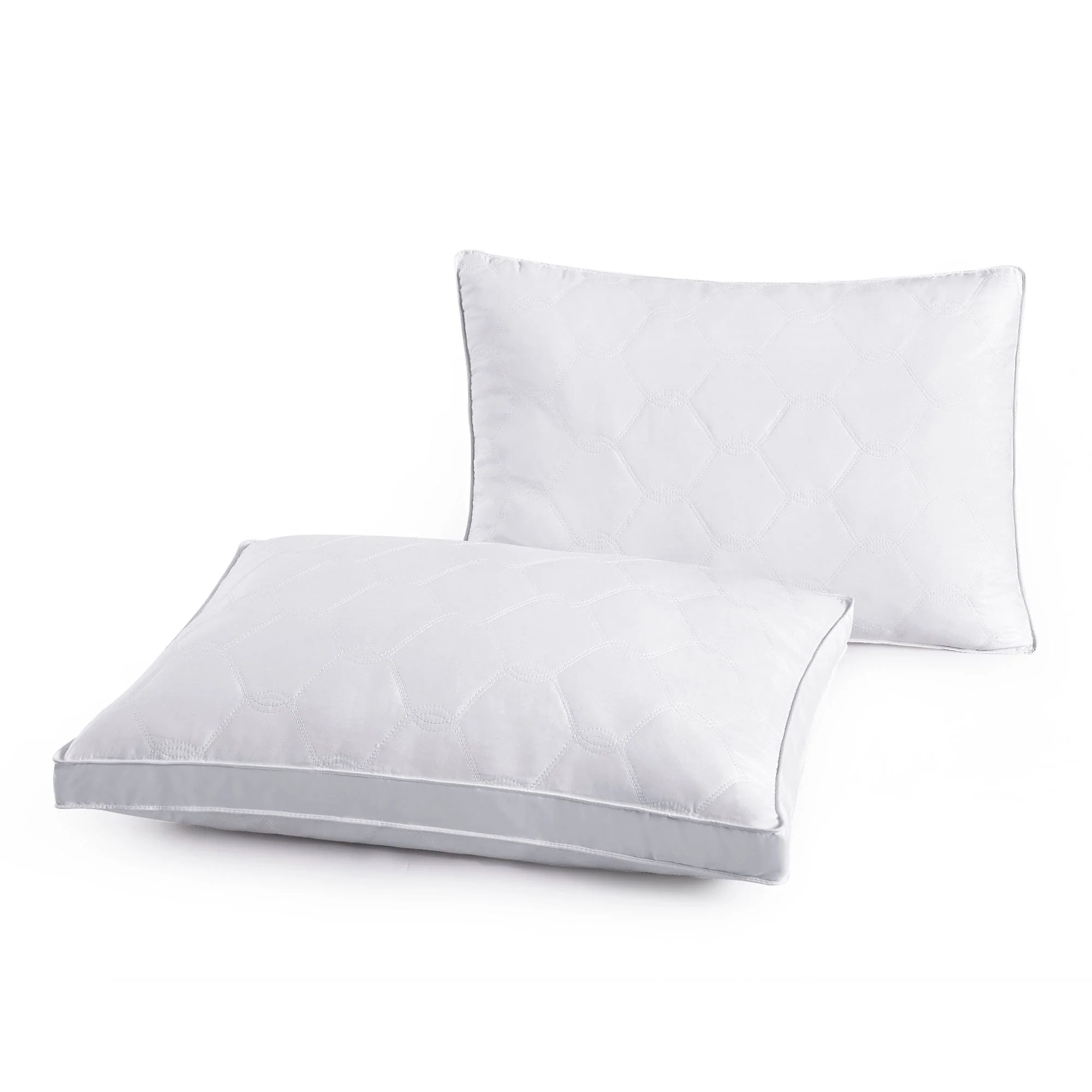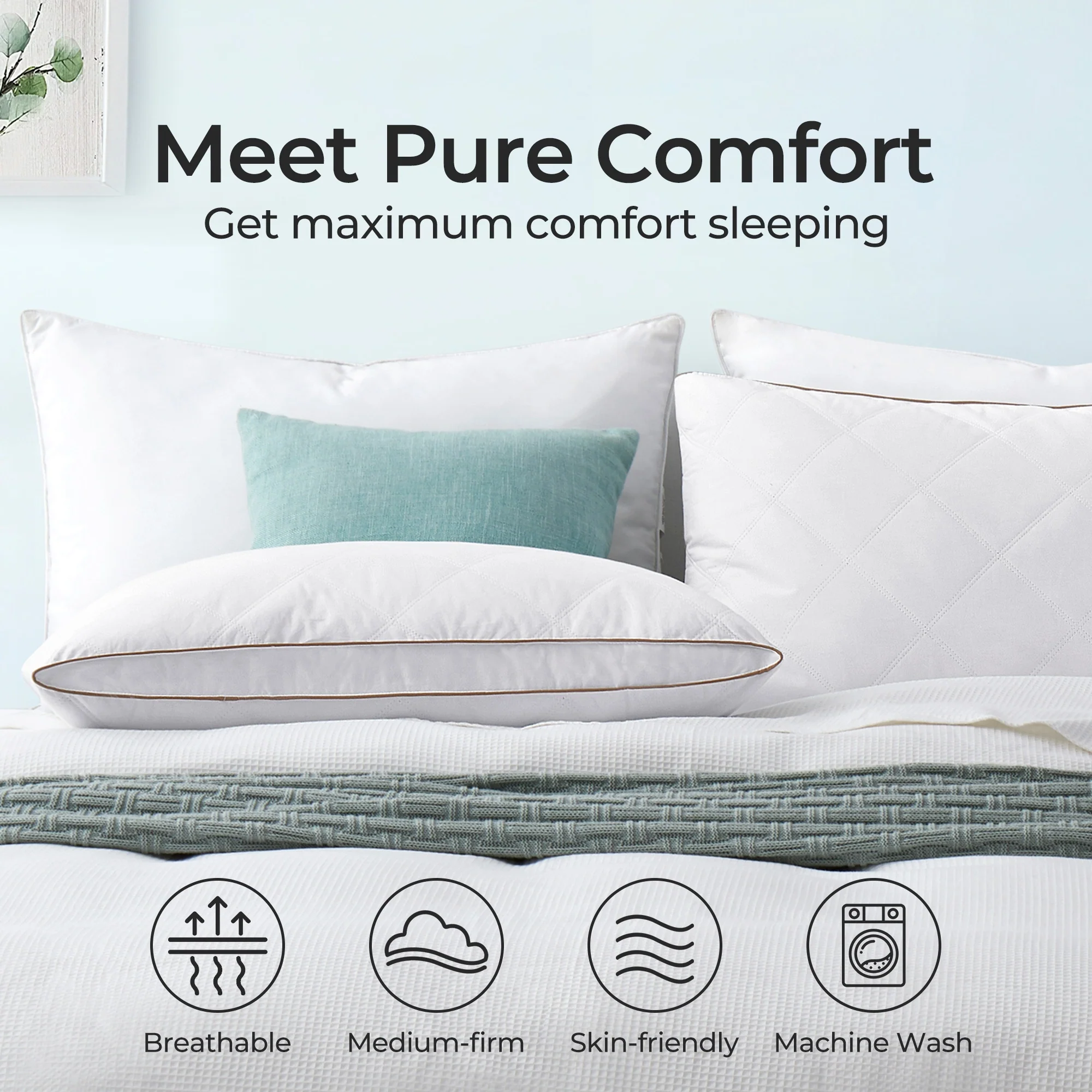 This premium bed pillow is designed to perfectly support your sleeping position, providing a luxurious sleep experience. Featuring a 2-inch gusset and elegant white rhombic quilting, the pillow is filled with 95% goose feathers and 5% goose down, offering a balance of comfort and support. The medium firmness is ideal for side and back sleepers, giving your head a soft yet supportive cradle. Choose from a polyester cover for medium density or a cotton cover for medium-firm density. The medium density pillow has a classic gusset with white piping, while the medium-firm option has an oval gusset with brown piping. Both are machine washable and tumble dry on low for easy maintenance. Enjoy restful, rejuvenating sleep with this thoughtfully crafted pillow.