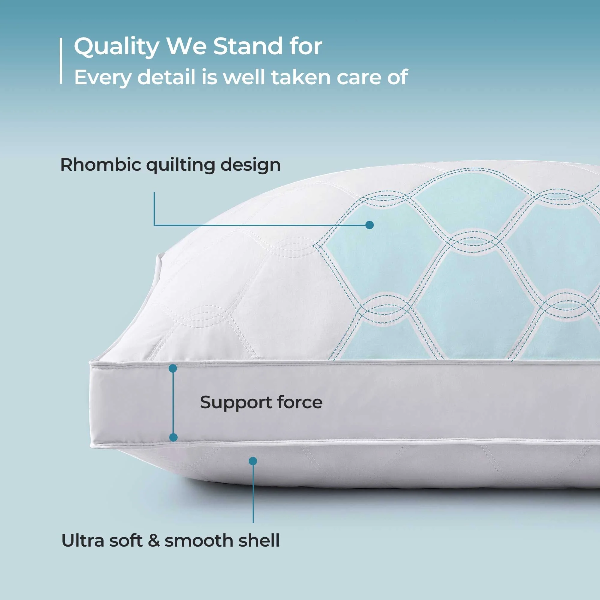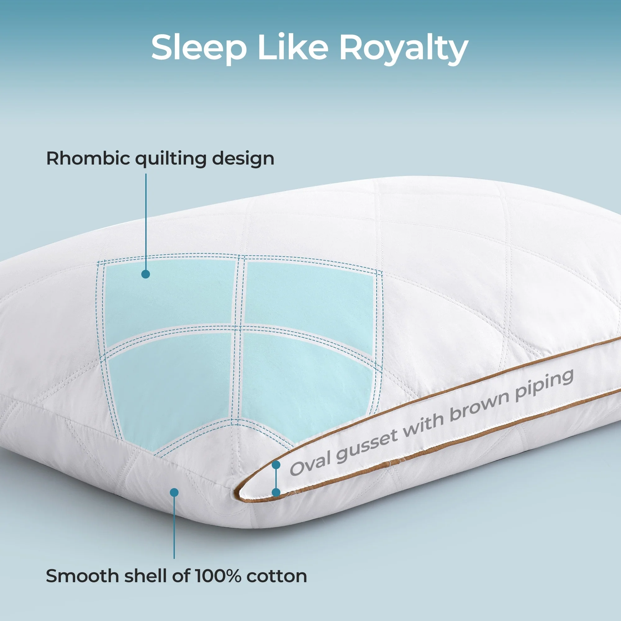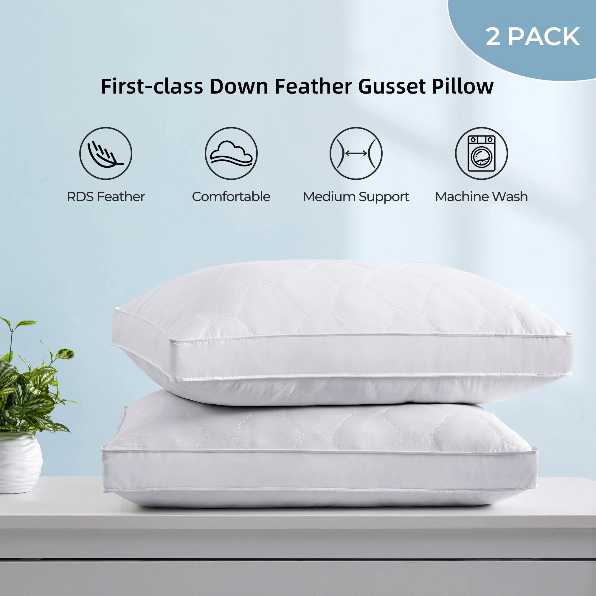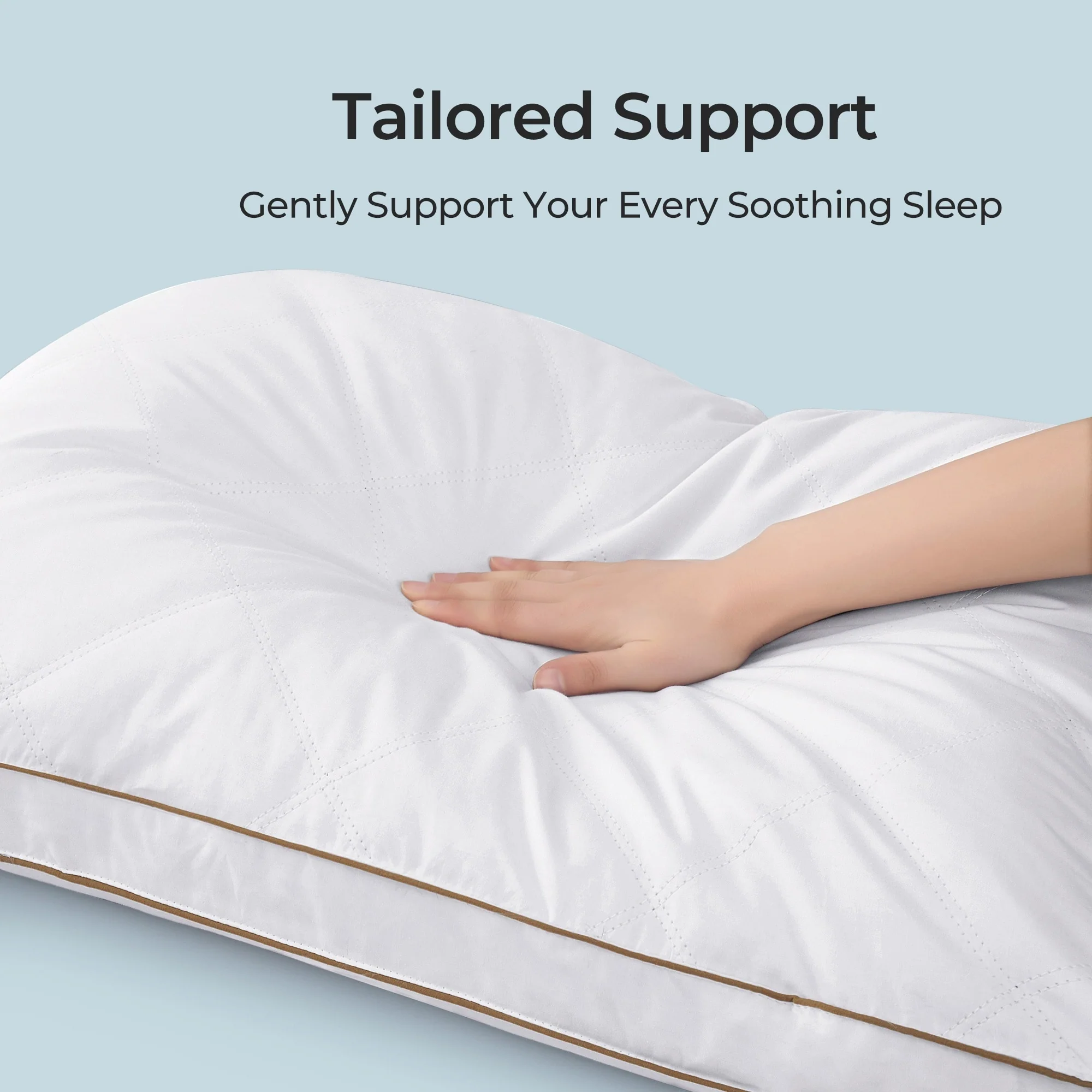 This premium bed pillow is designed to perfectly support your sleeping position, providing a luxurious sleep experience. Featuring a 2-inch gusset and elegant white rhombic quilting, the pillow is filled with 95% goose feathers and 5% goose down, offering a balance of comfort and support. The medium firmness is ideal for side and back sleepers, giving your head a soft yet supportive cradle. Choose from a polyester cover for medium density or a cotton cover for medium-firm density. The medium density pillow has a classic gusset with white piping, while the medium-firm option has an oval gusset with brown piping. Both are machine washable and tumble dry on low for easy maintenance. Enjoy restful, rejuvenating sleep with this thoughtfully crafted pillow.