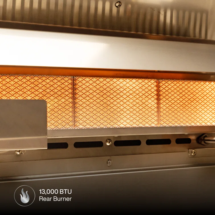 - 【VERSATILE REAR BURNER】The 13,000 BTU rear burner in this grill provides added cooking flexibility, perfect for rotisserie cooking or warming dishes. It ensures even heat distribution while allowing you to cook multiple items simultaneously.