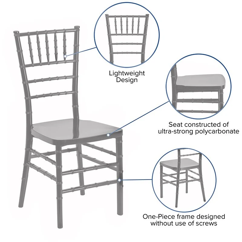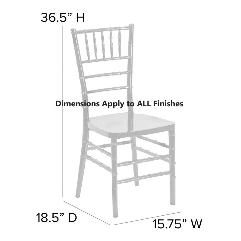 Elegance and sophistication are the hallmarks of the Chiavari style chair which has been used everywhere from Tuscany to the White House and is ideal for weddings, banquets and special events from casual to the most elaborate. Constructed of ultra-strong resin and polycarbonate materials, this chair is very lightweight, yet extremely strong and wobble-free. These beautiful resin chairs ship fully assembled and can be stacked 8 high for storage. With its durable, lightweight construction and elegant styling, this Chiavari Chair will be the prime seating choice for all of your special events, whether indoors or outside.