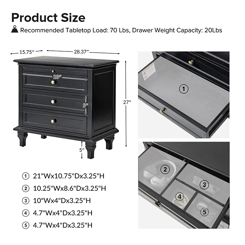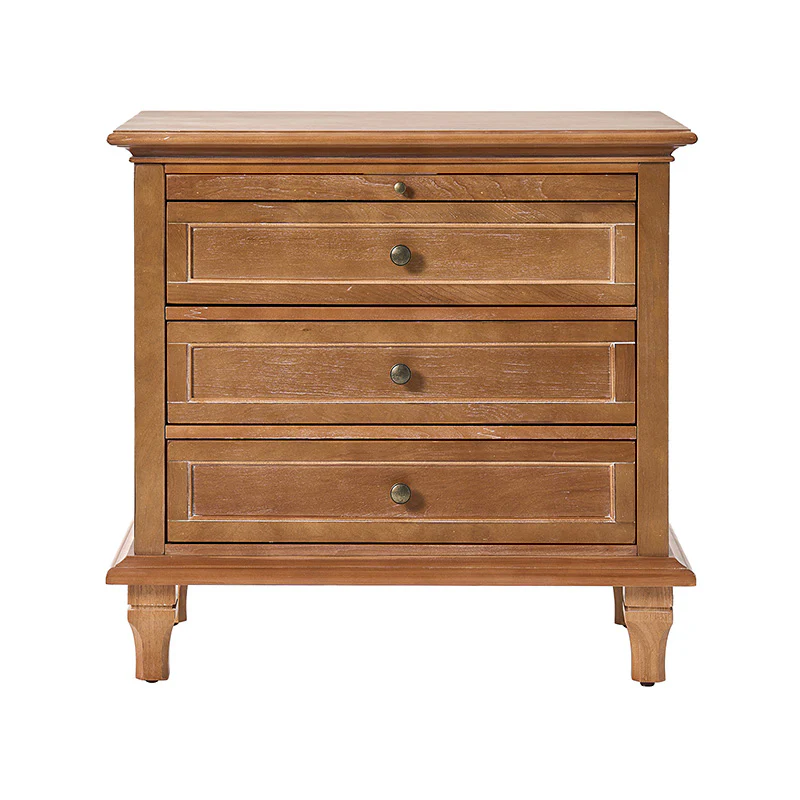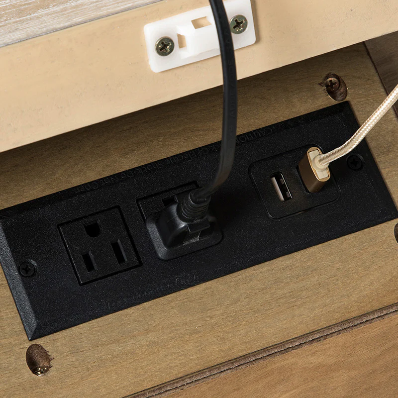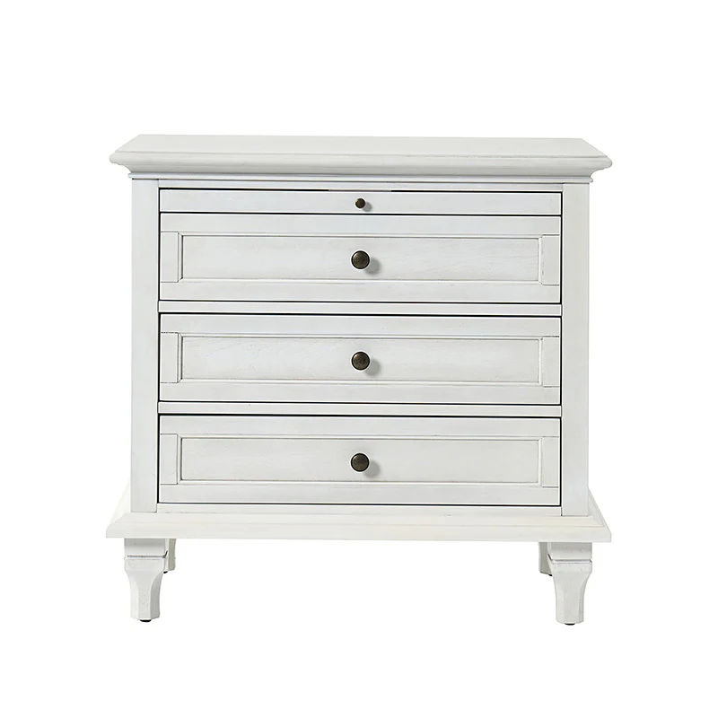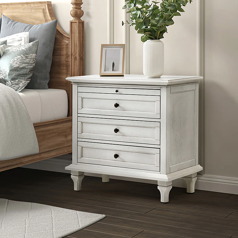 Immerse your space in rustic charm with the farmhouse and traditional nightstand. Crafted to harmonize seamlessly with classic interiors, this piece boasts an integrated charging station discreetly nestled within its design. The thoughtfully included pull-out shelf offers an extra surface area for nightly essentials or a cozy reading corner. The nightstand is supported by sturdy wood legs, evoking a timeless farmhouse aesthetic. With three drawers, you'll find ample storage to keep your haven organized. Enhancing functionality, a dedicated drawer organizer ensures tidiness for smaller items. Elevate your bedroom with this exquisite fusion of tradition and practicality, embodying both style and convenience.